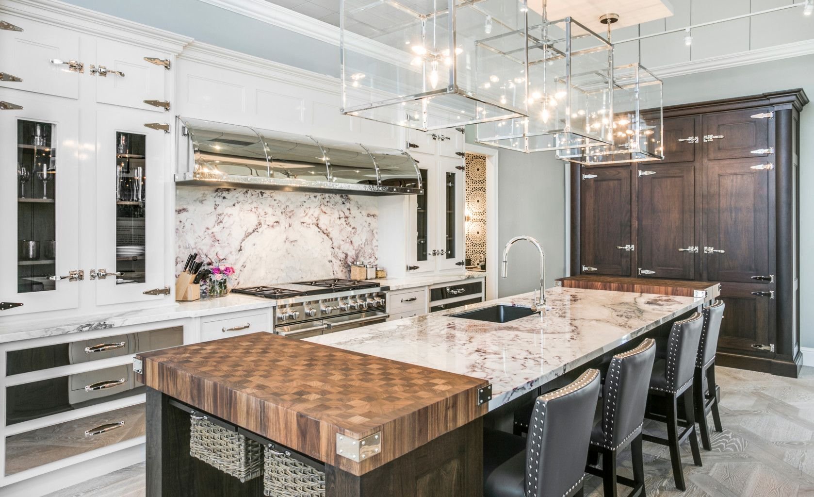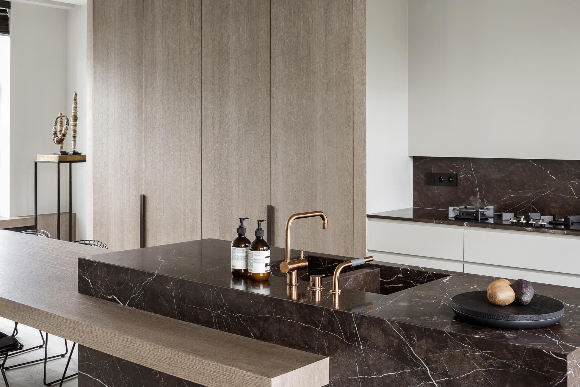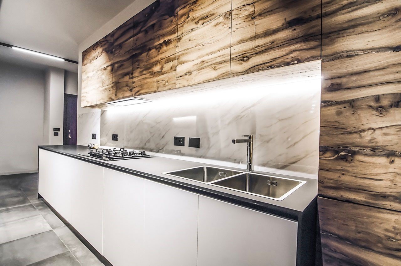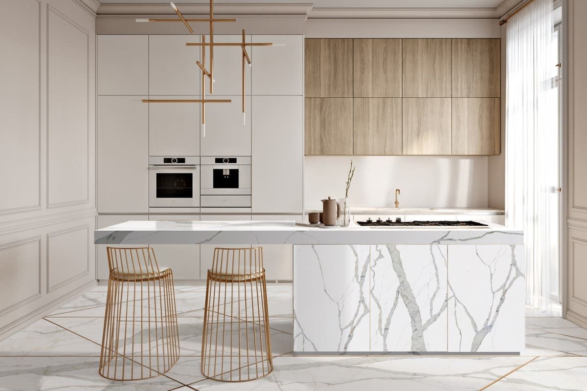 Мрамор и дерево в интерьере кухни