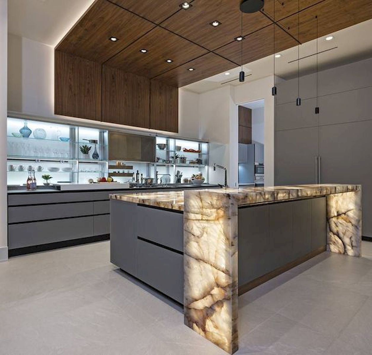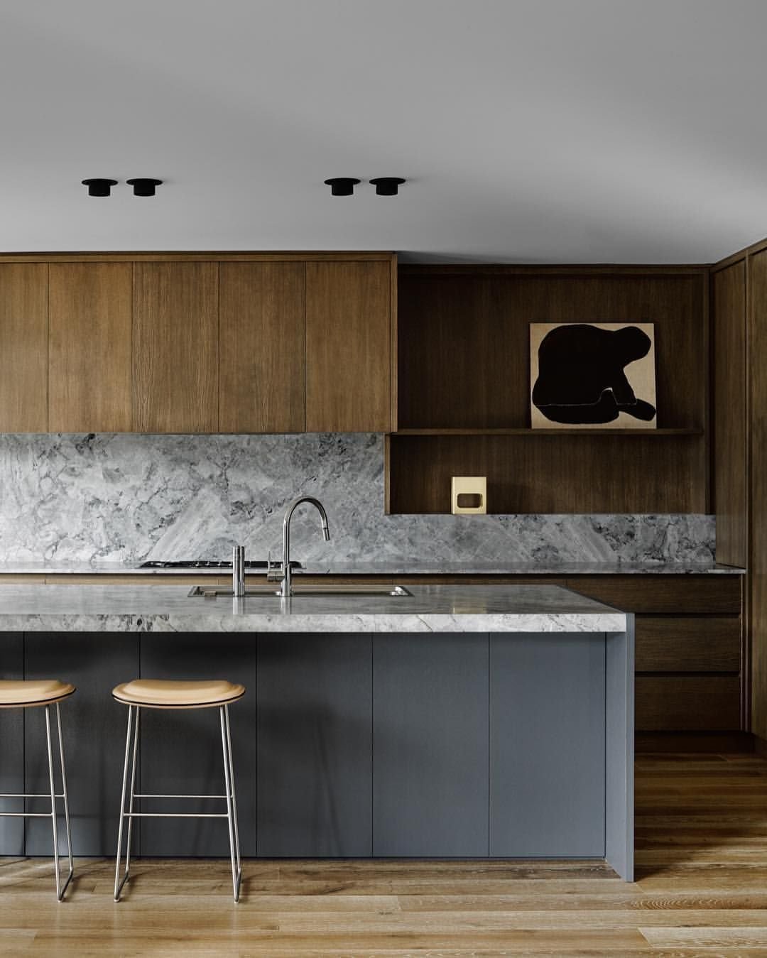 Серый мрамор и дерево в интерьере кухни