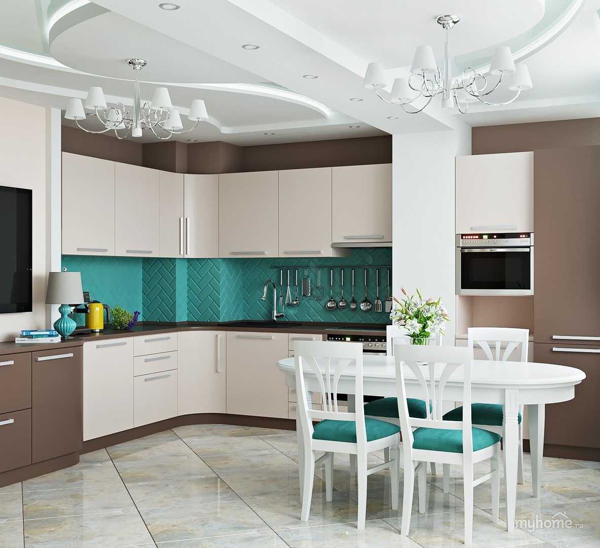 Кухня в бирюзово бежевом цвете