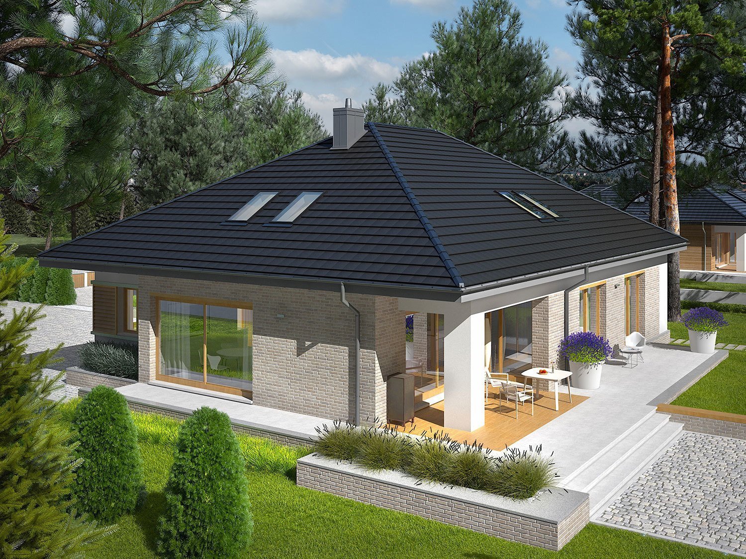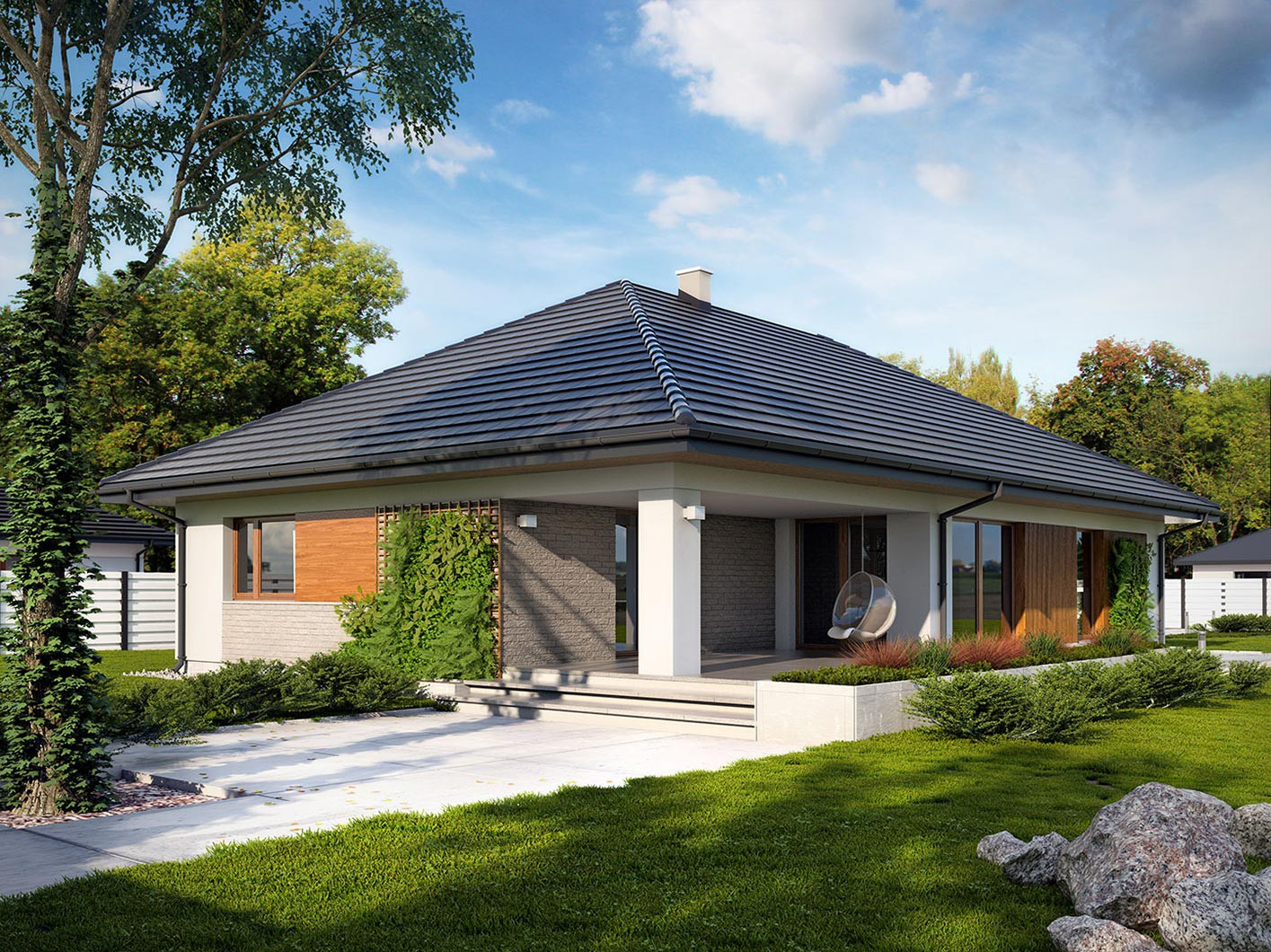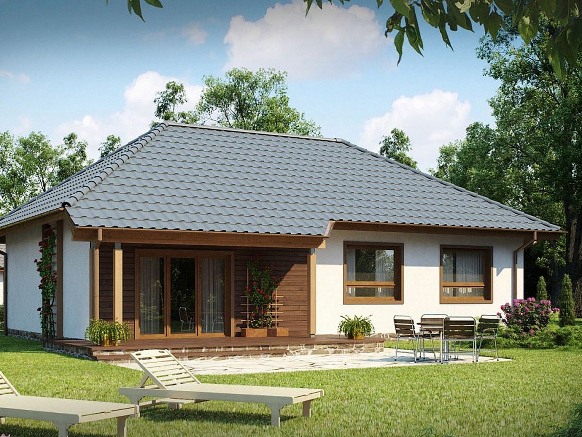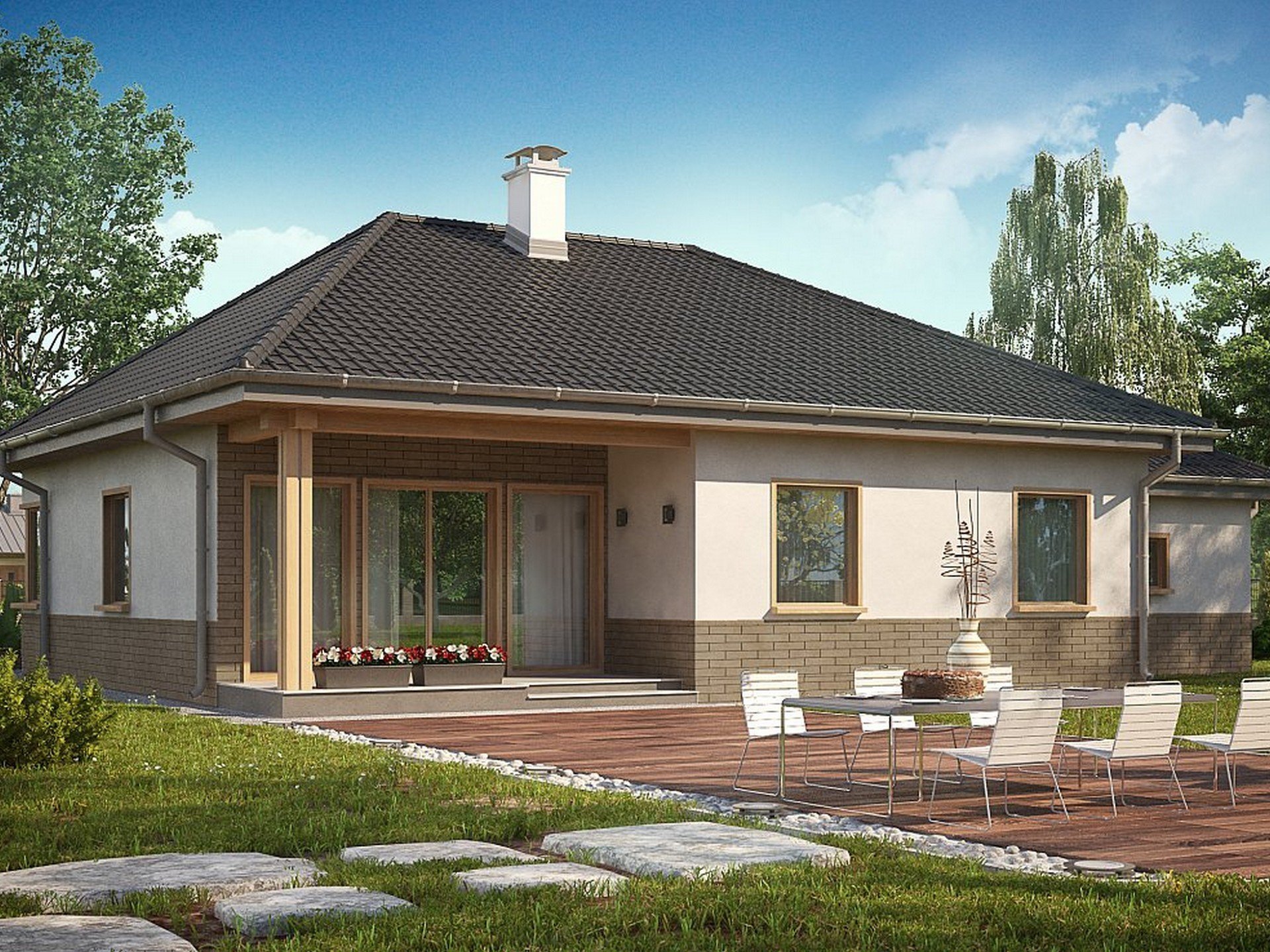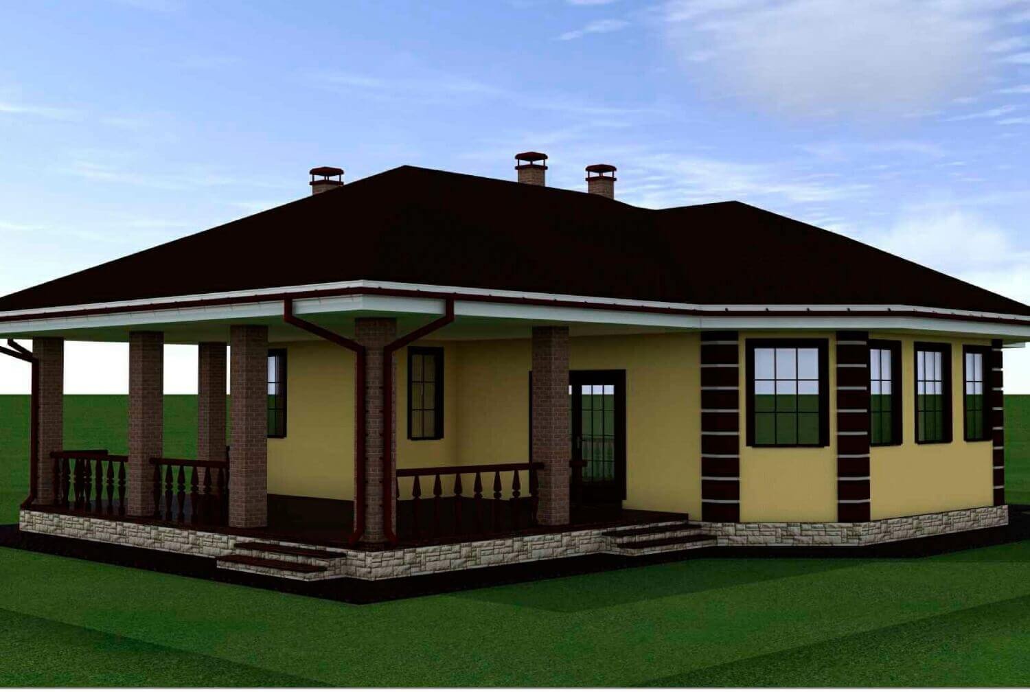 Одноэтажные дома с вальмовой крышей и террасой