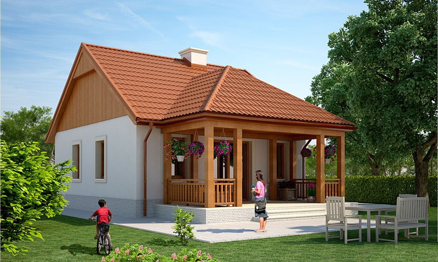 Одноэтажный дом с двускатной крышей и верандой