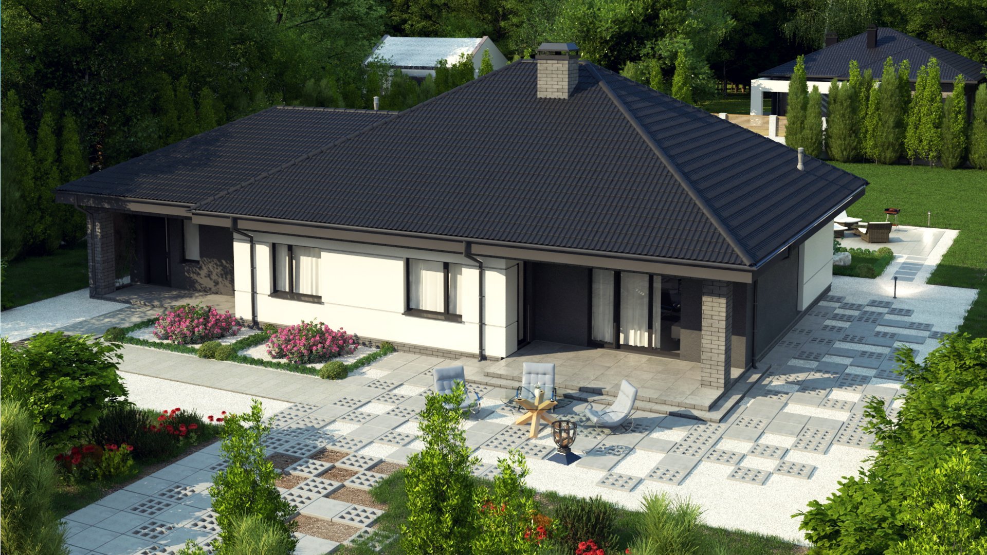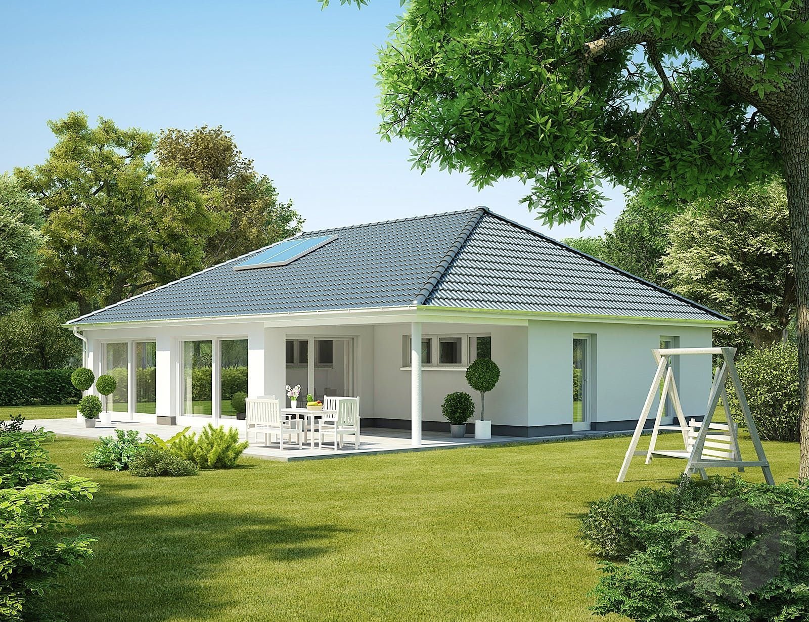 Одноэтажный белый дом с четырехскатной крышей