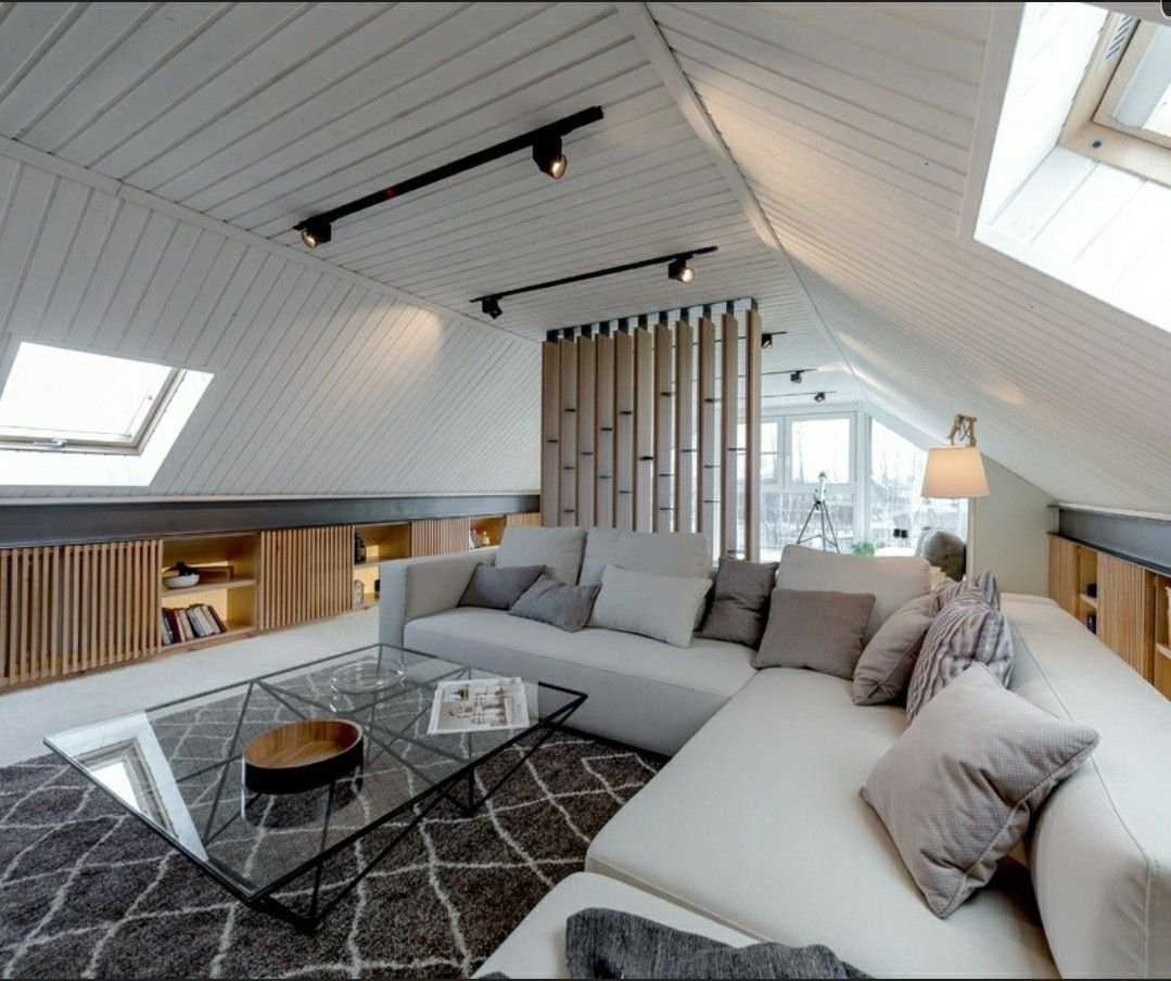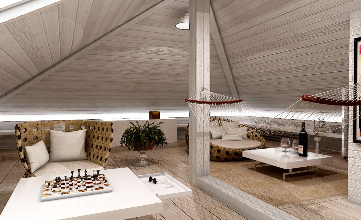 Интерьер мансарды с четырехскатной крышей