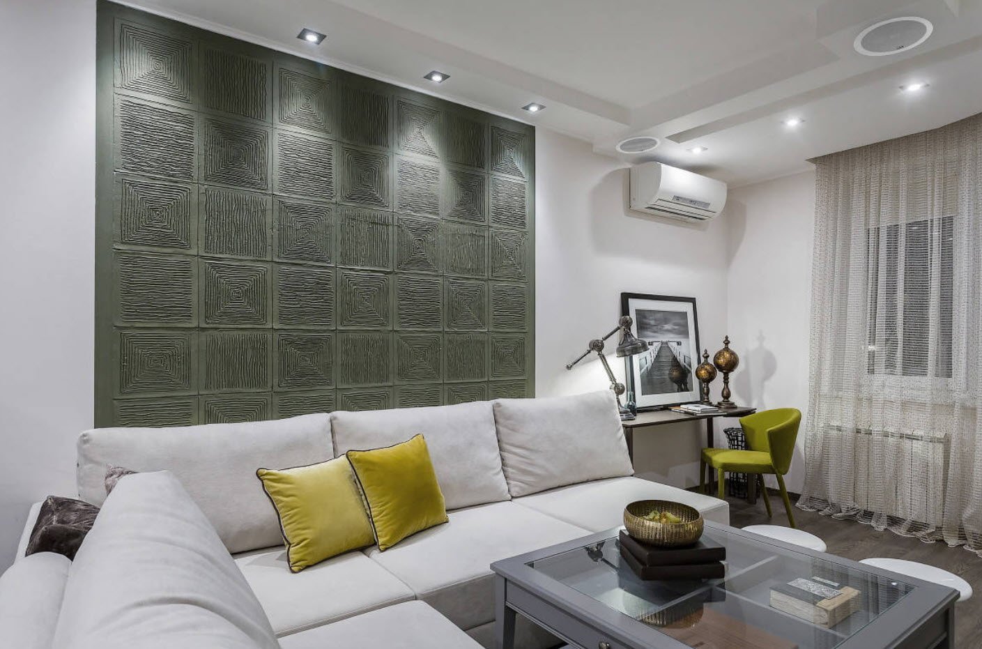 Зеркальное панно в гостиной за диваном