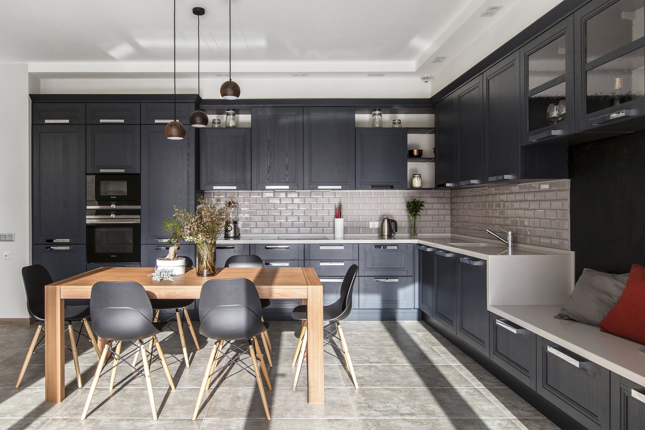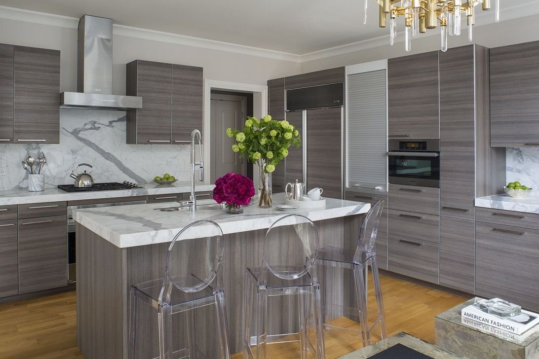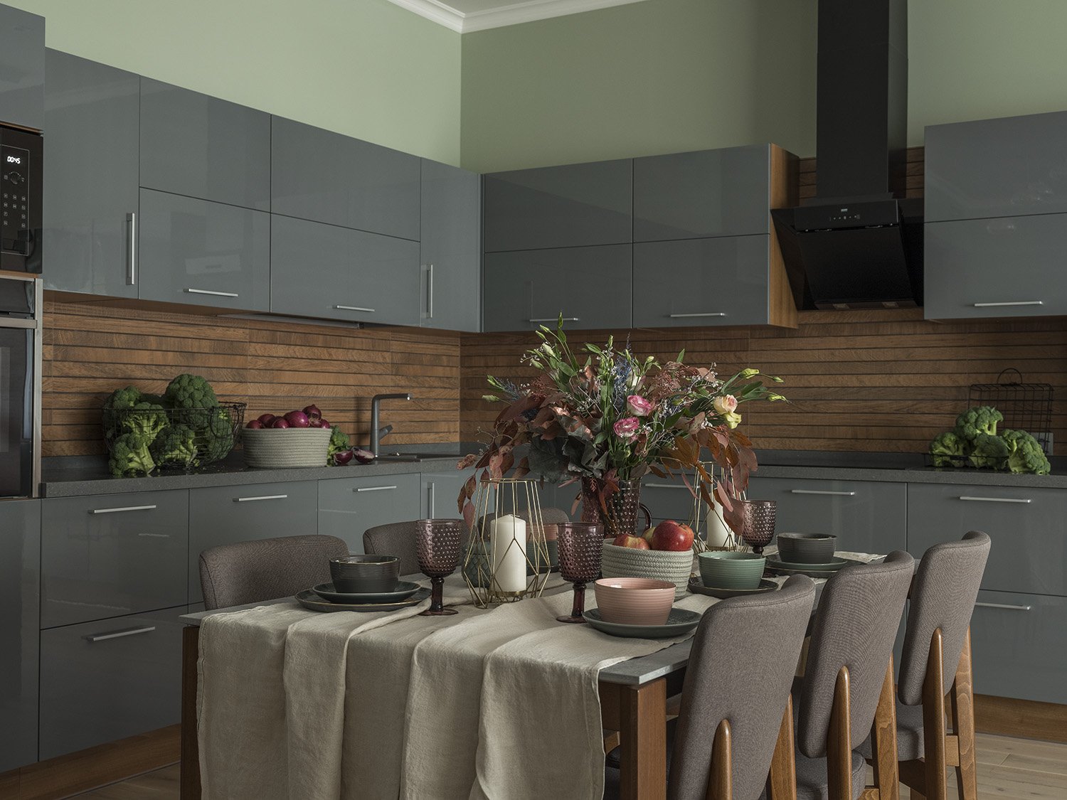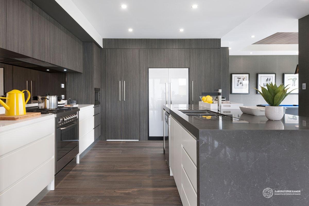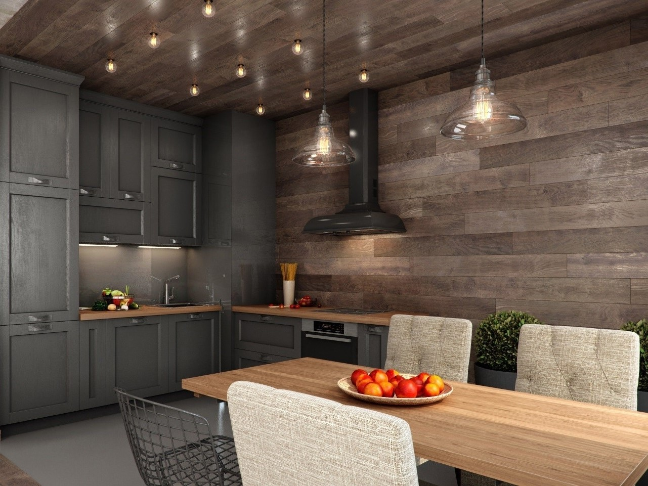 Интерьеры кухонной комнаты в серо- коричневых тонах