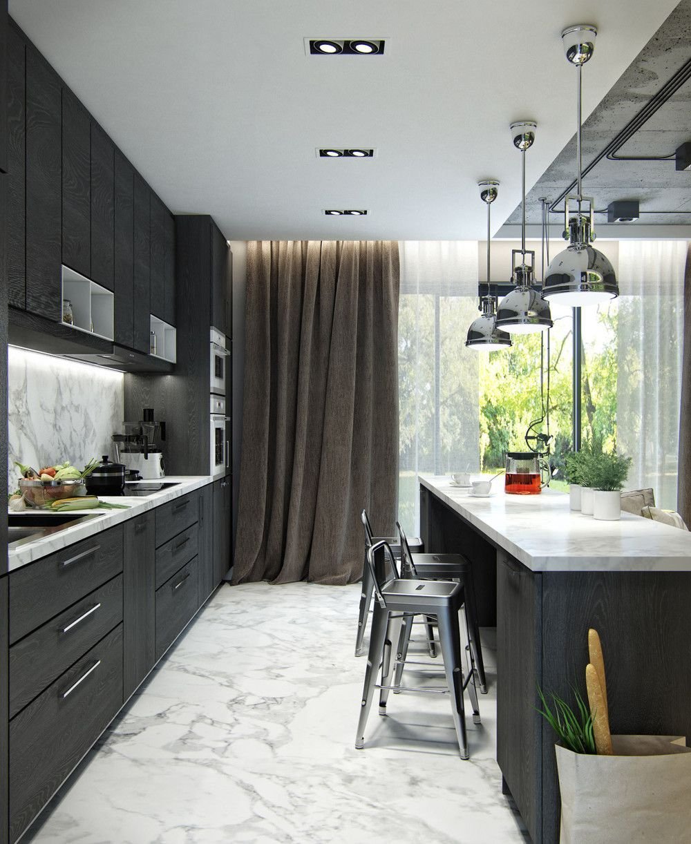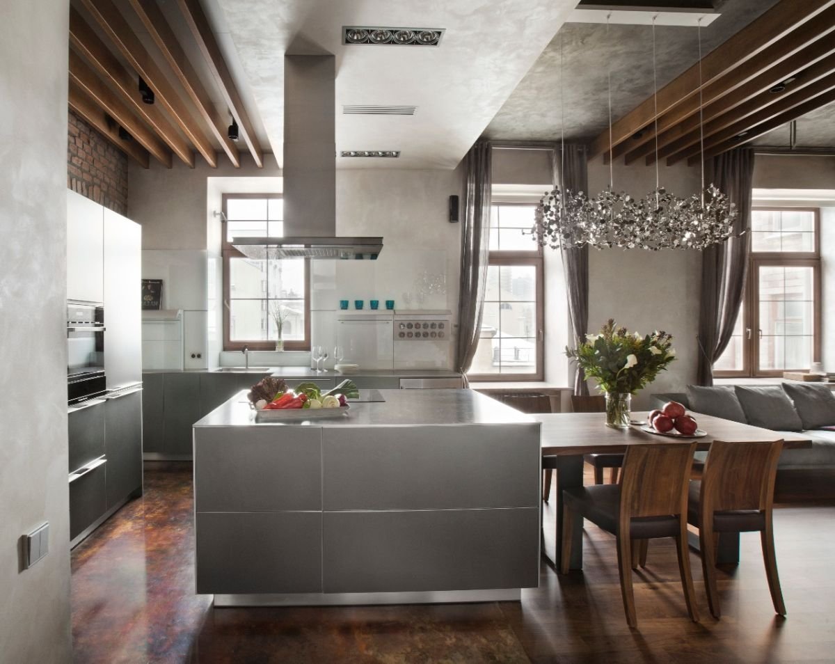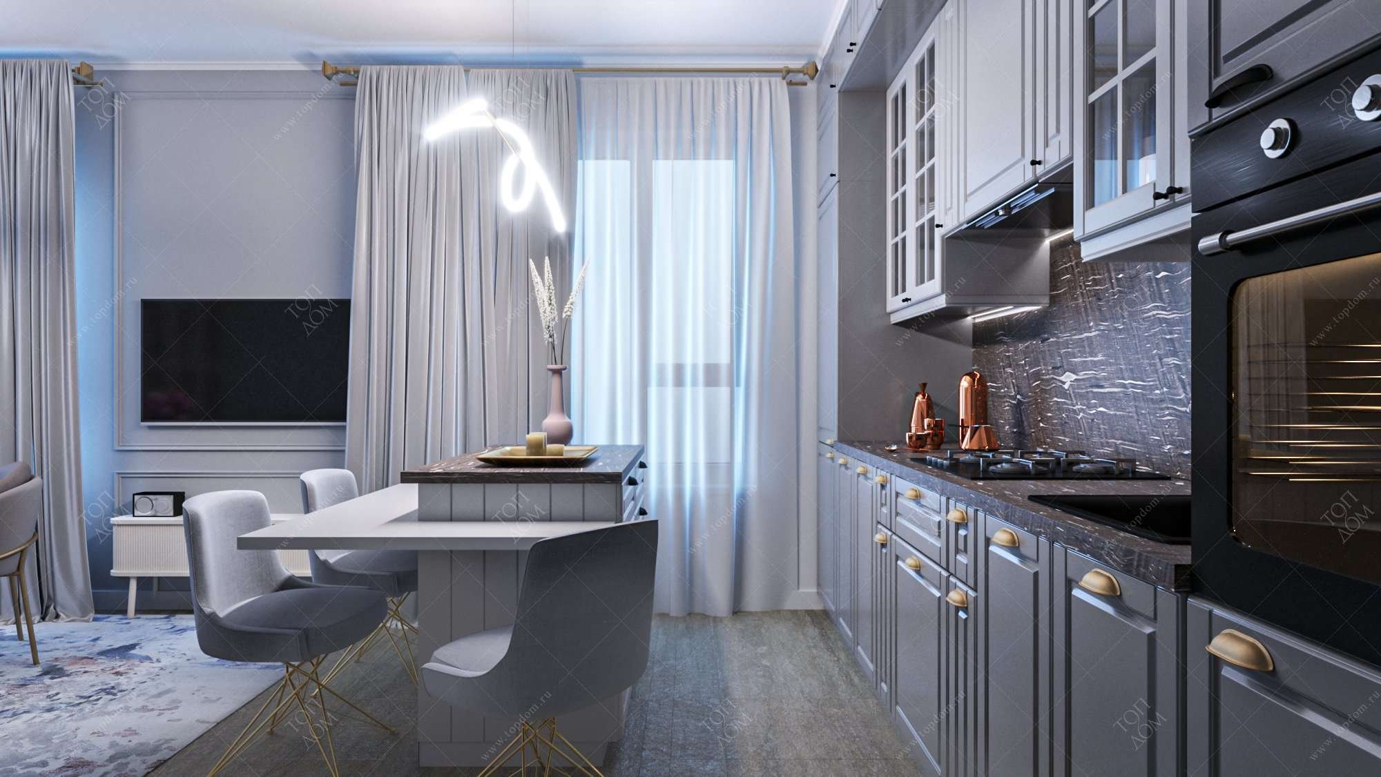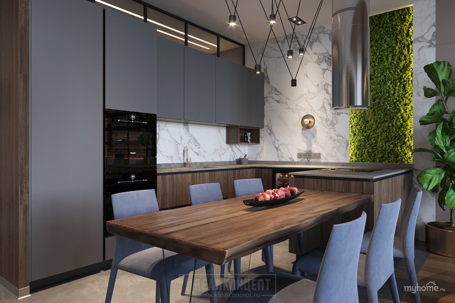 Интерьеры кухонной комнаты в серо- коричневых тонах