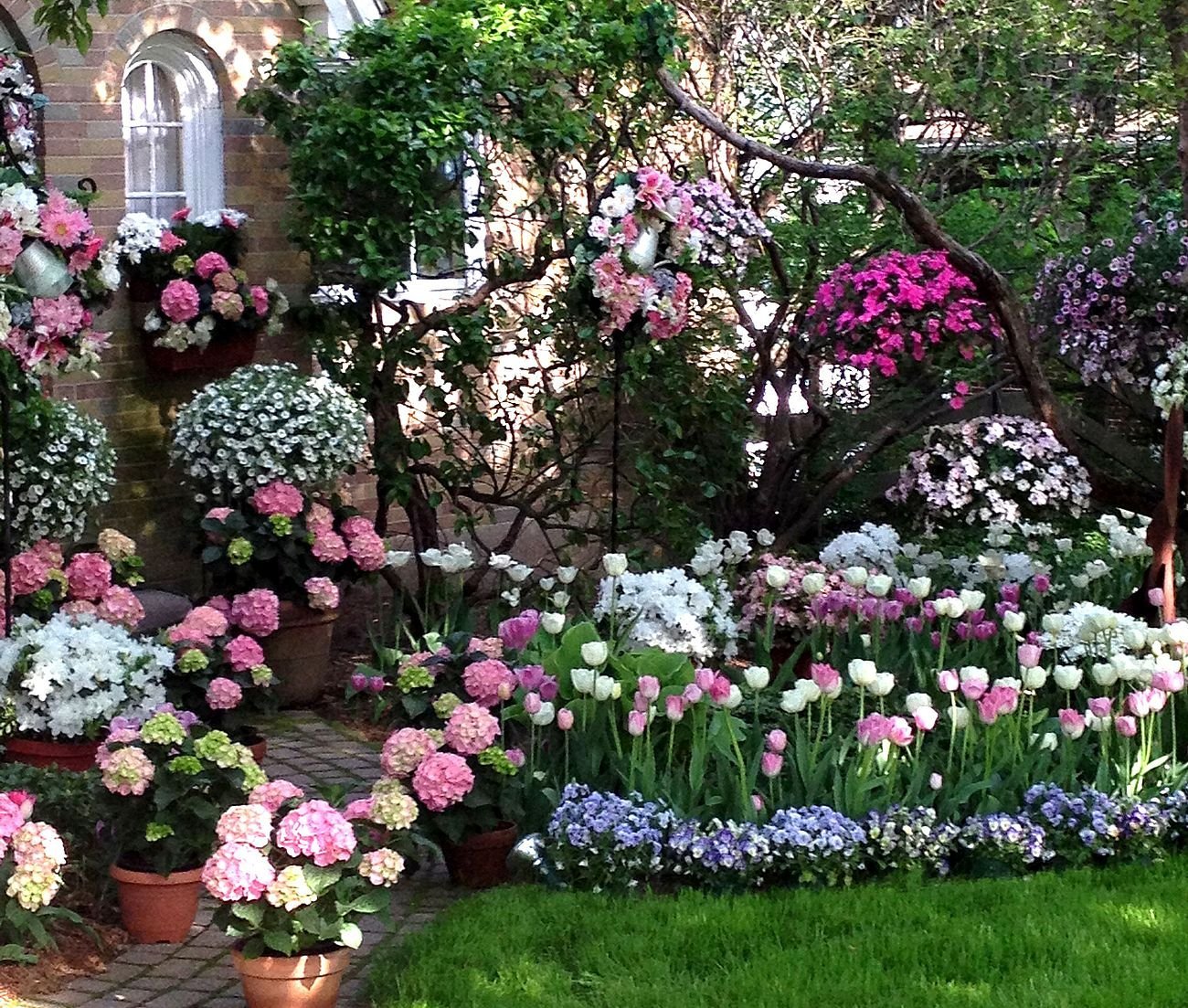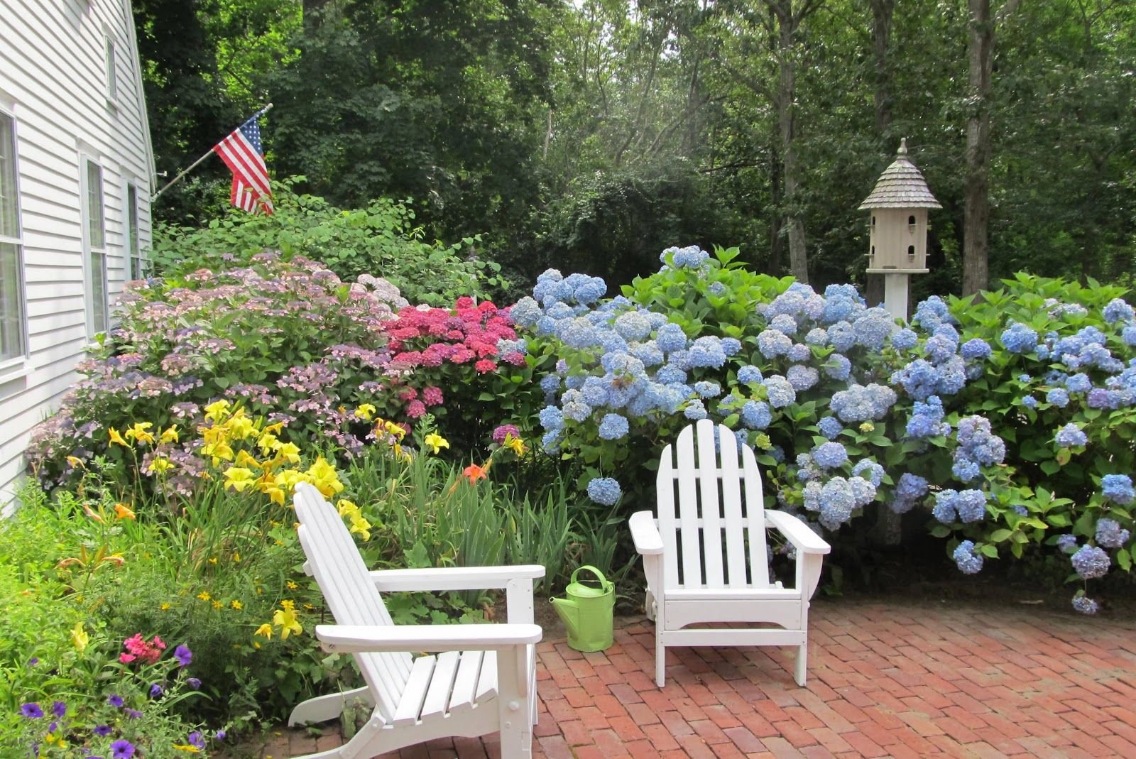 Цветник с гортензией и пионами