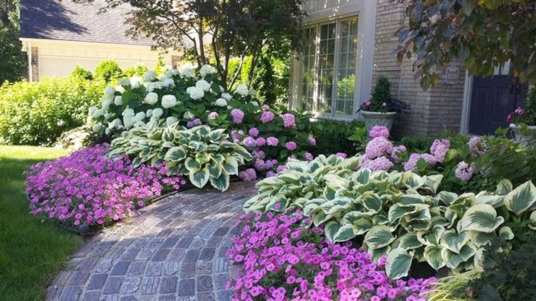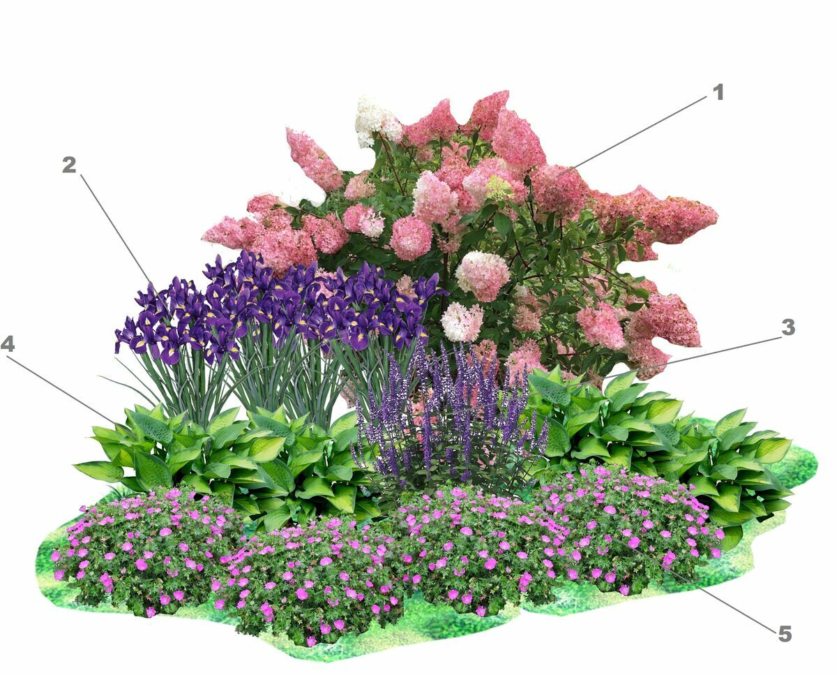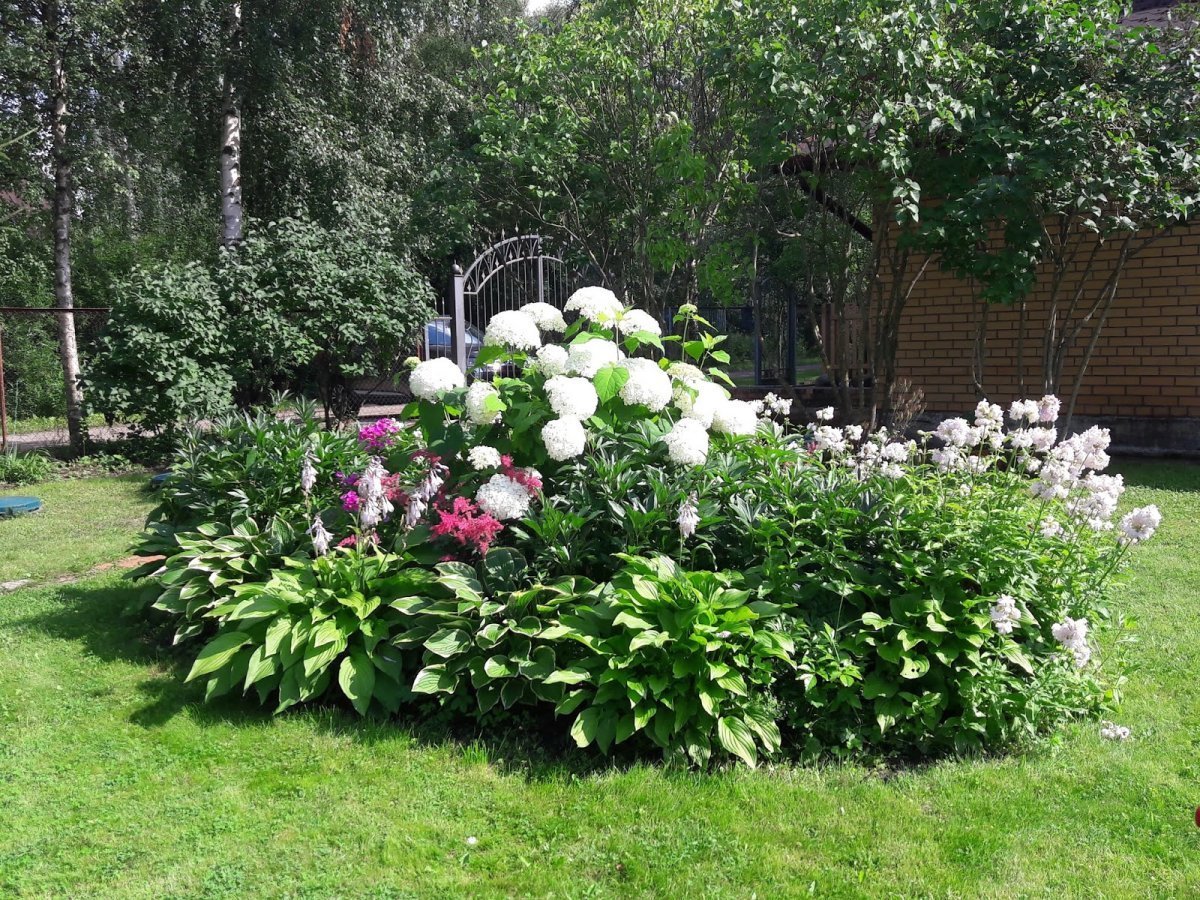 Клумба с гортензией и хостой
