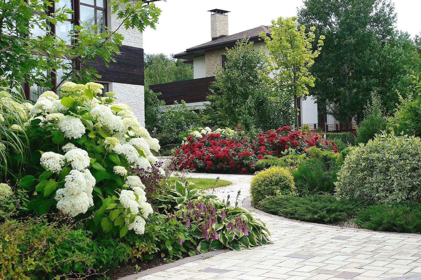 Березы и гортензии в ландшафте