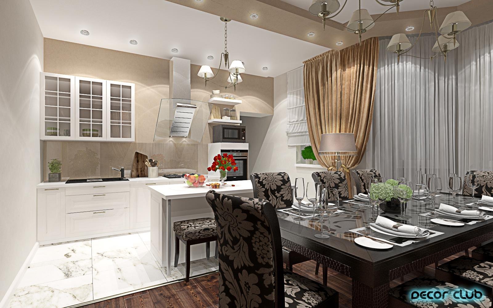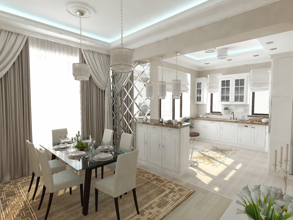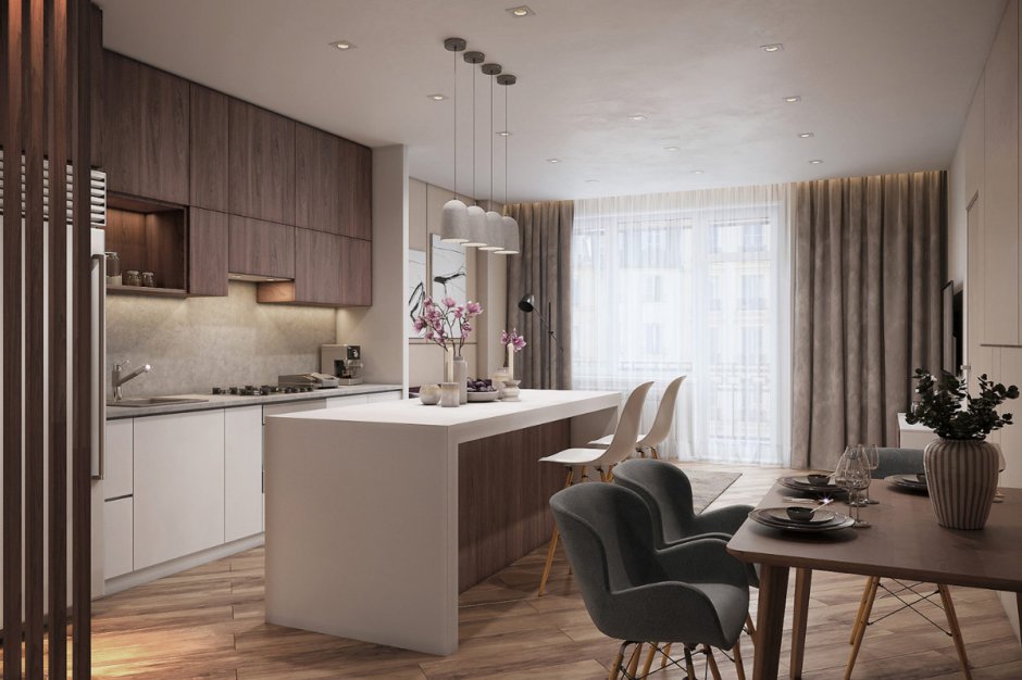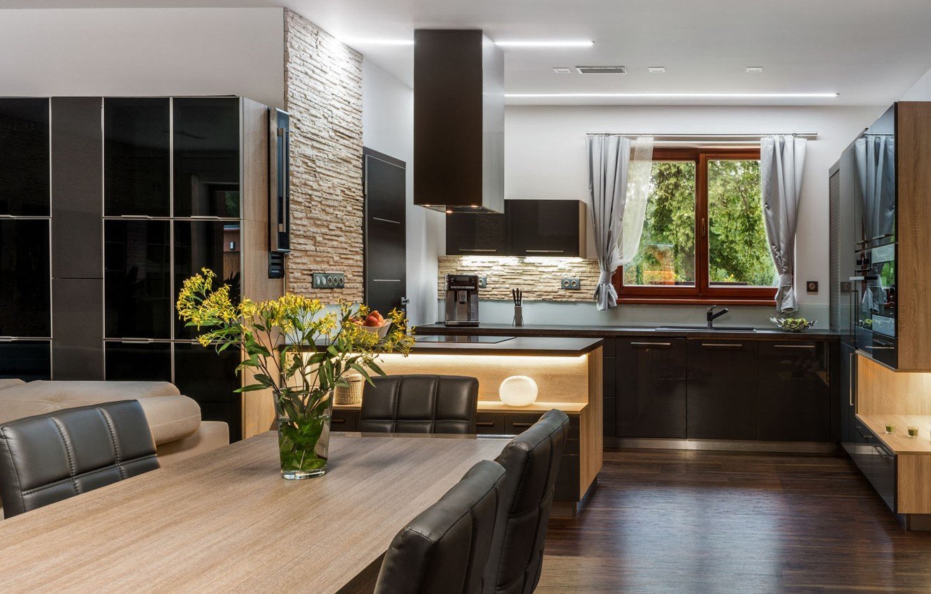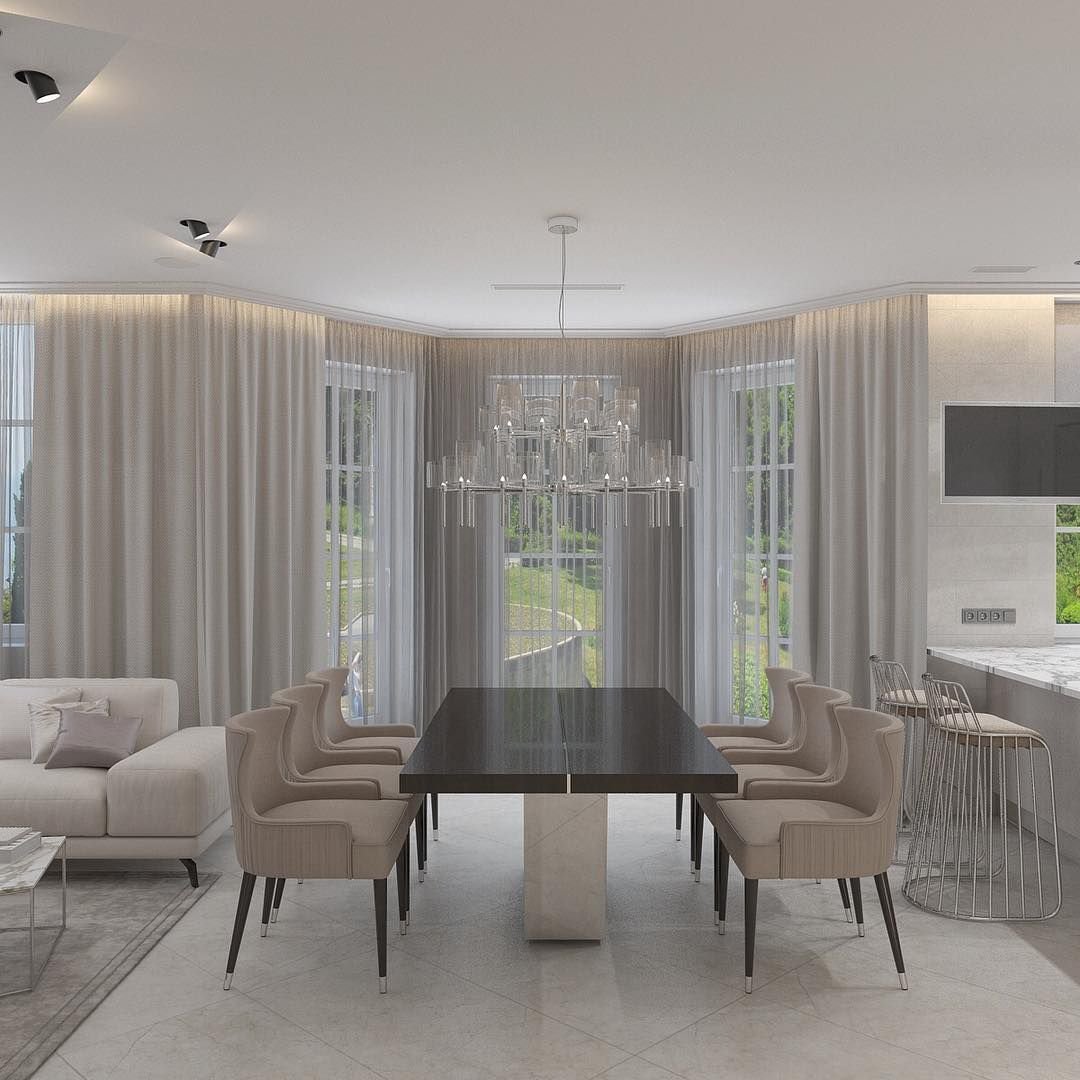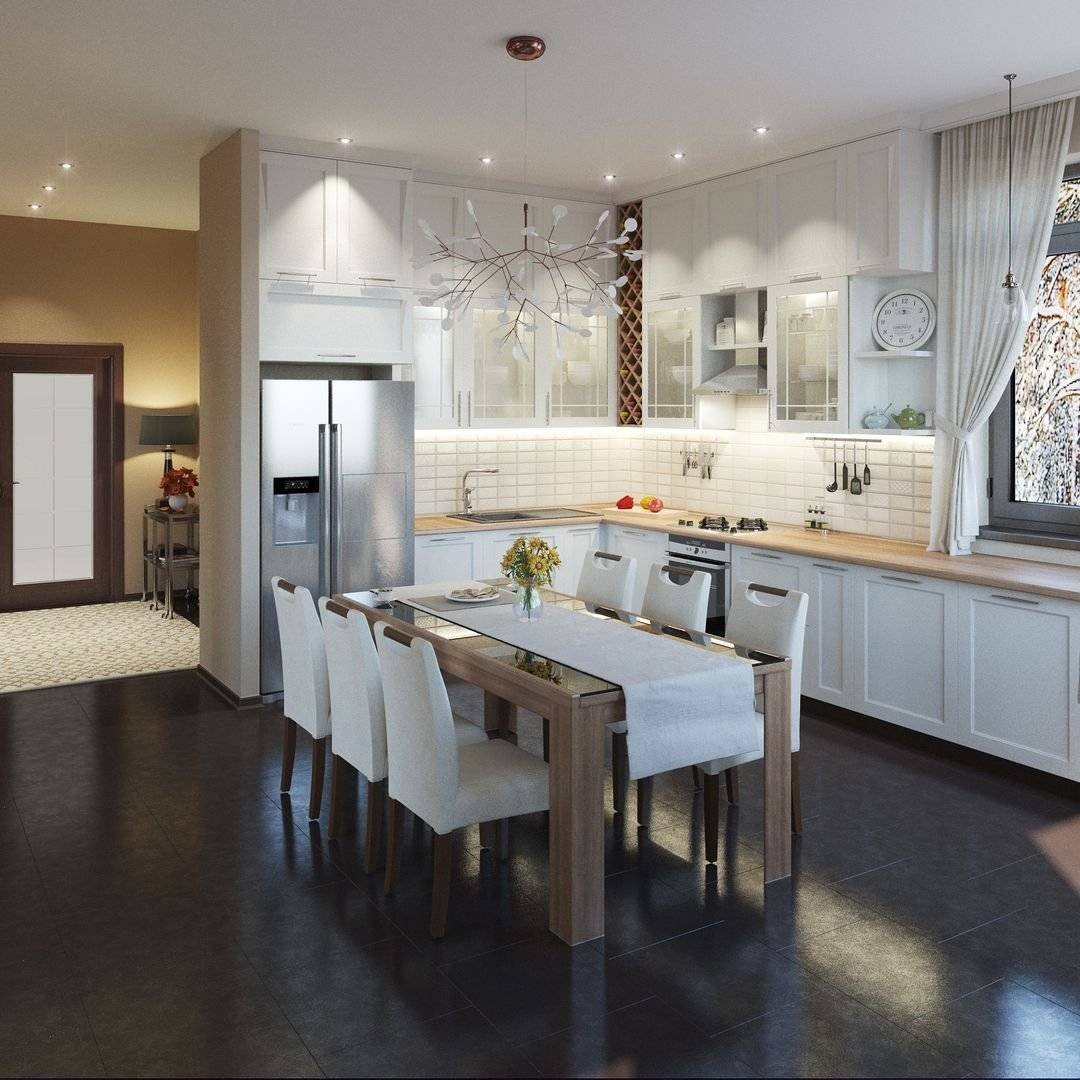 Кухня совмещенная с гостиной в частном доме с большими окнами