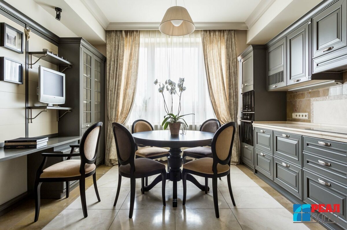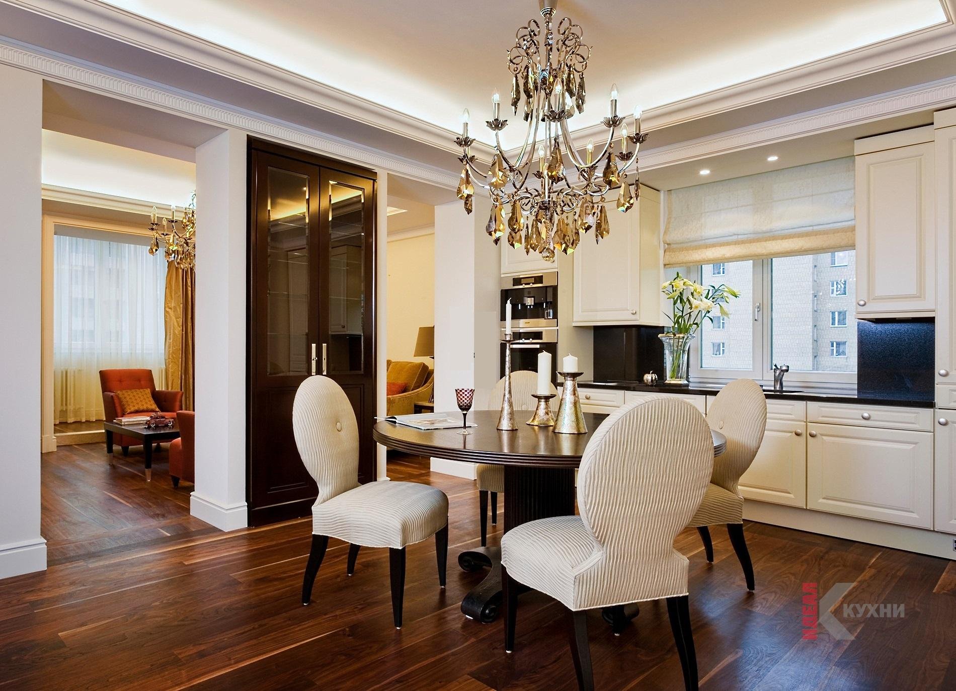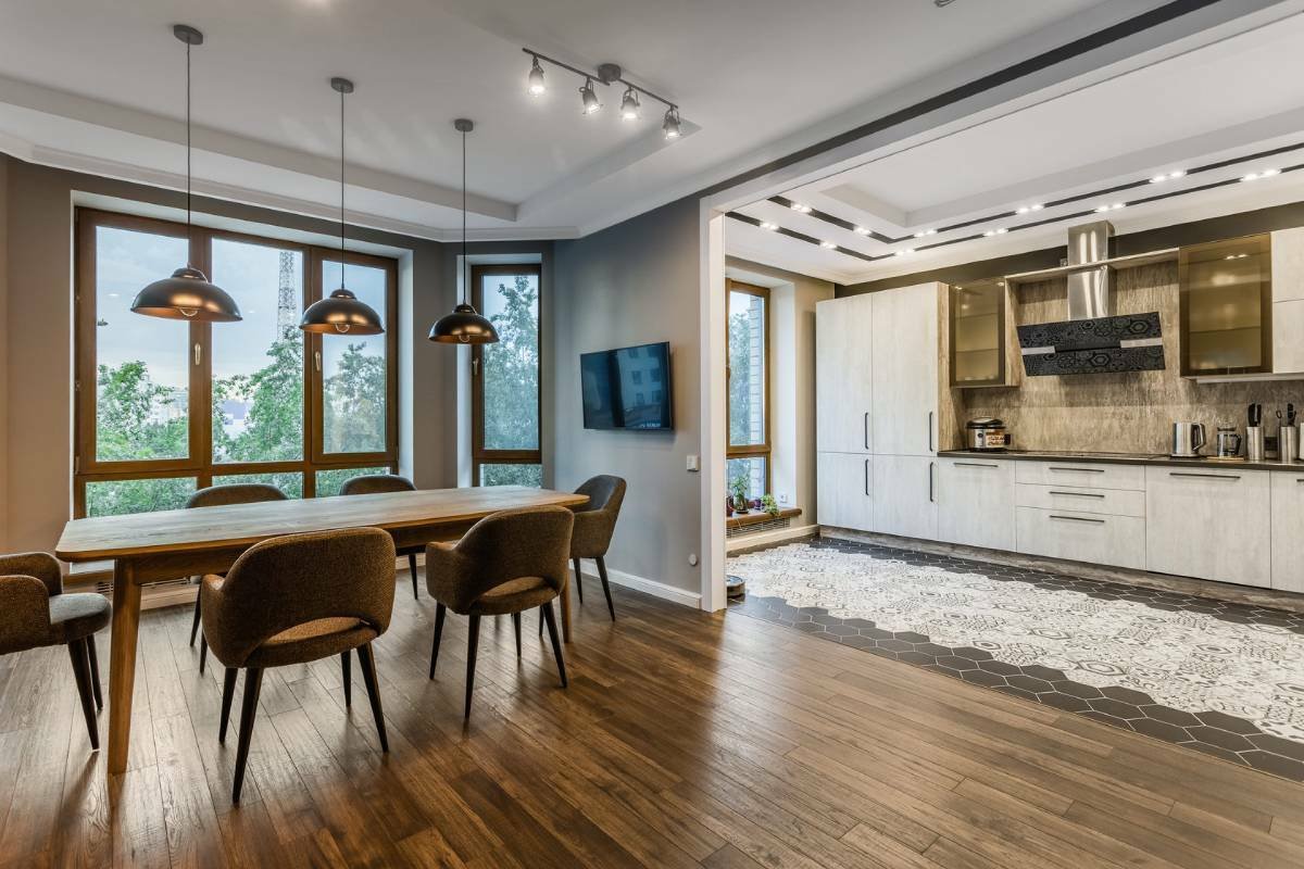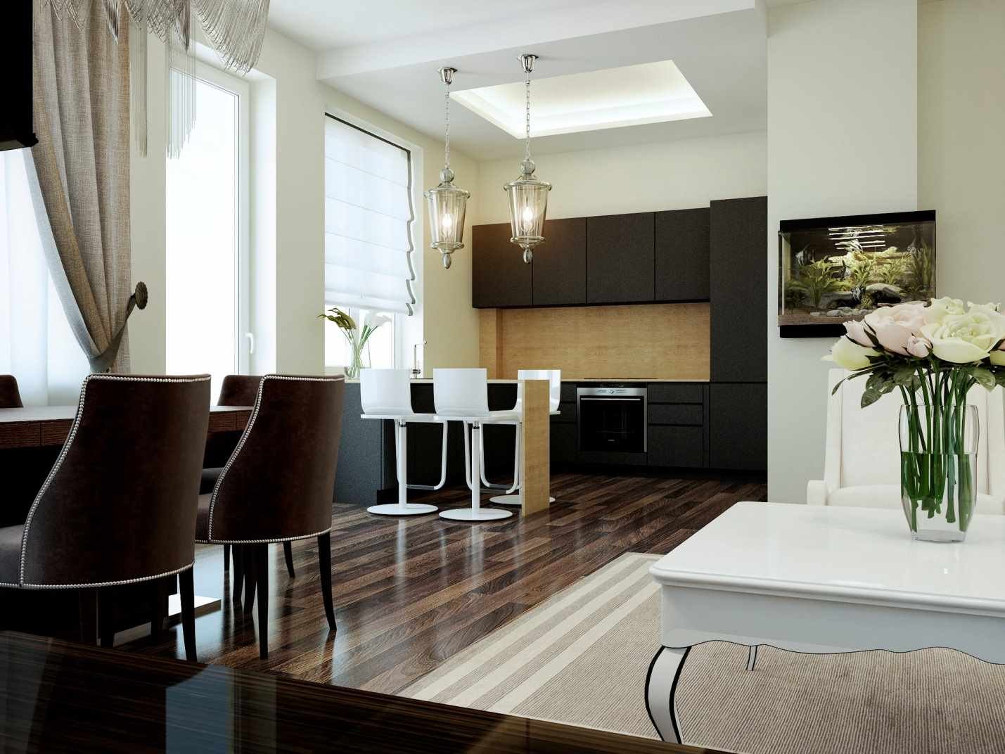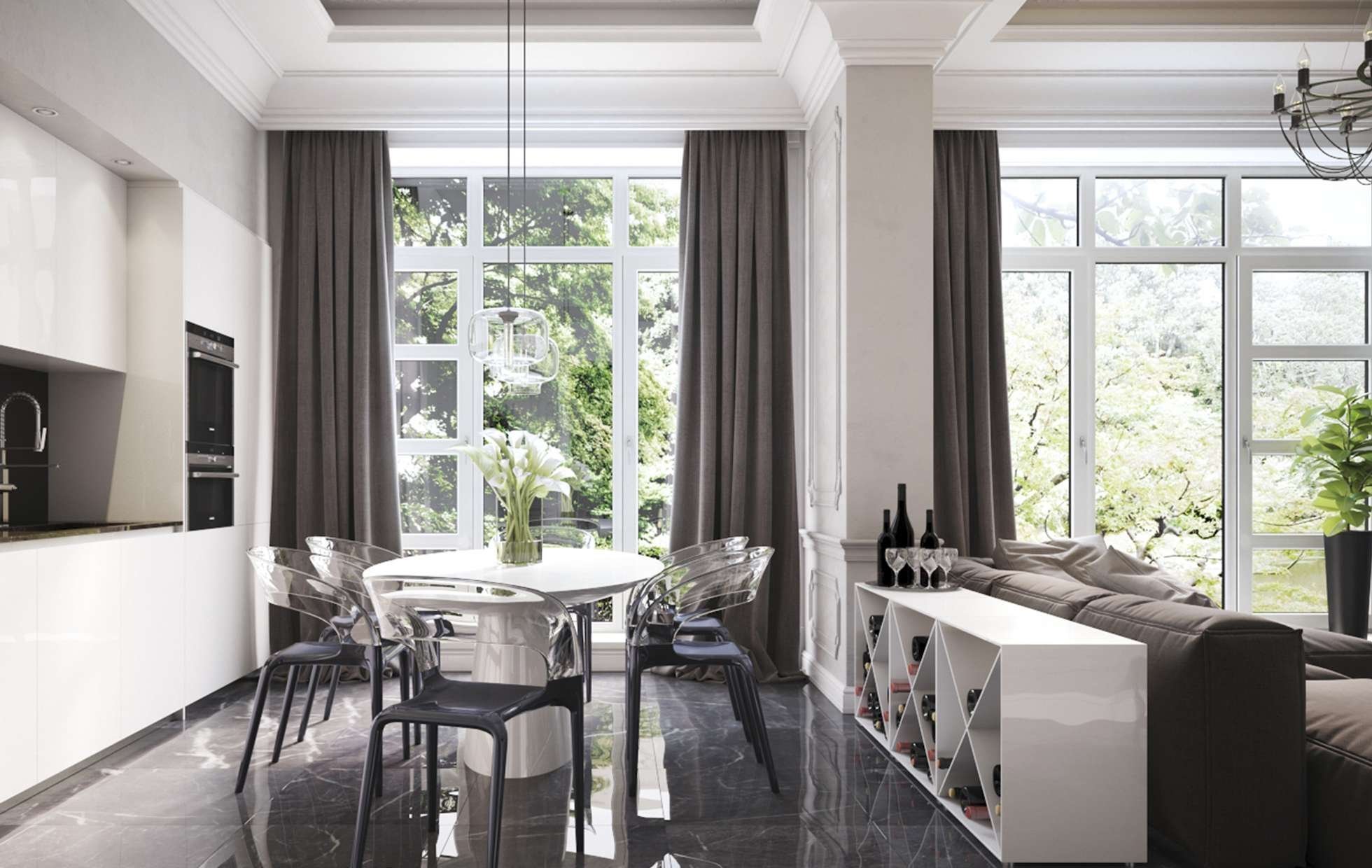 Кухня совмещенная с гостиной в частном доме с большими окнами