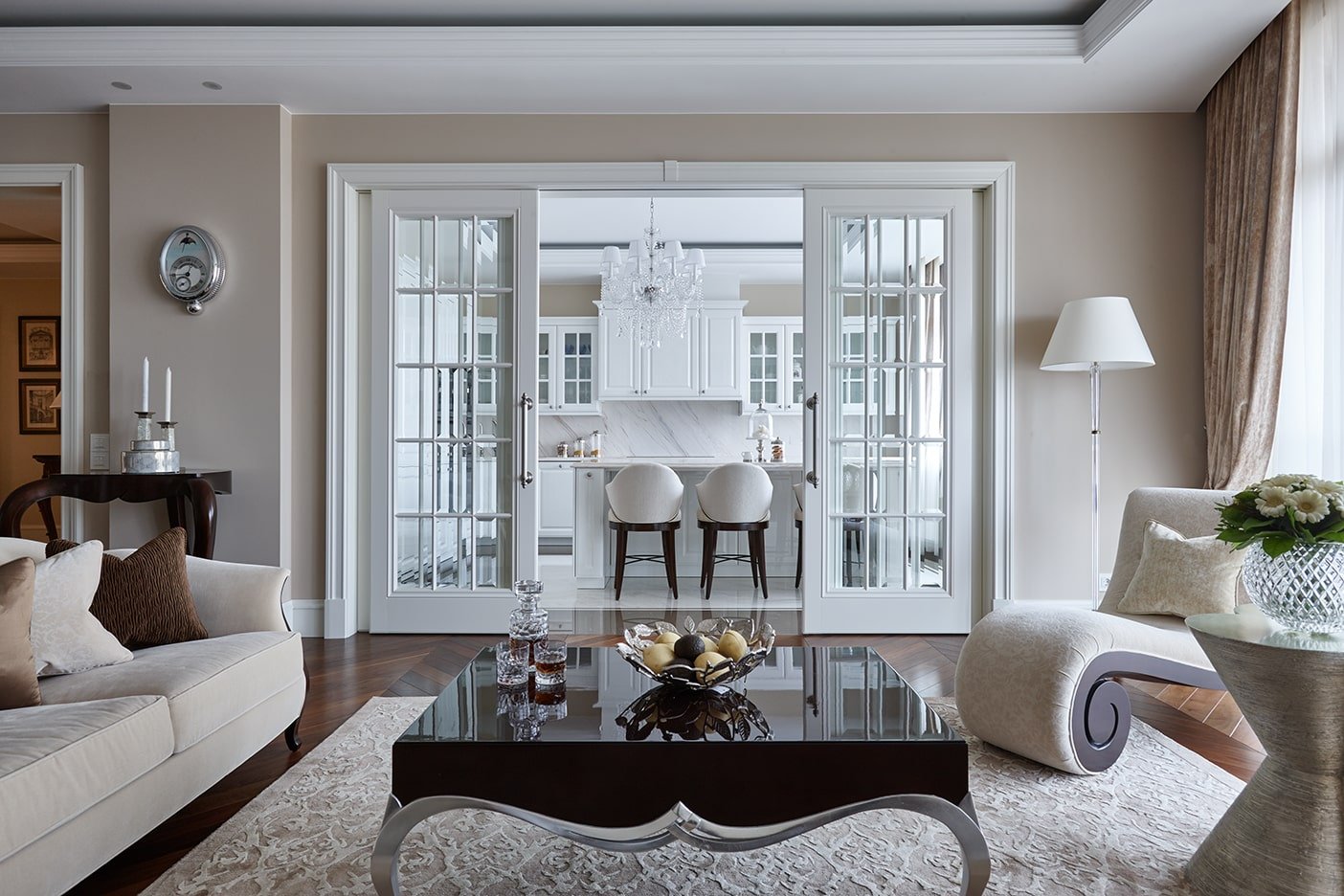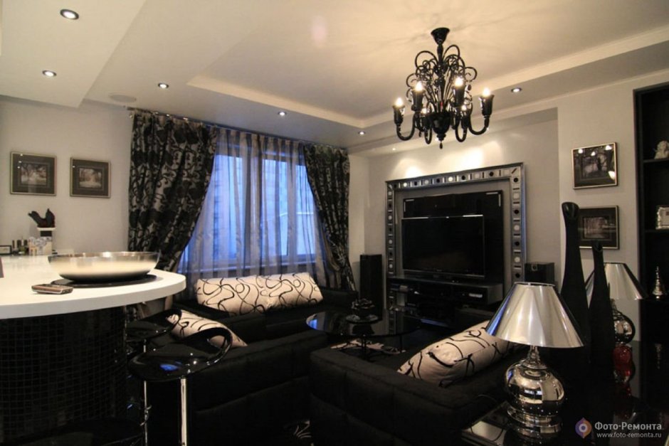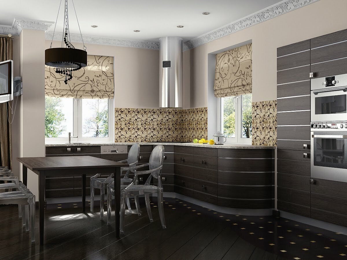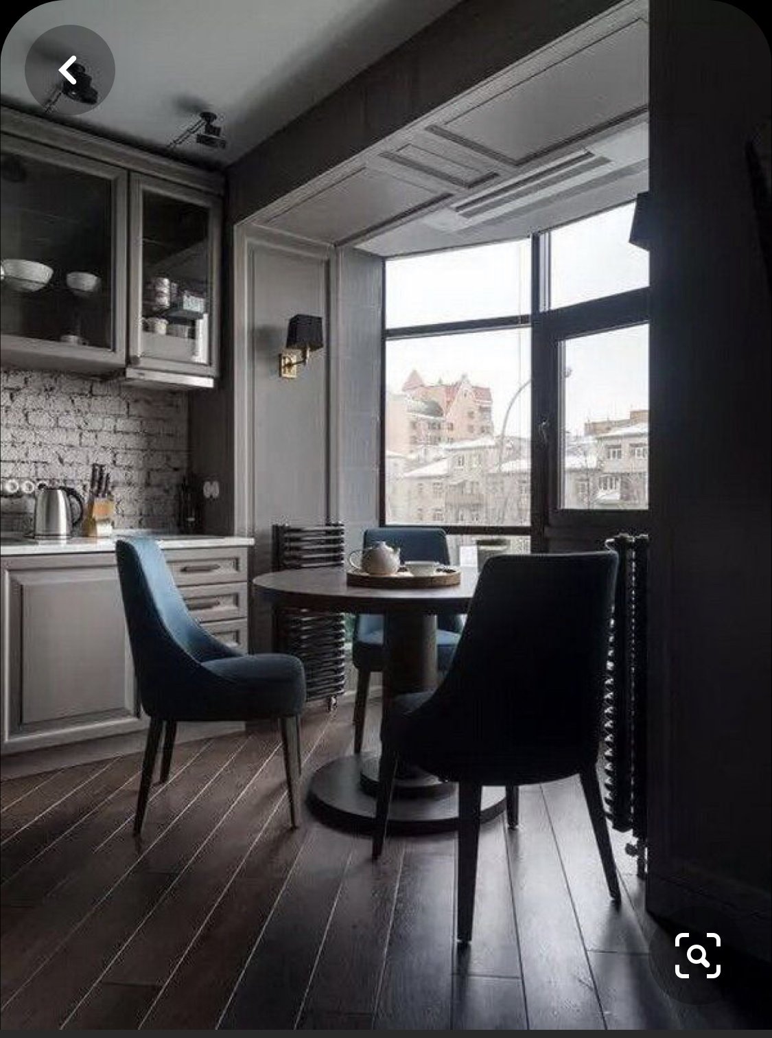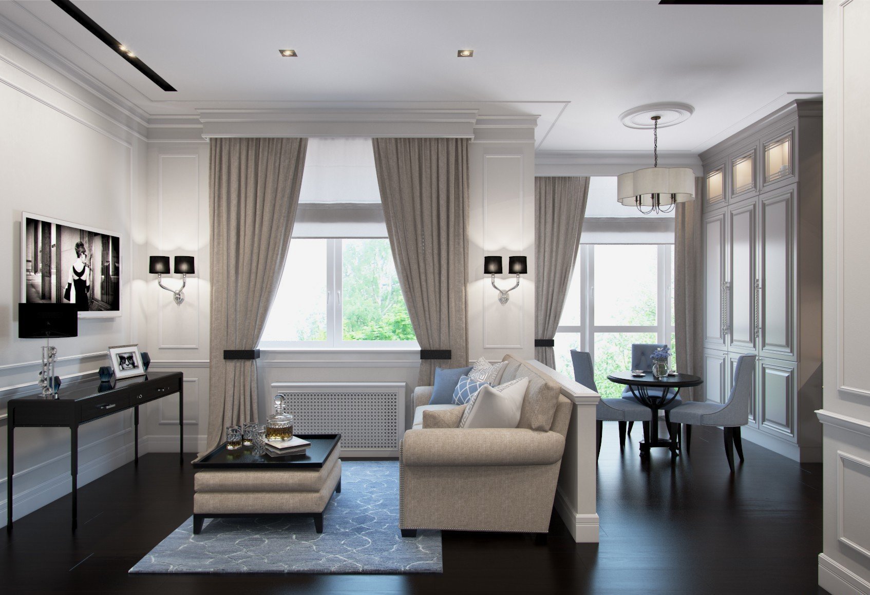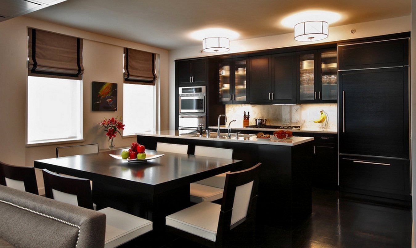 Кухня совмещенная с гостиной в частном доме с большими окнами