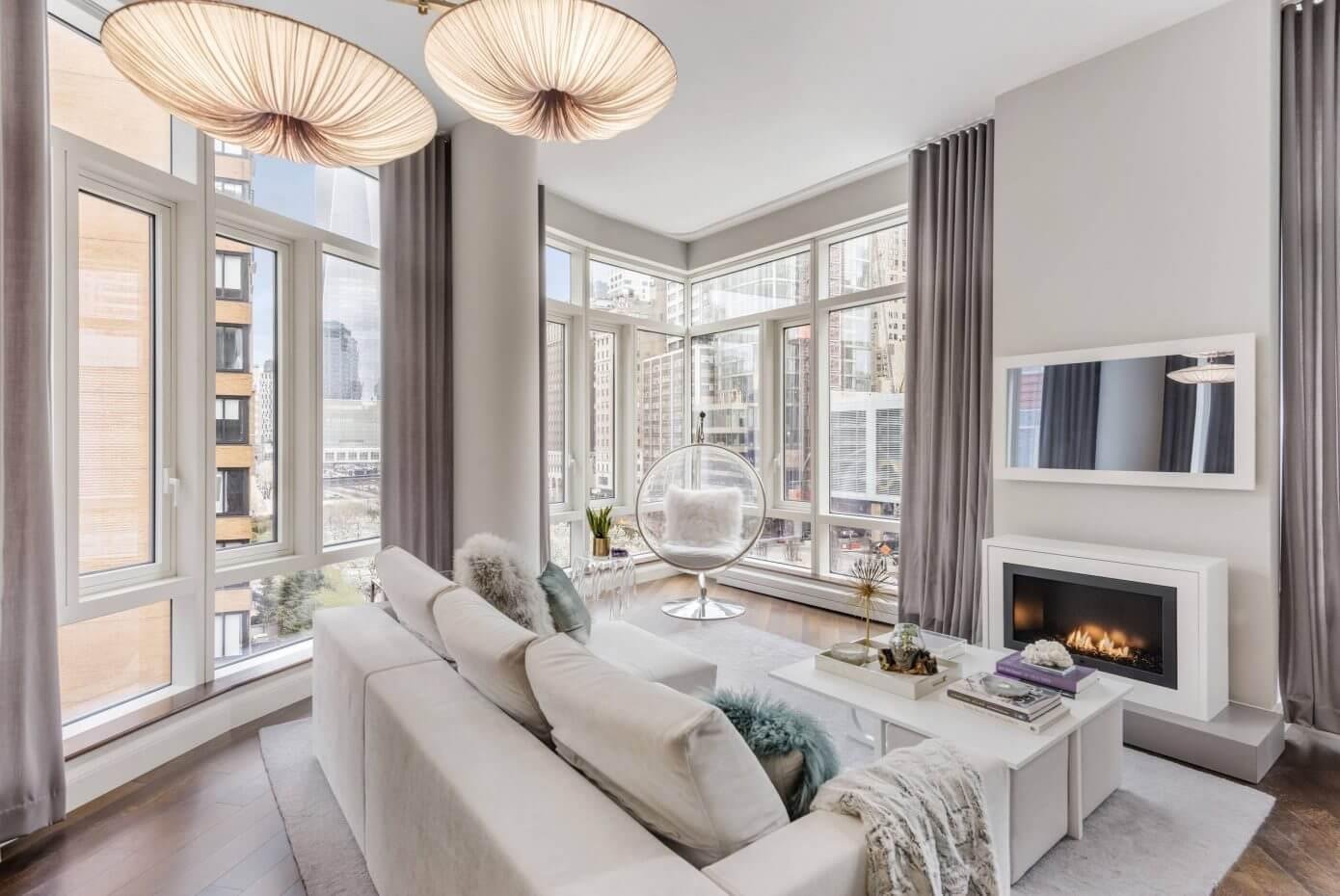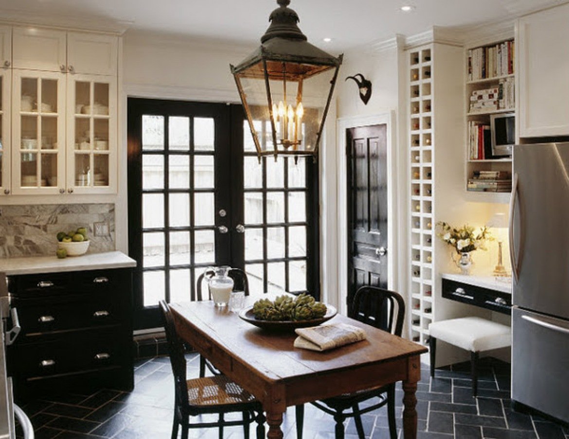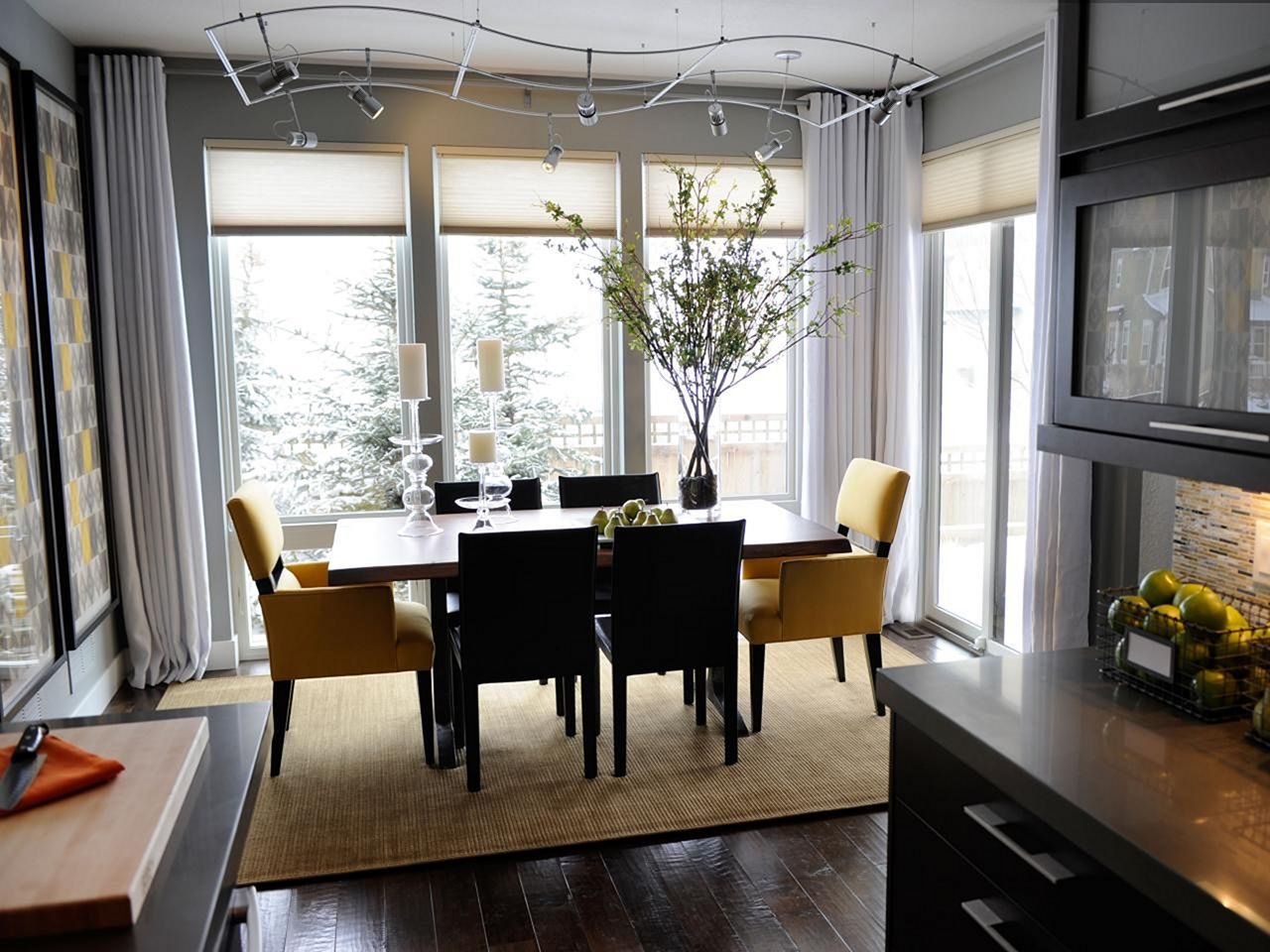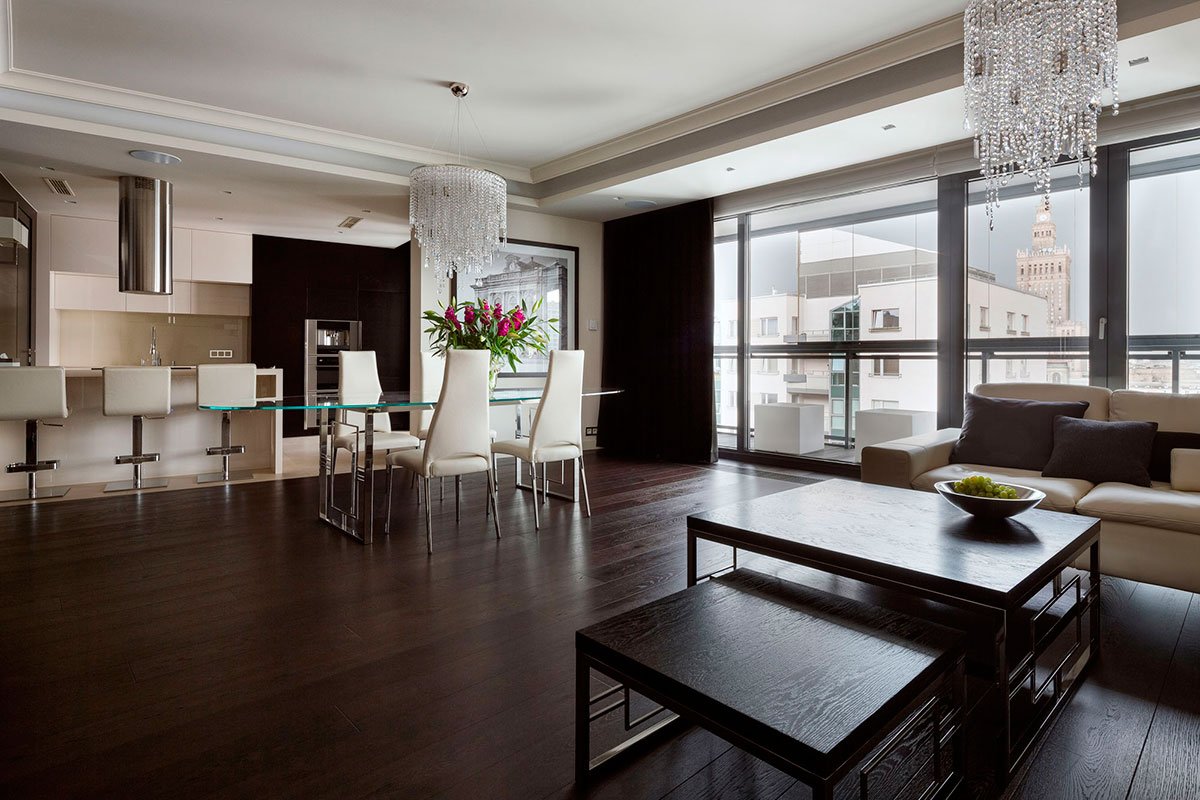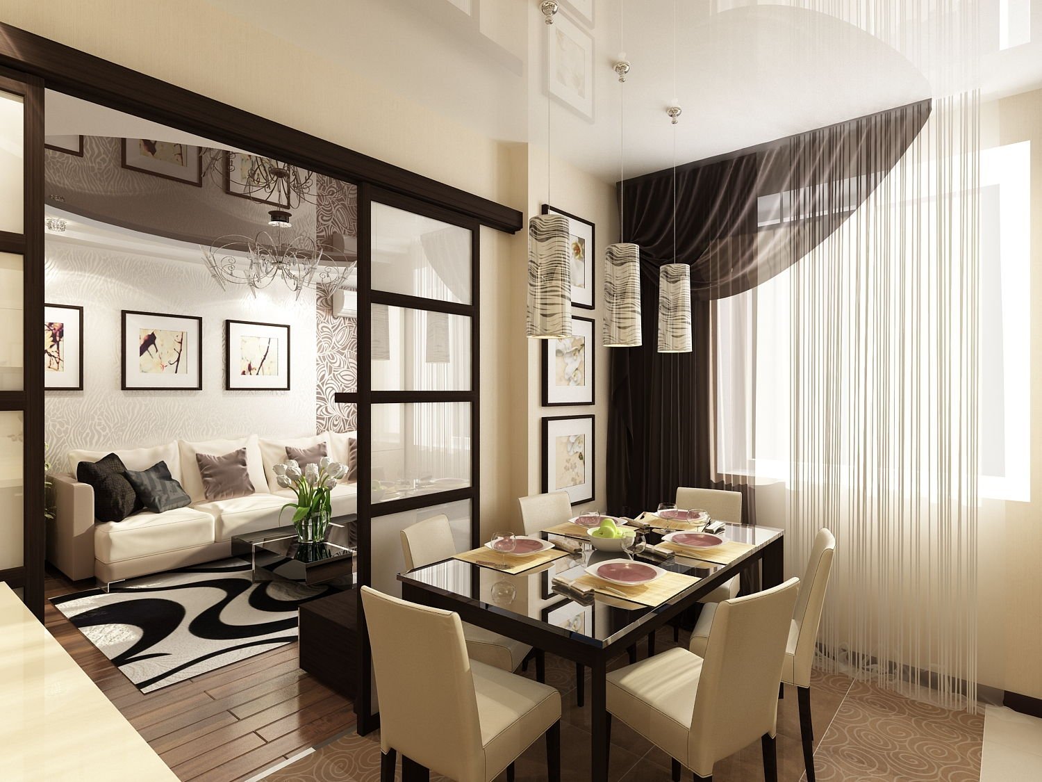 Кухня совмещенная с гостиной в частном доме с большими окнами