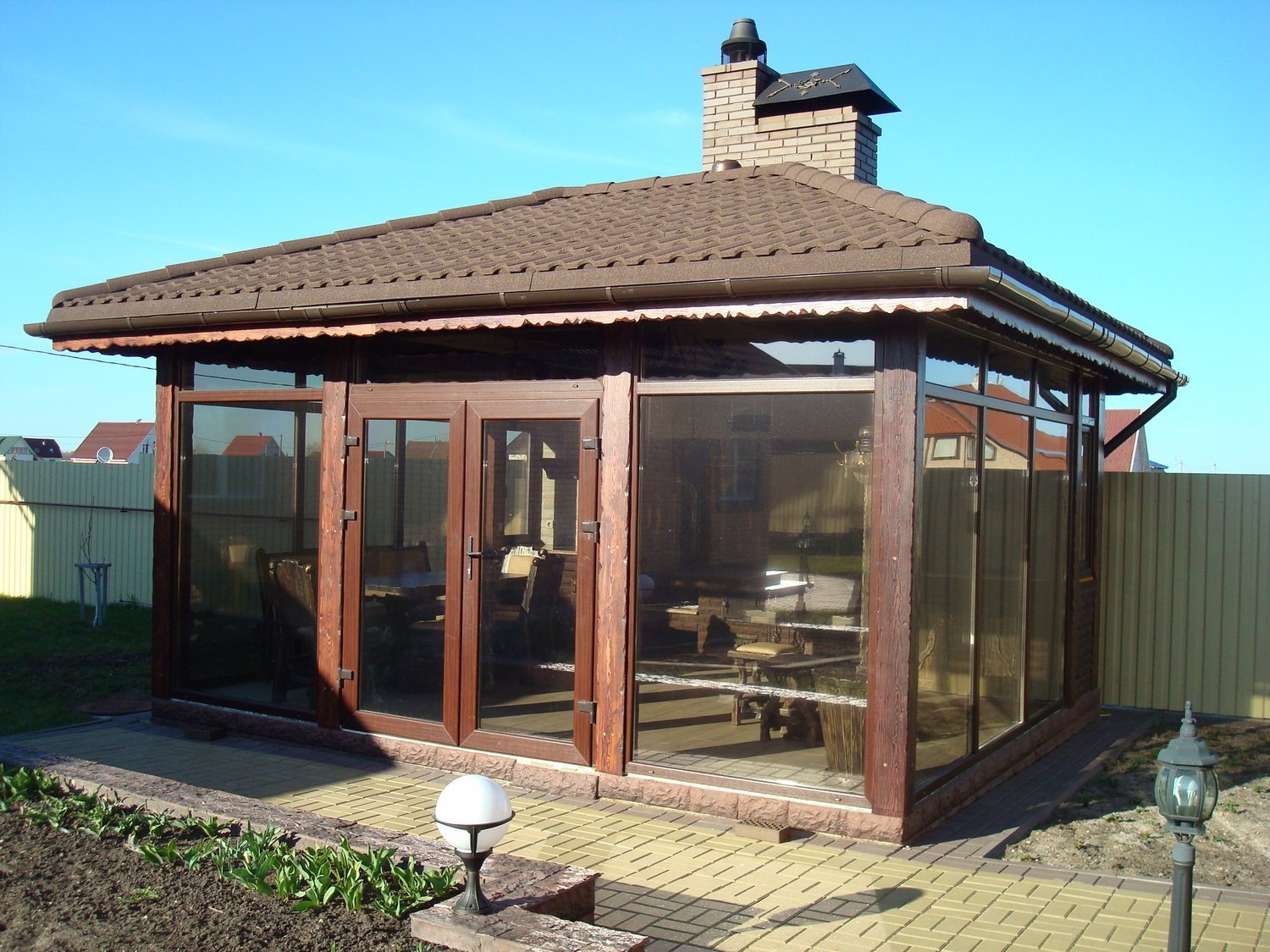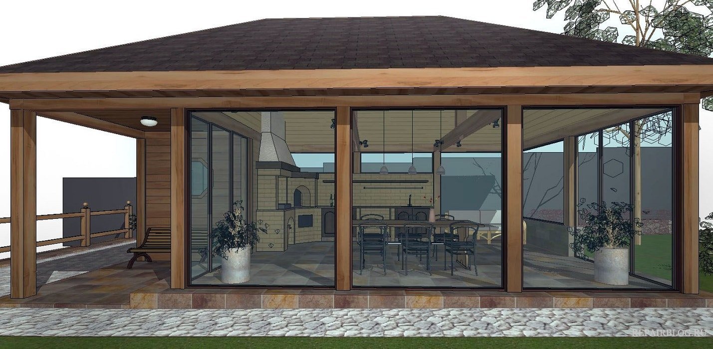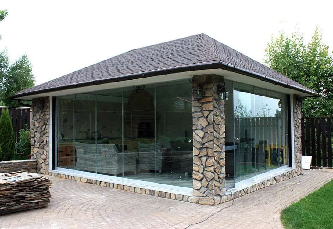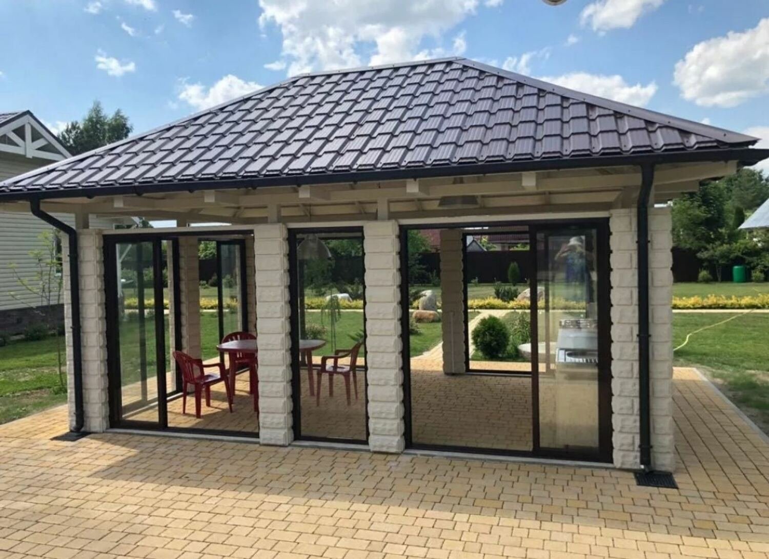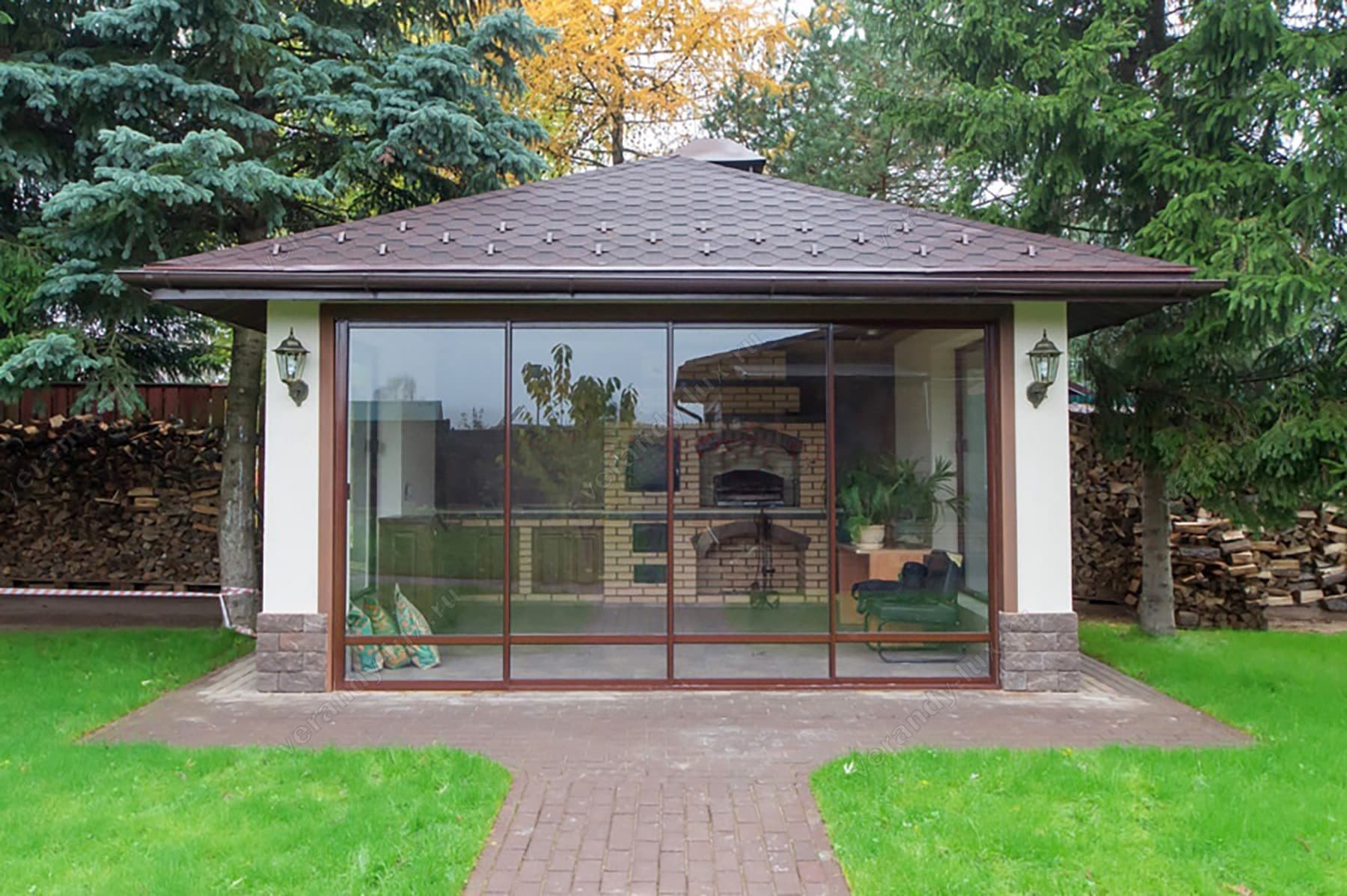 Крытая беседка застекленная с мангалом и барбекю 4х6