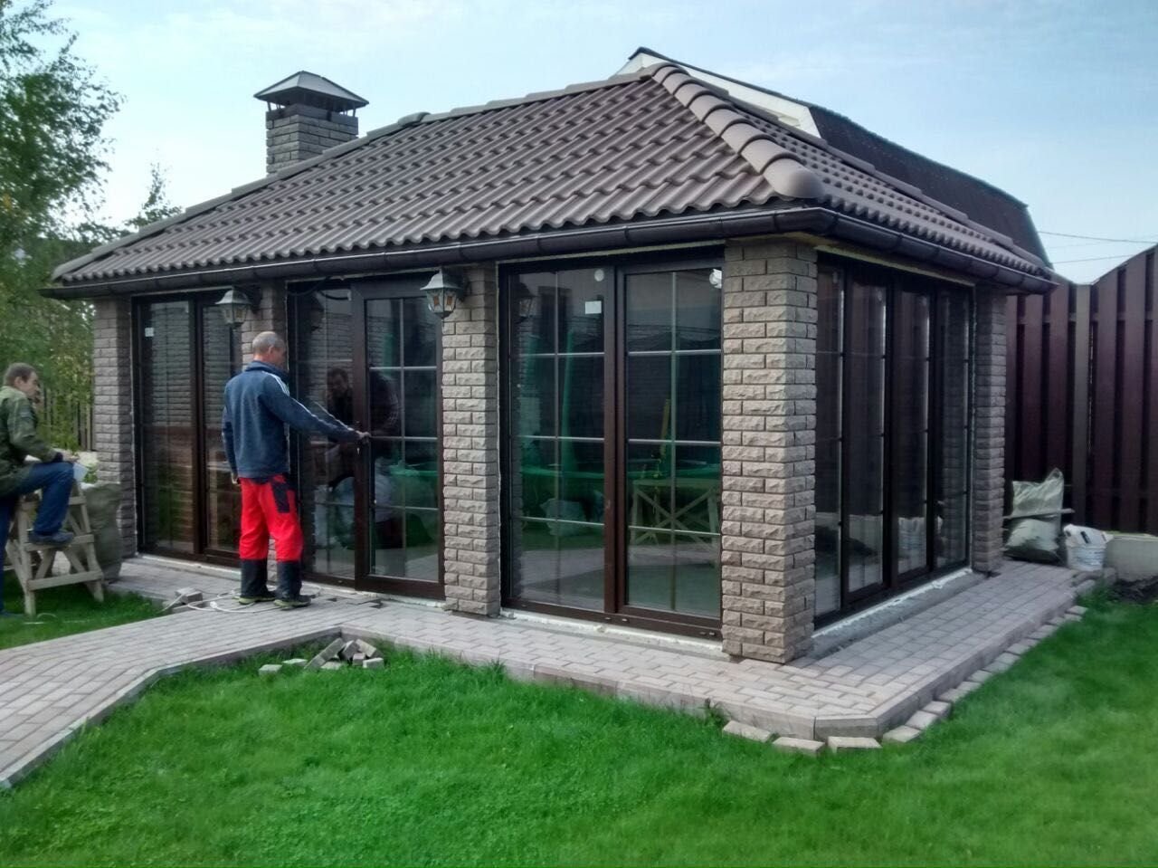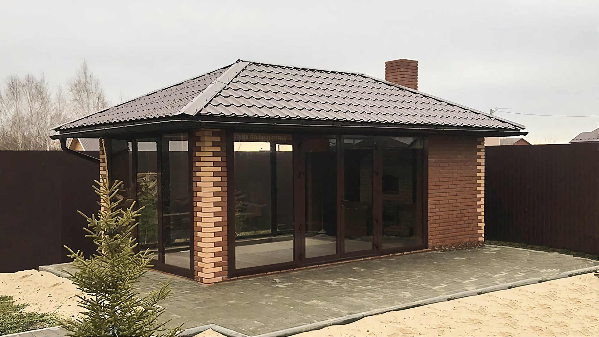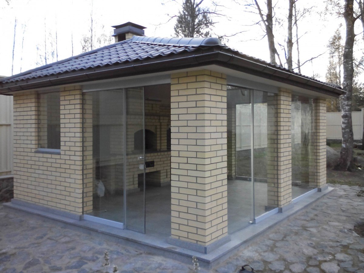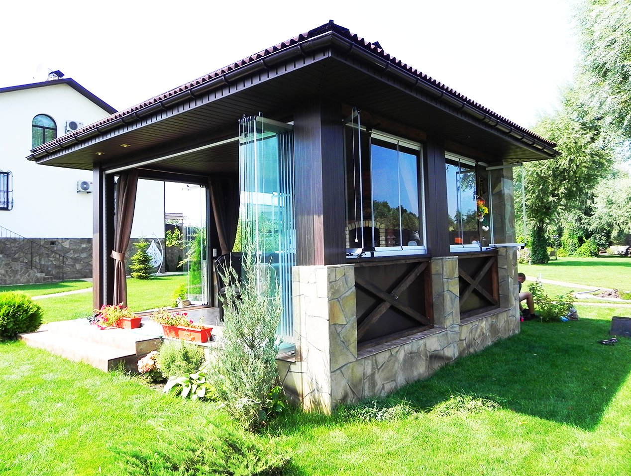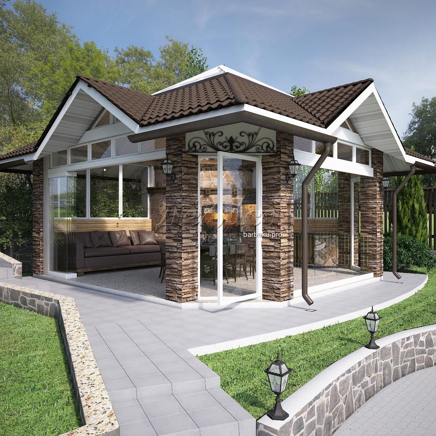 Крытая беседка застекленная с мангалом и барбекю 4х6