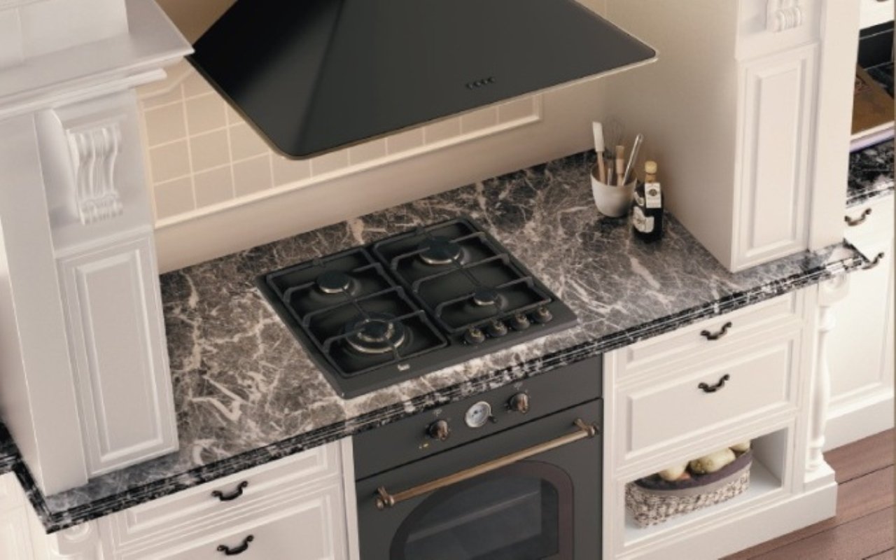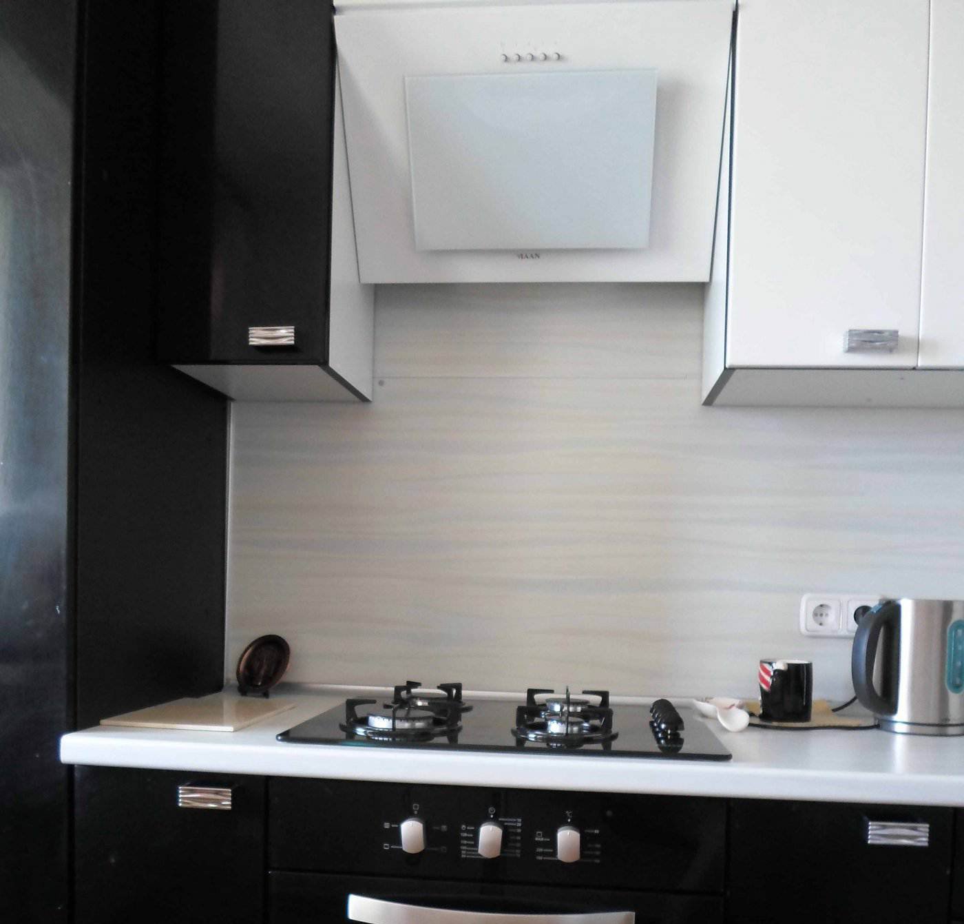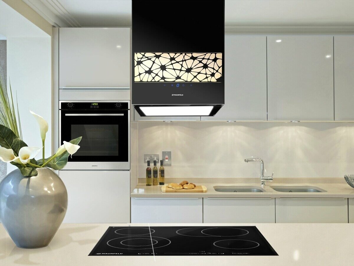 Черная варочная поверхность и белая вытяжка