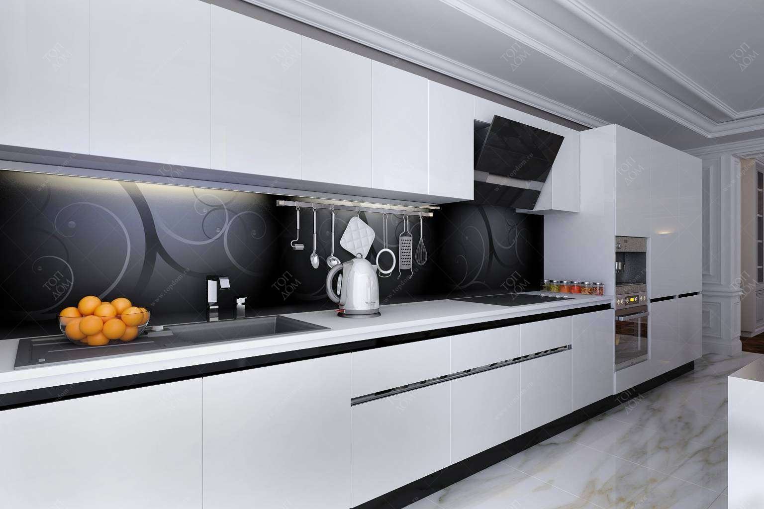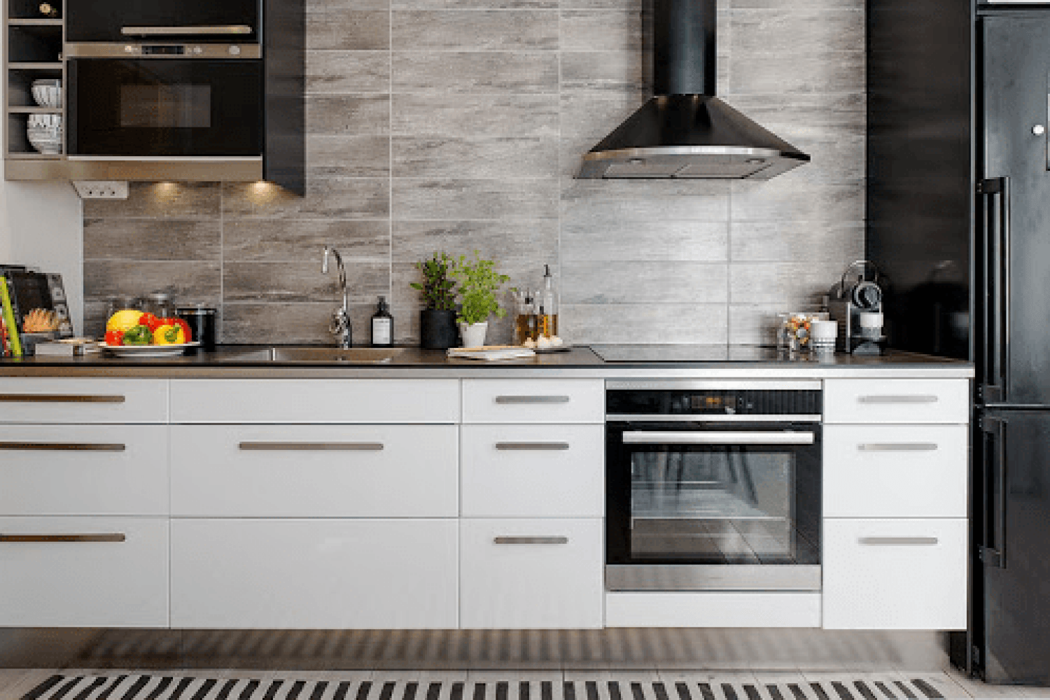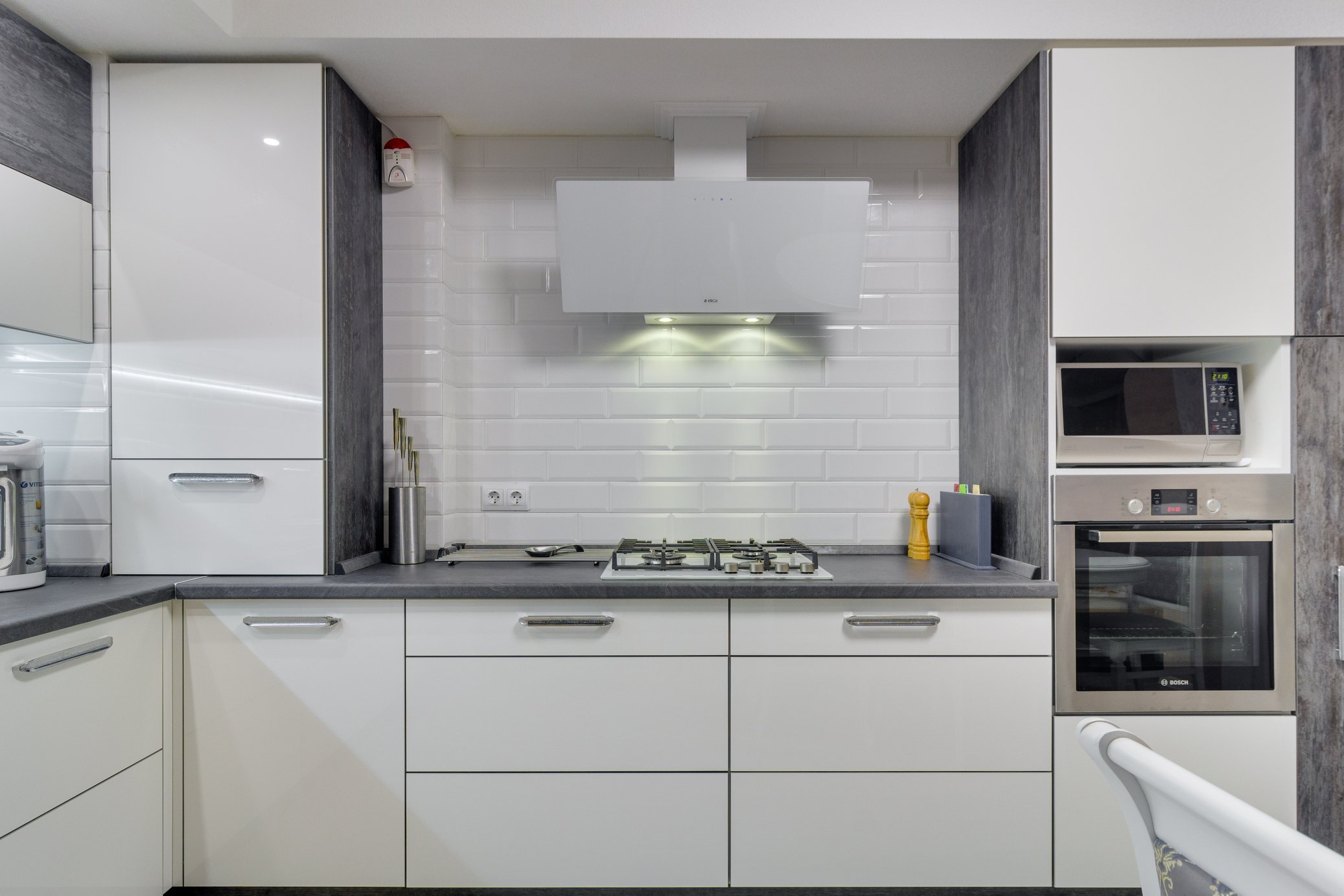 Черные ручки на белой кухне