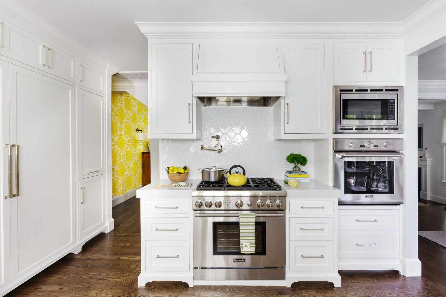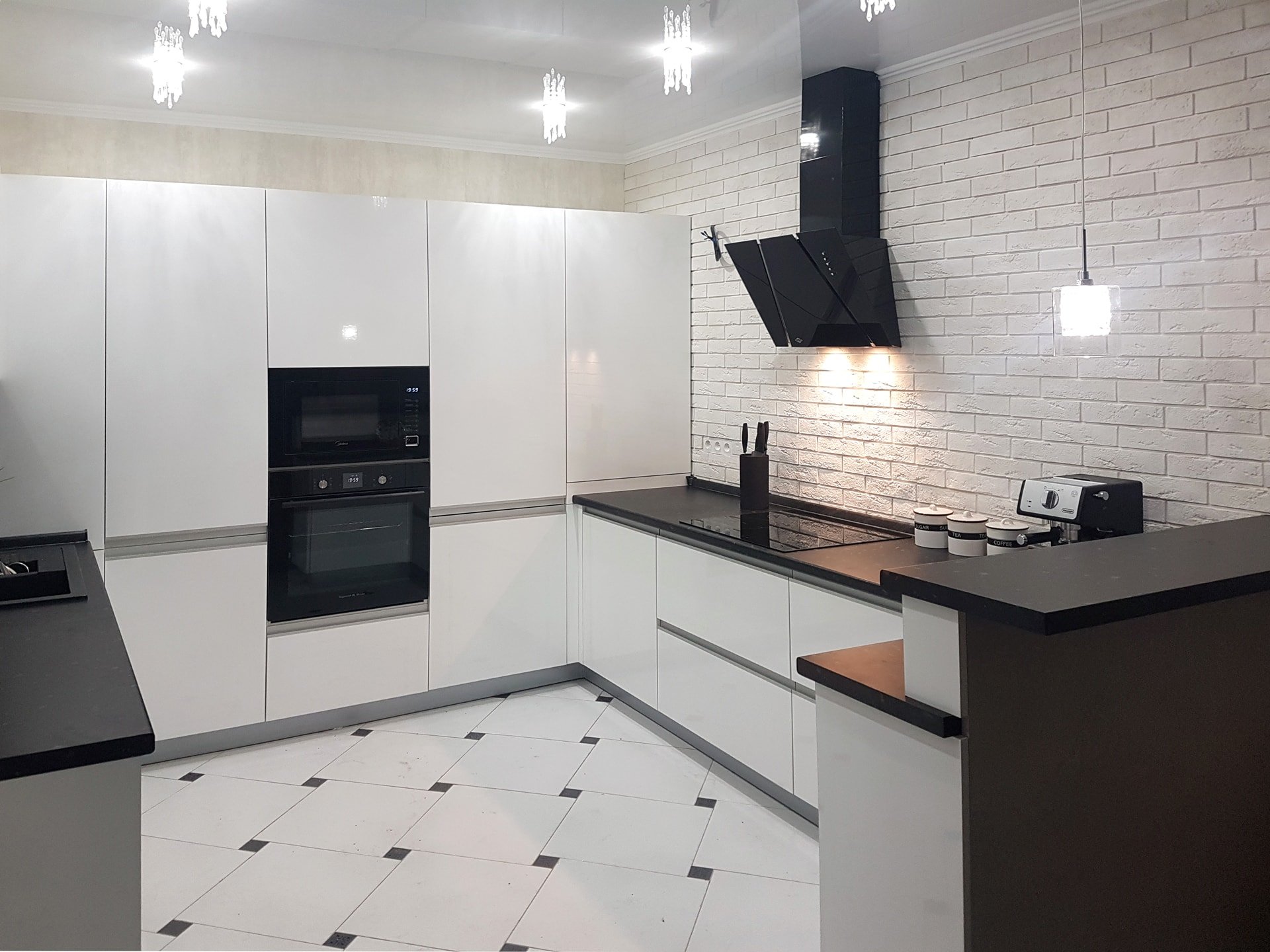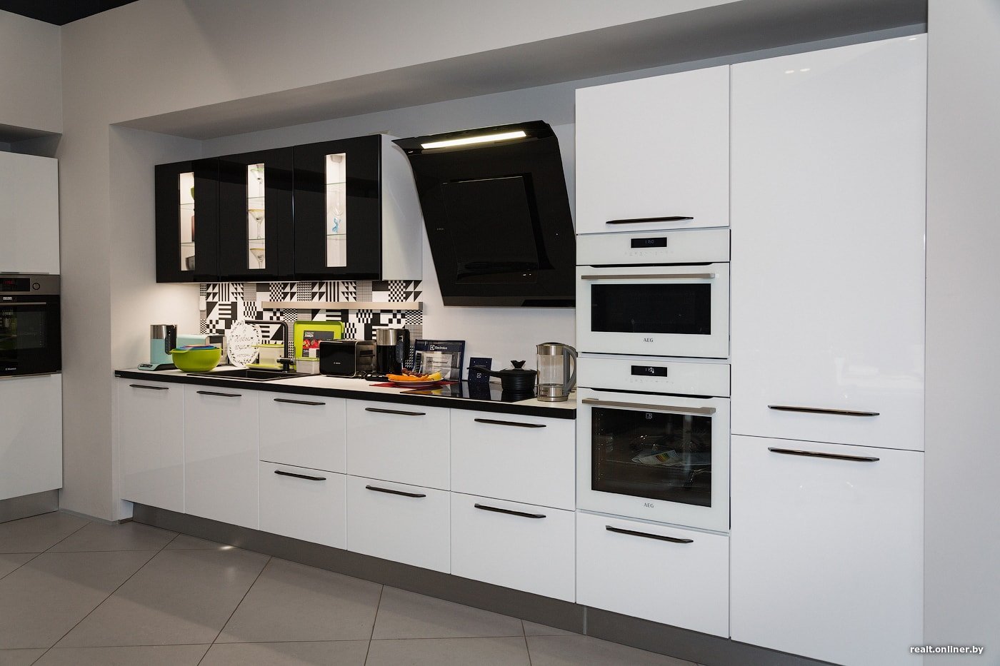 Черные ручки на белой кухне