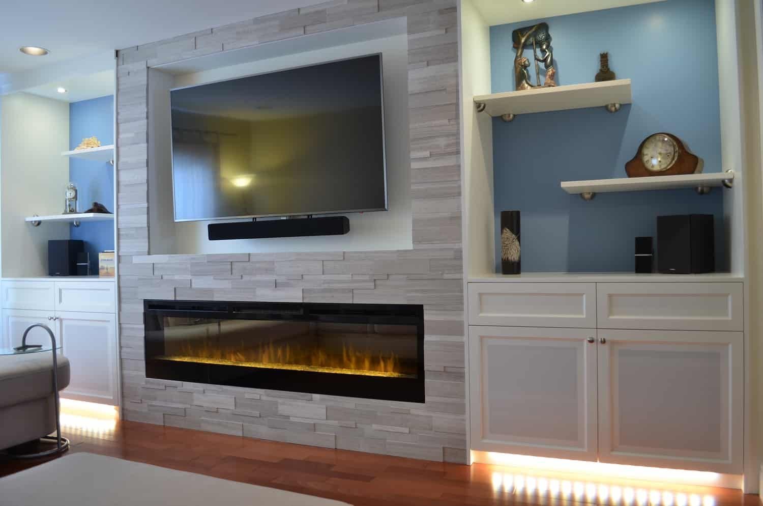 Стенка в гостиную с камином и телевизором