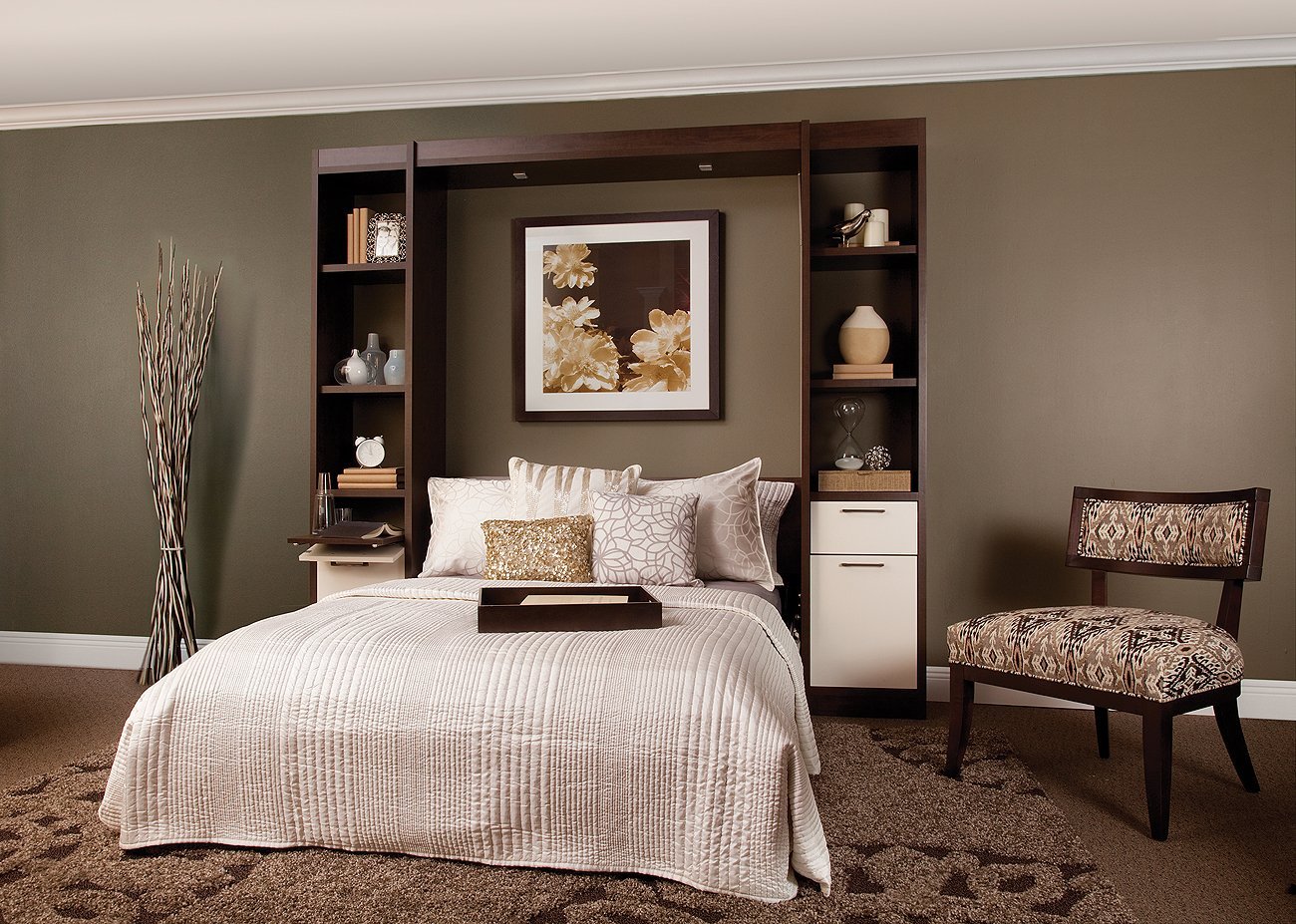 Спальня с полками над кроватью