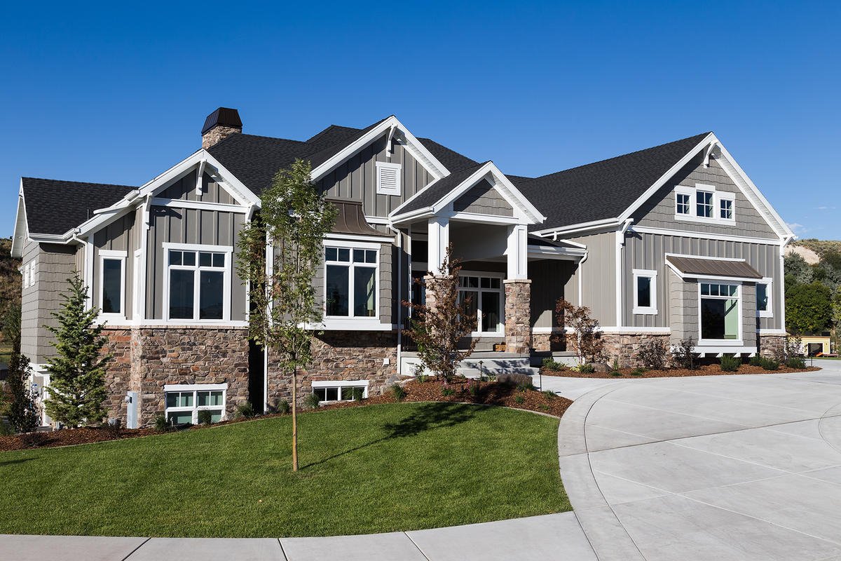 Серый дом с коричневыми окнами