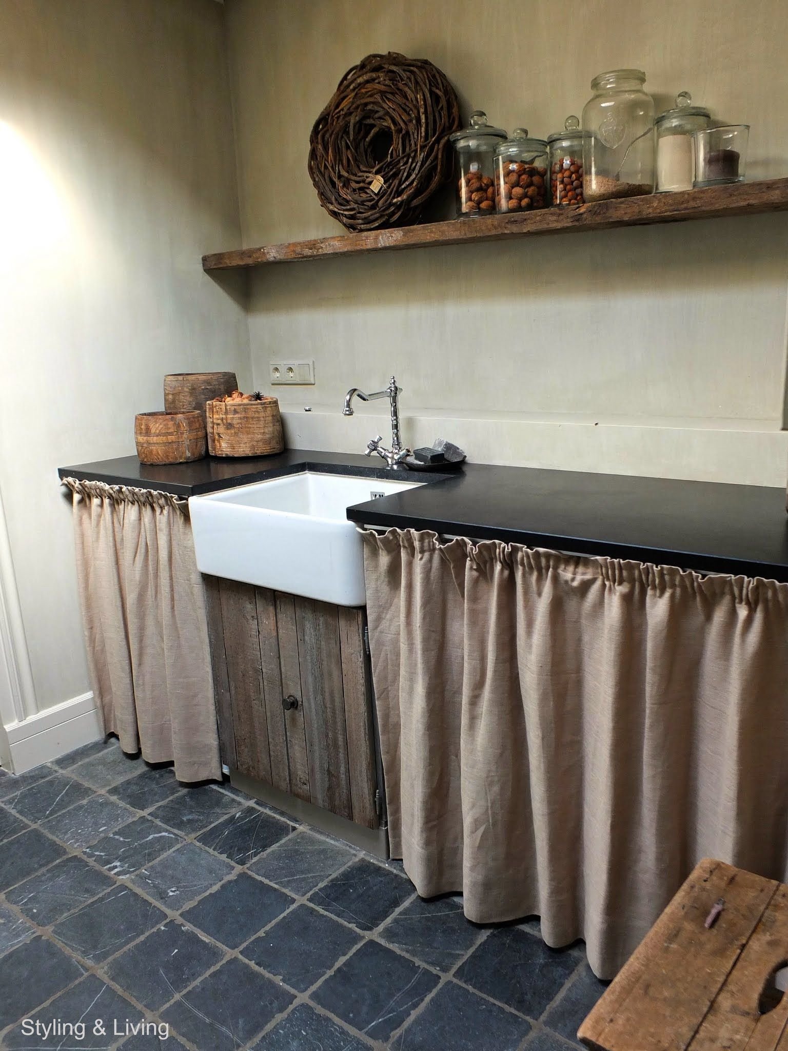 Кухонный гарнитур в деревенском стиле со шторками