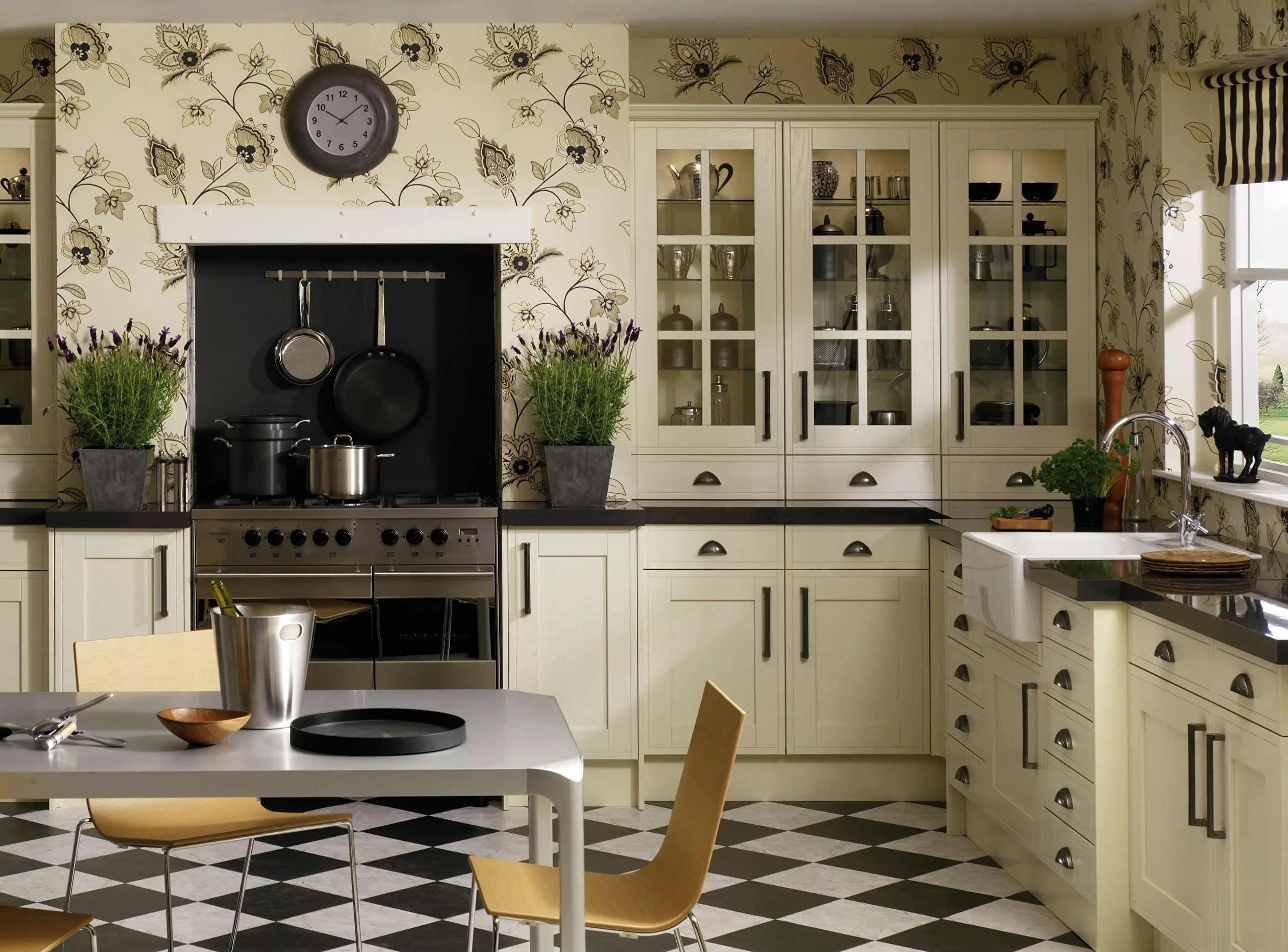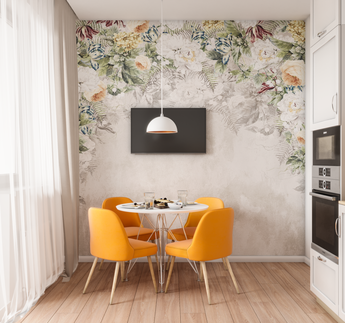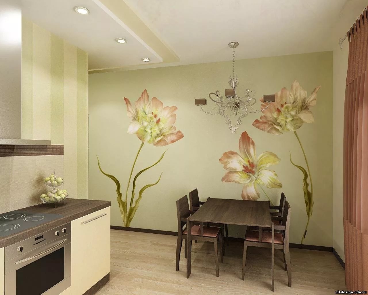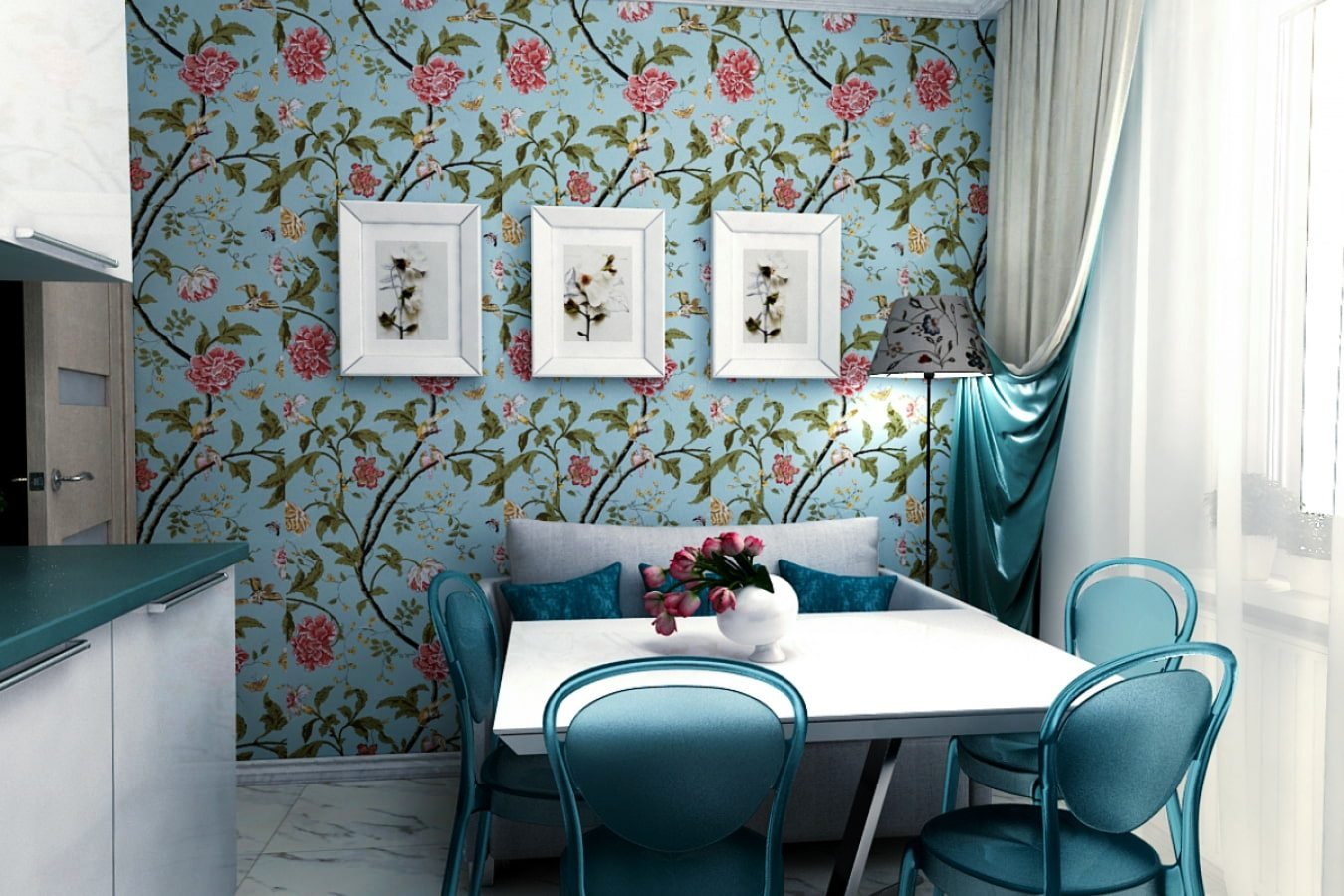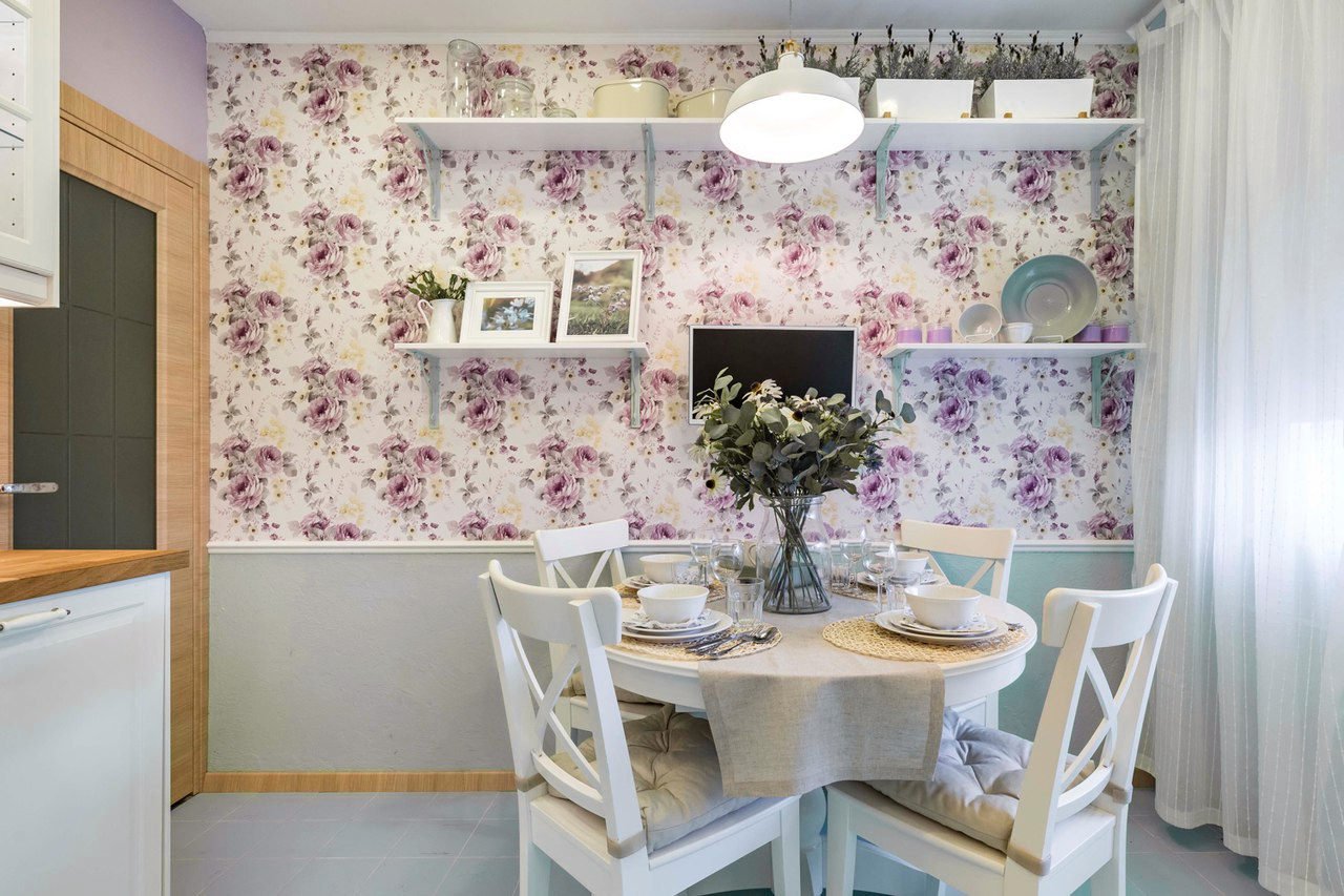 Цветочные обои на кухне