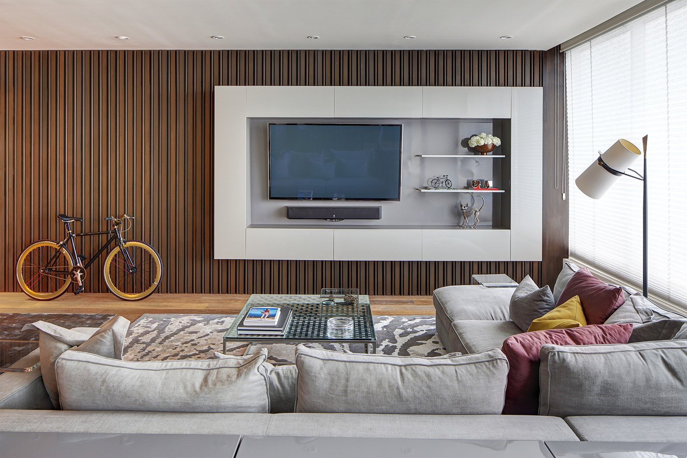 Современный интерьер гостиной с большим телевизорам