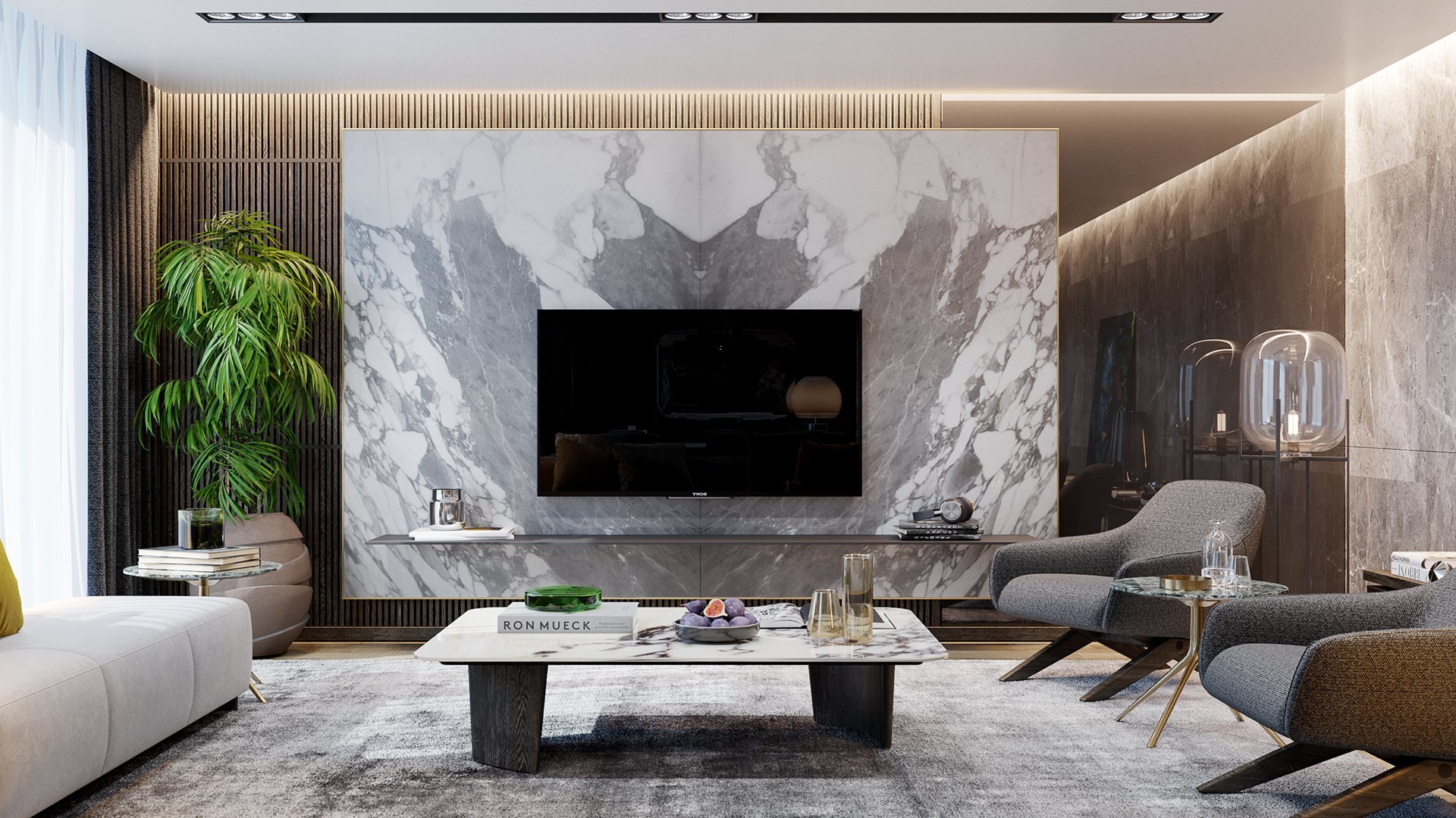 Серый мрамор в интерьере гостиной