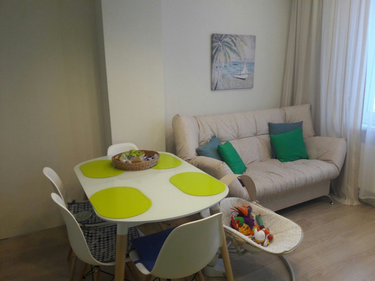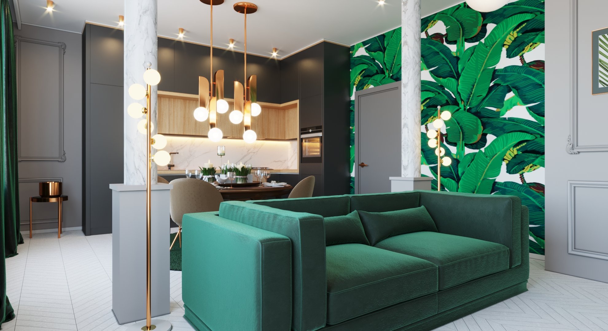 Зеленый диван в интерьере кухни гостиной