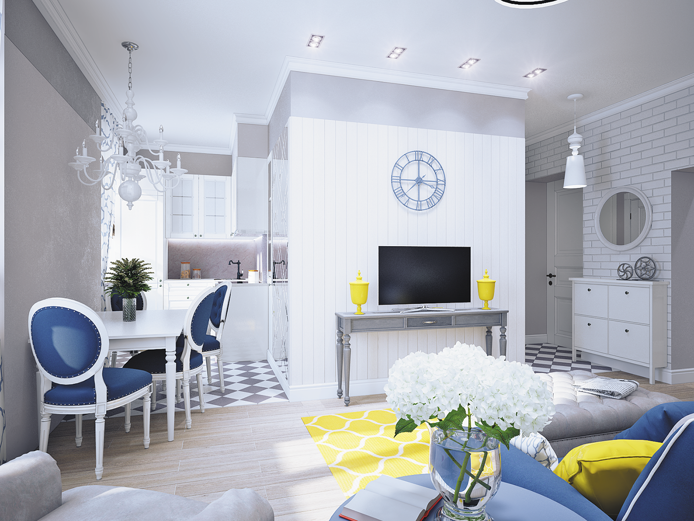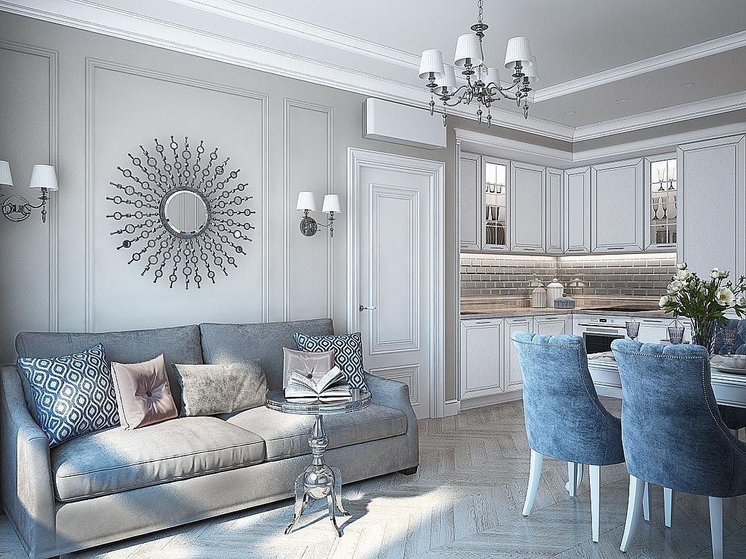 Кухня гостиная в бело голубых тонах
