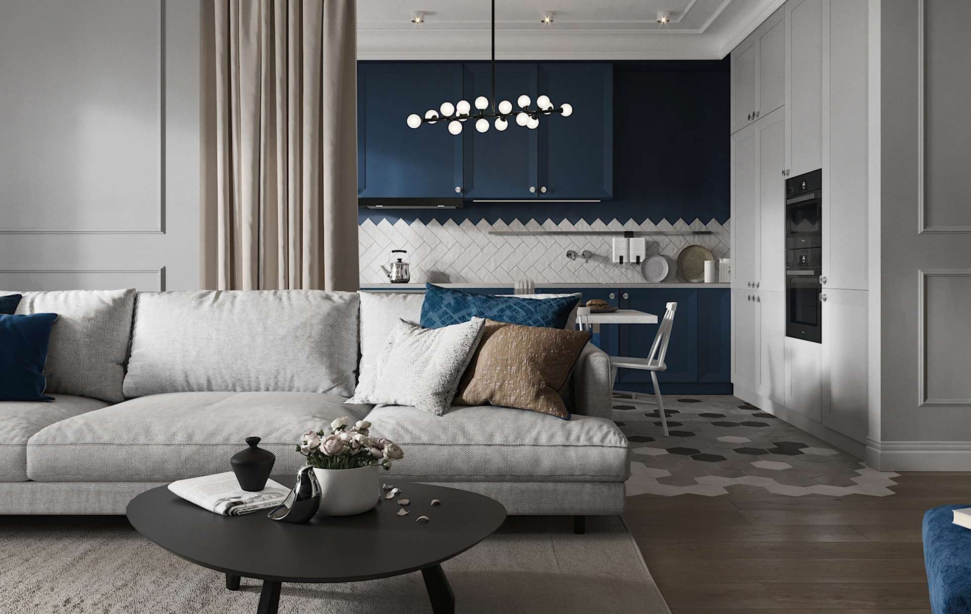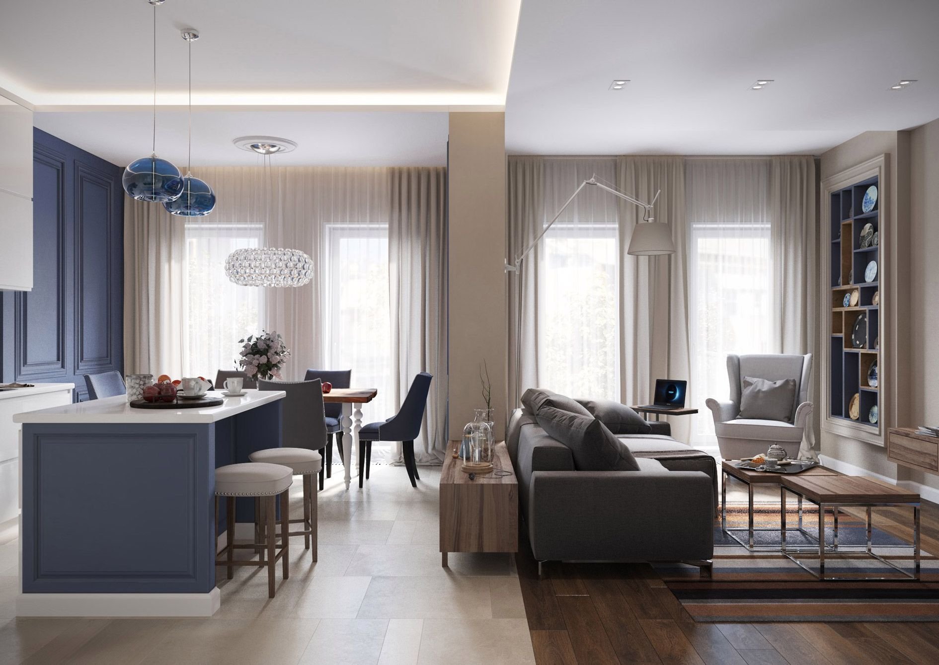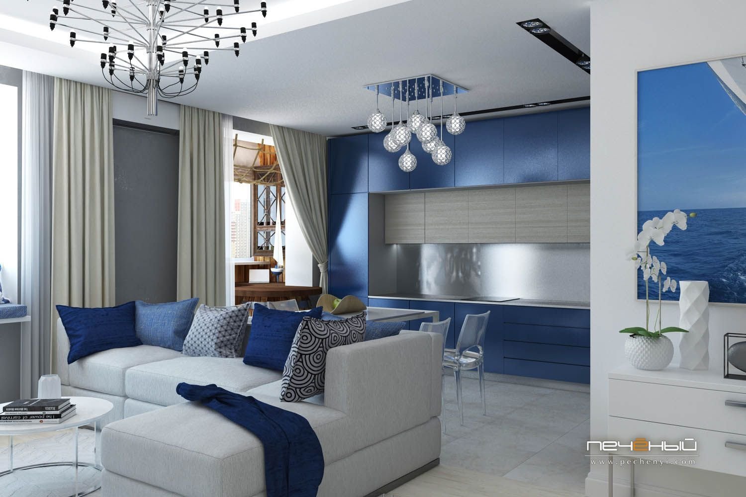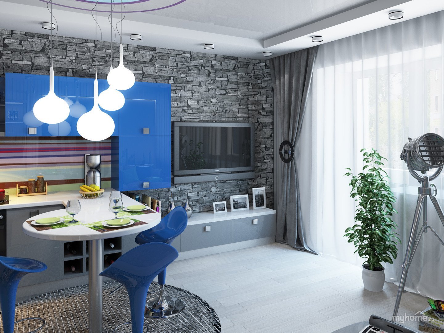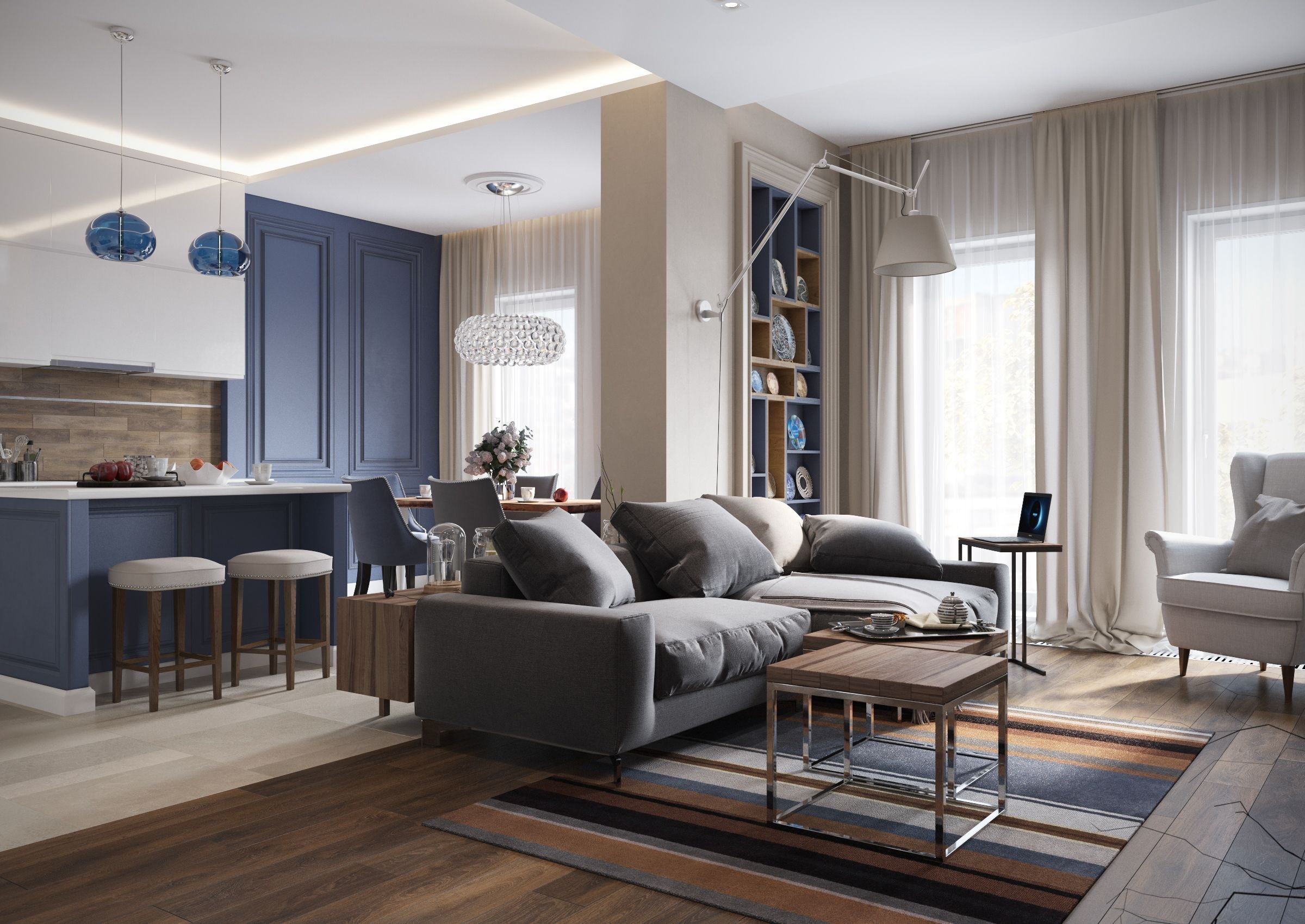 Сине серая кухня гостиная
