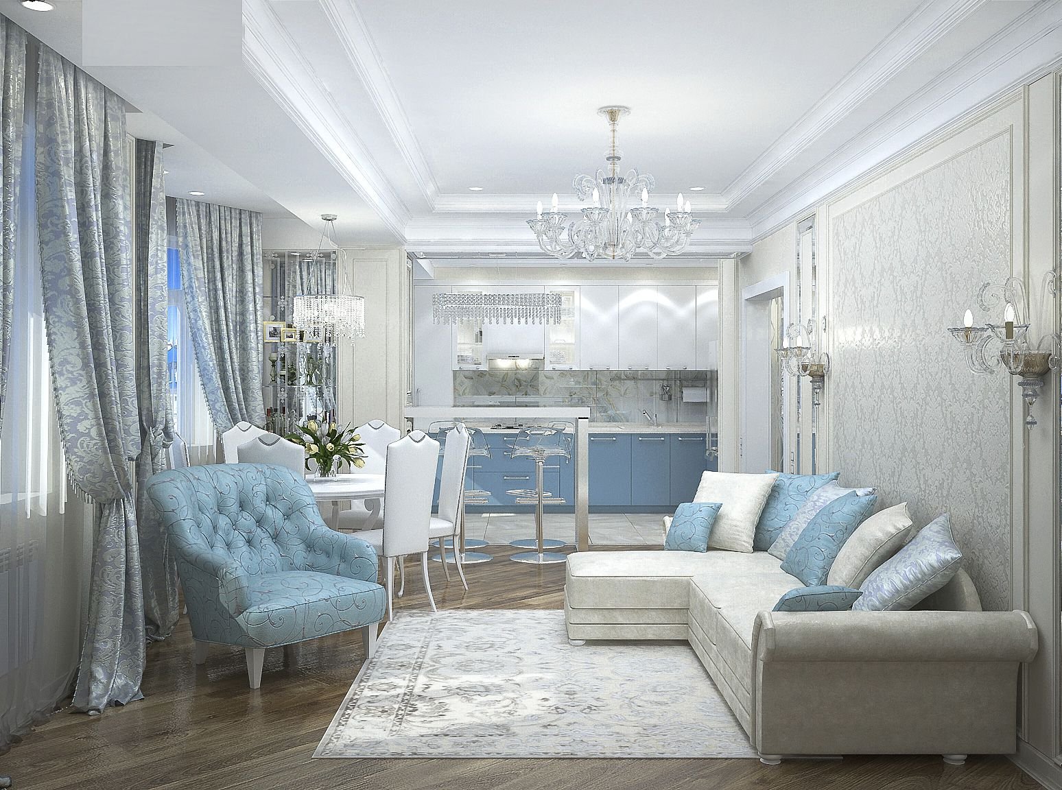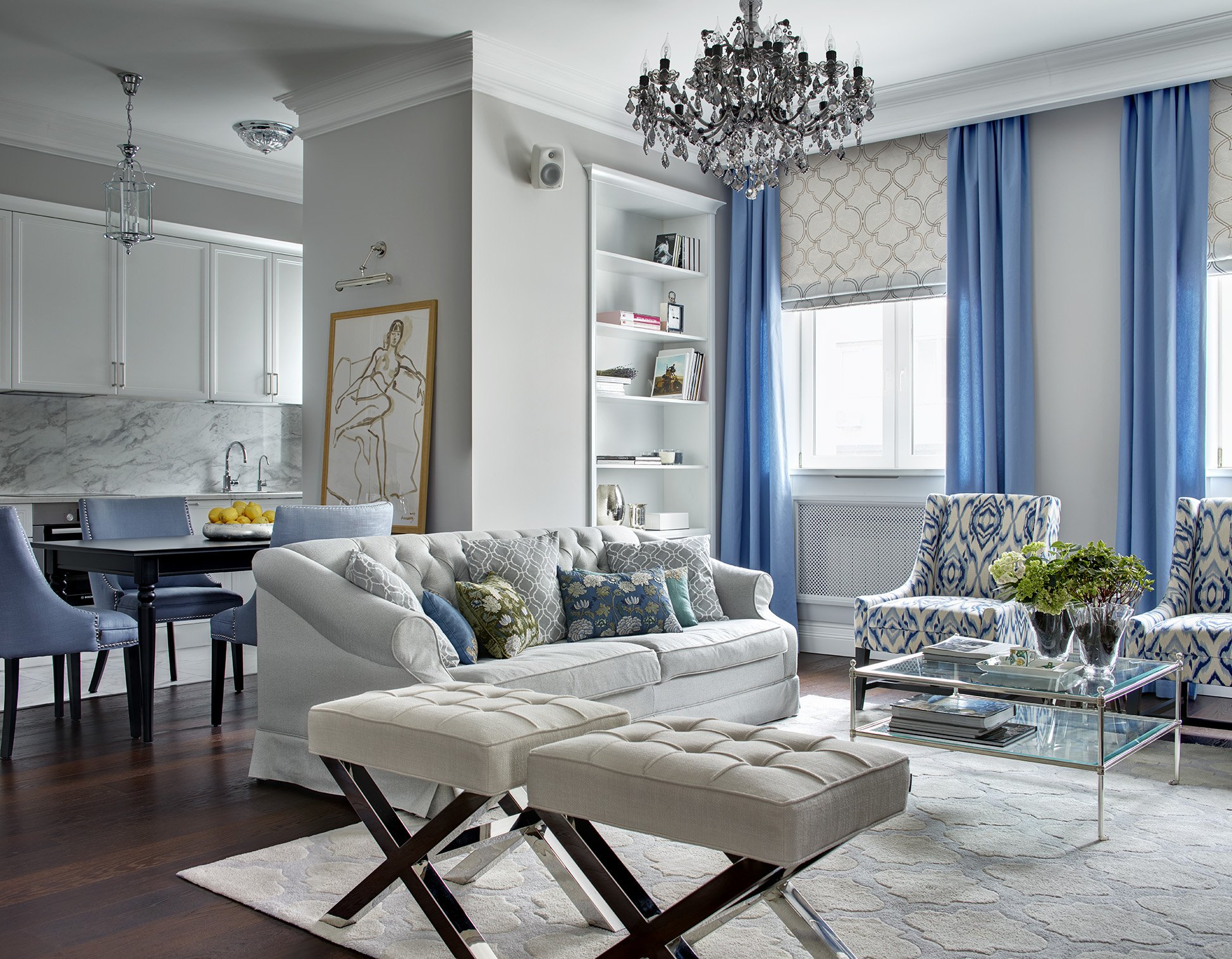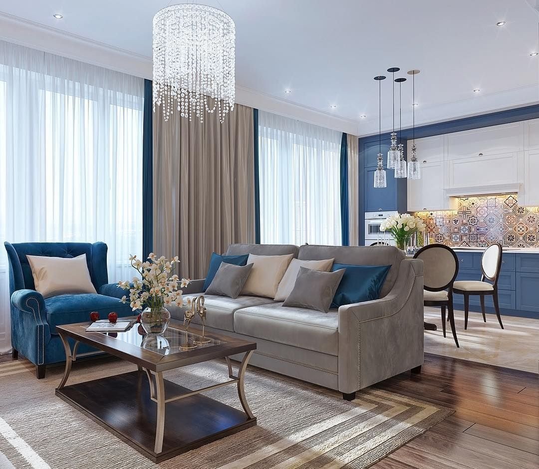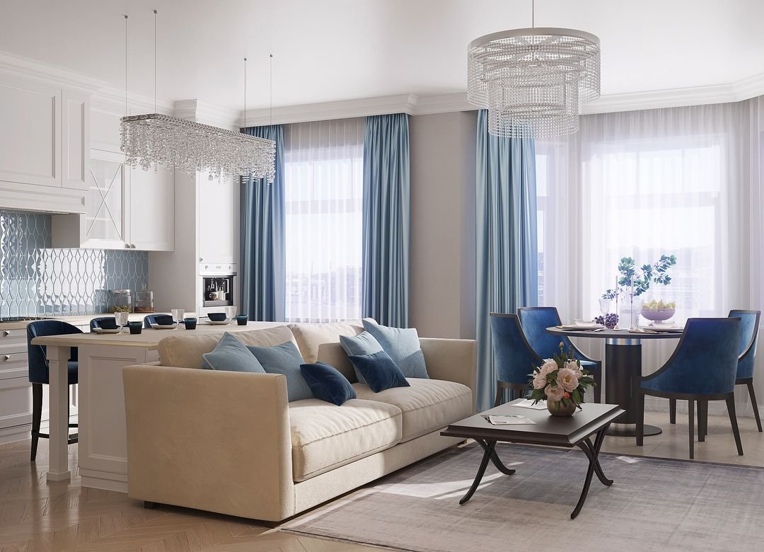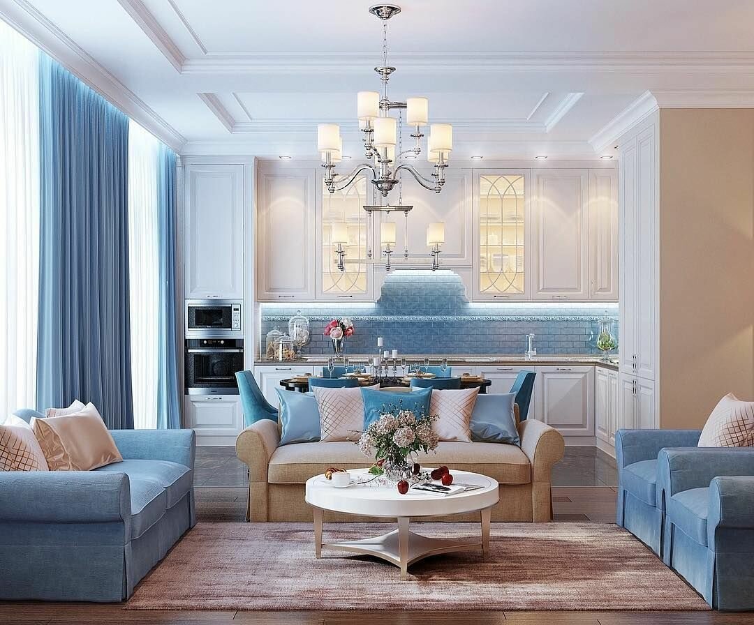 Кухня-гостиная в классическом стиле в голубых тонах