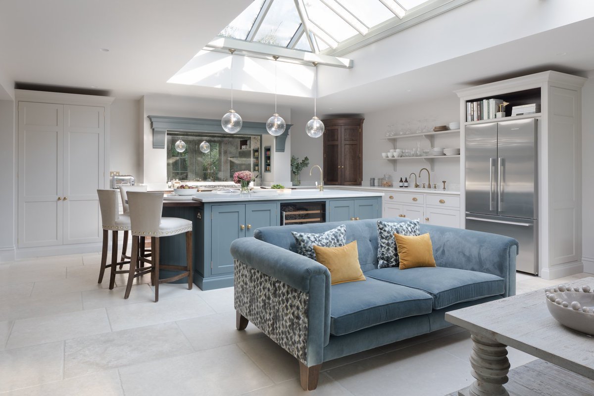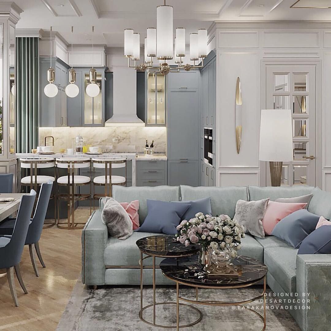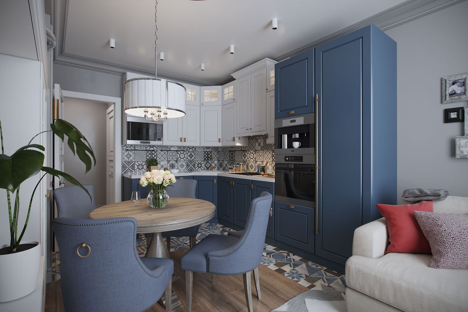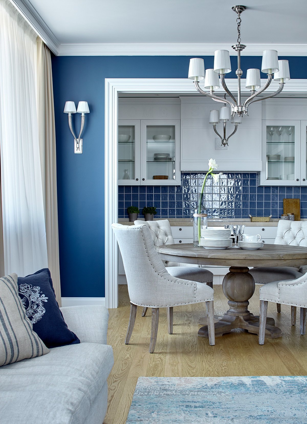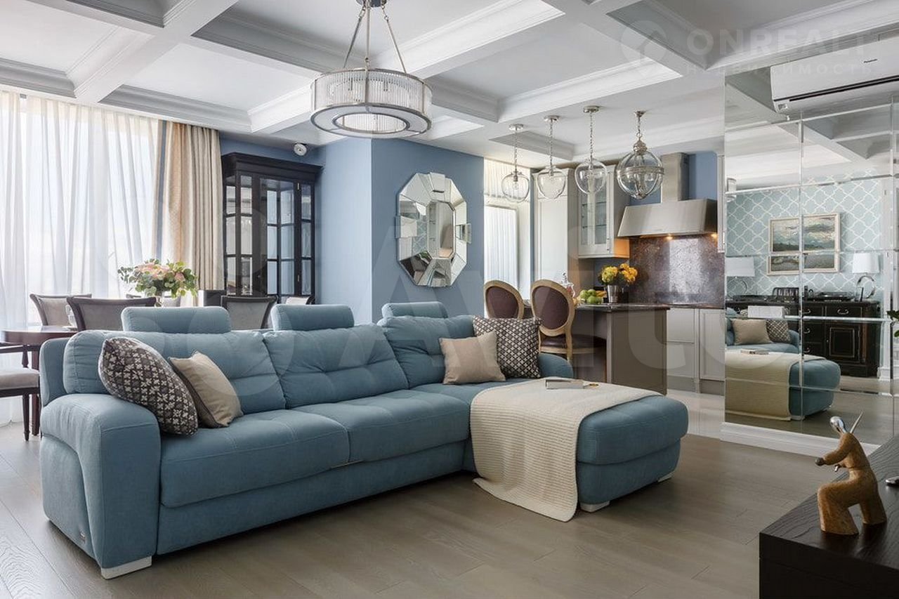 Кухня-гостиная в классическом стиле в голубых тонах
