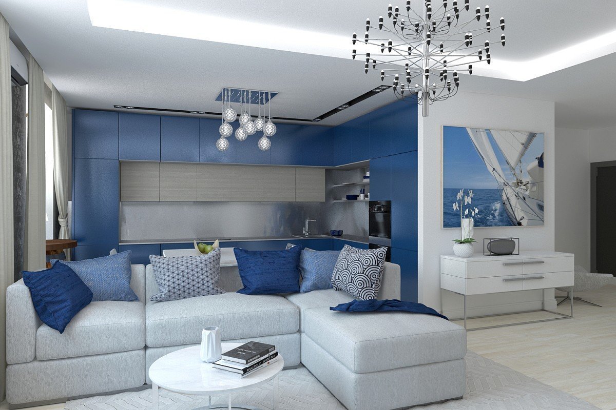 Кухня гостиная в голубых тонах