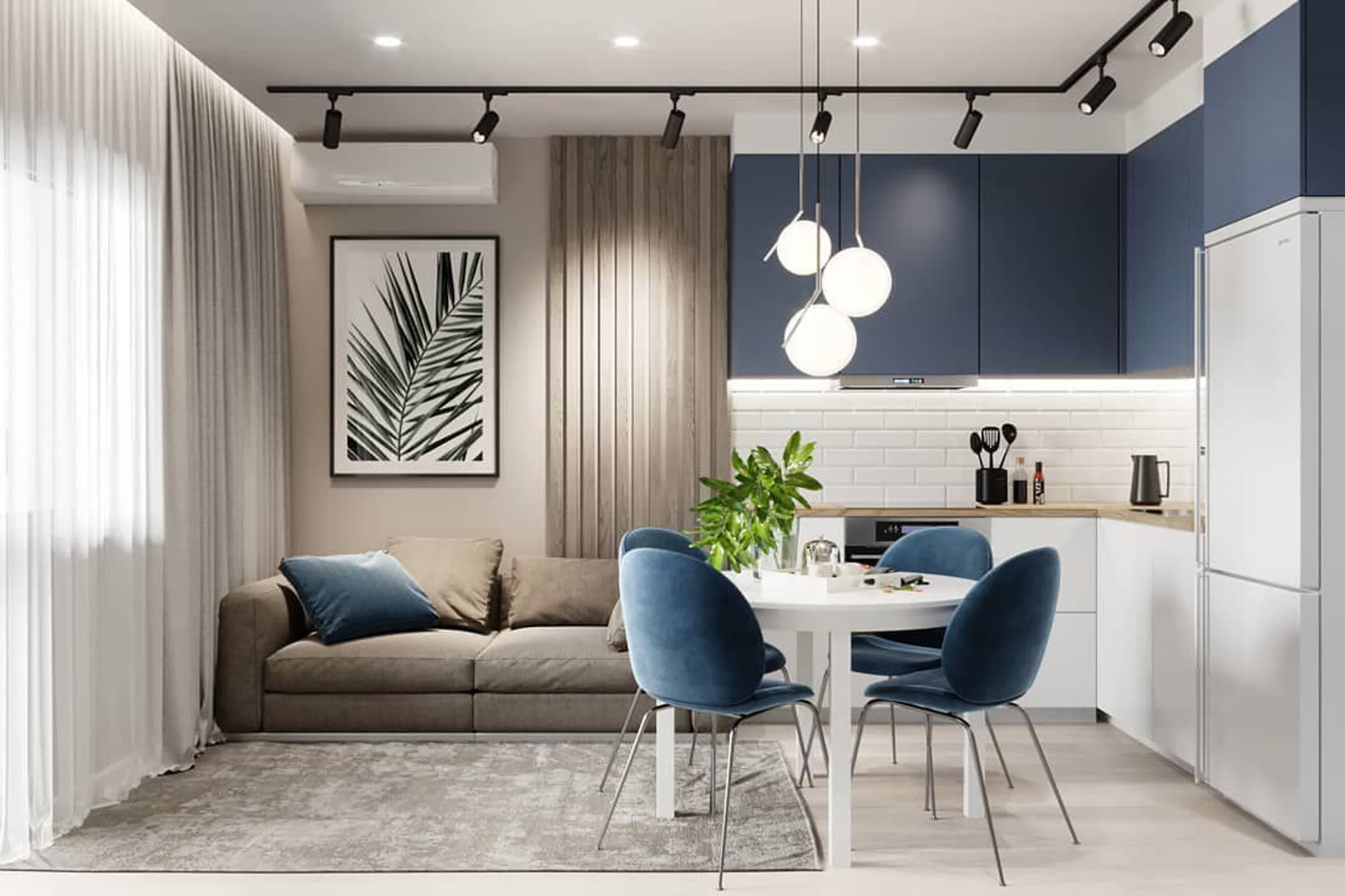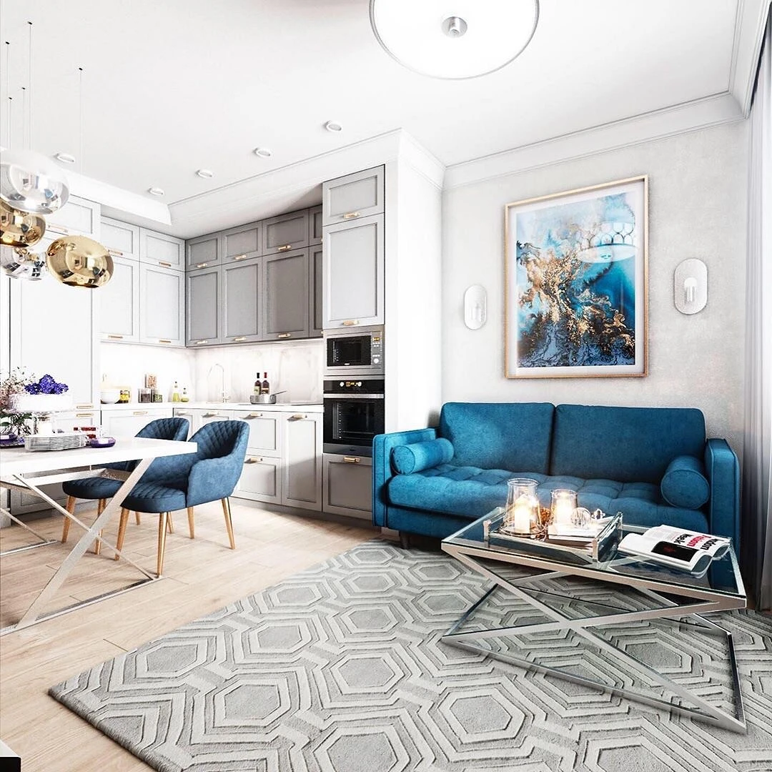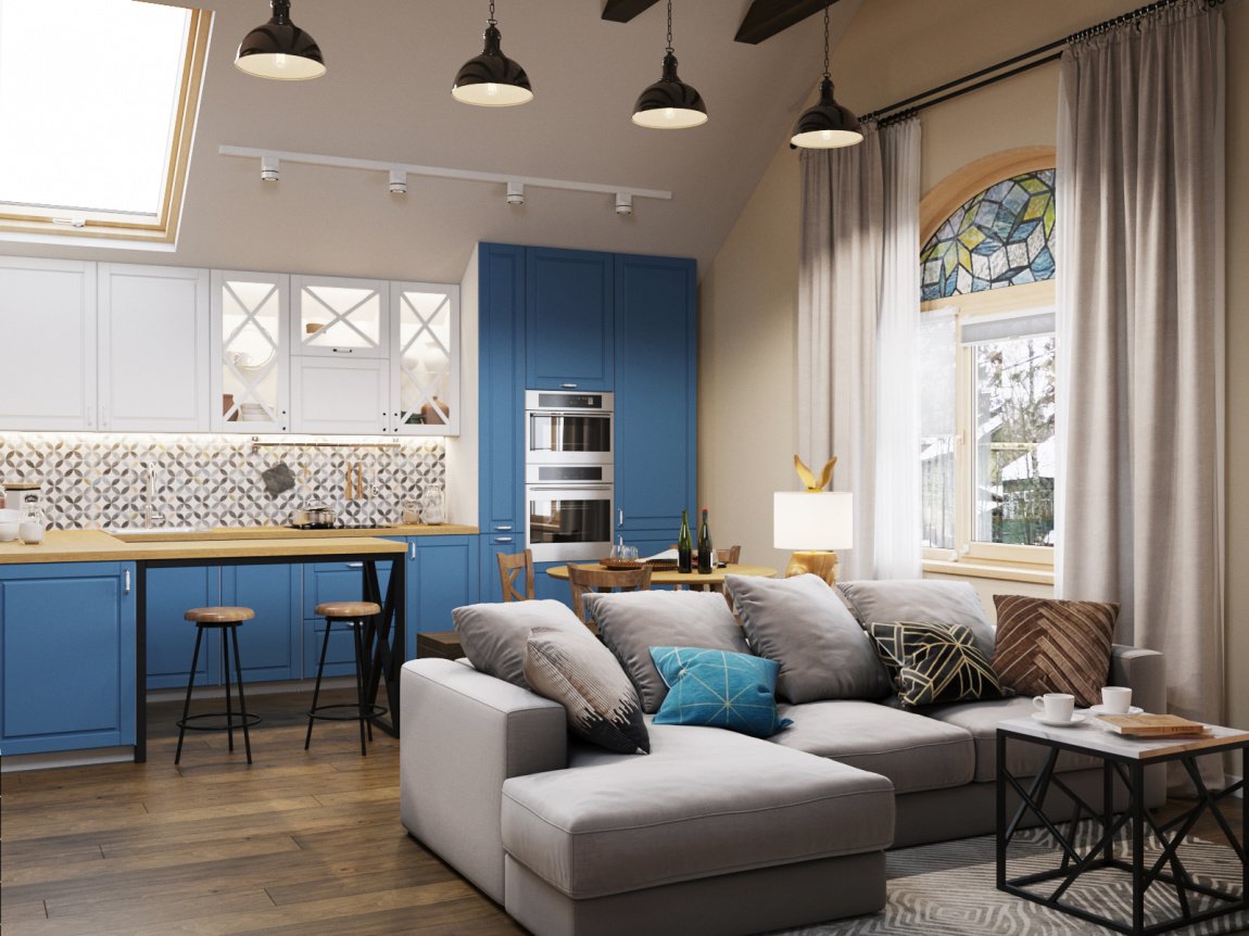 Синий диван в интерьере гостиной совмещенной с кухней