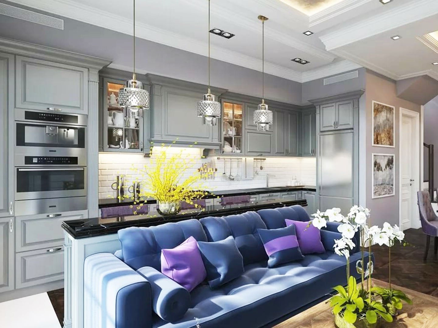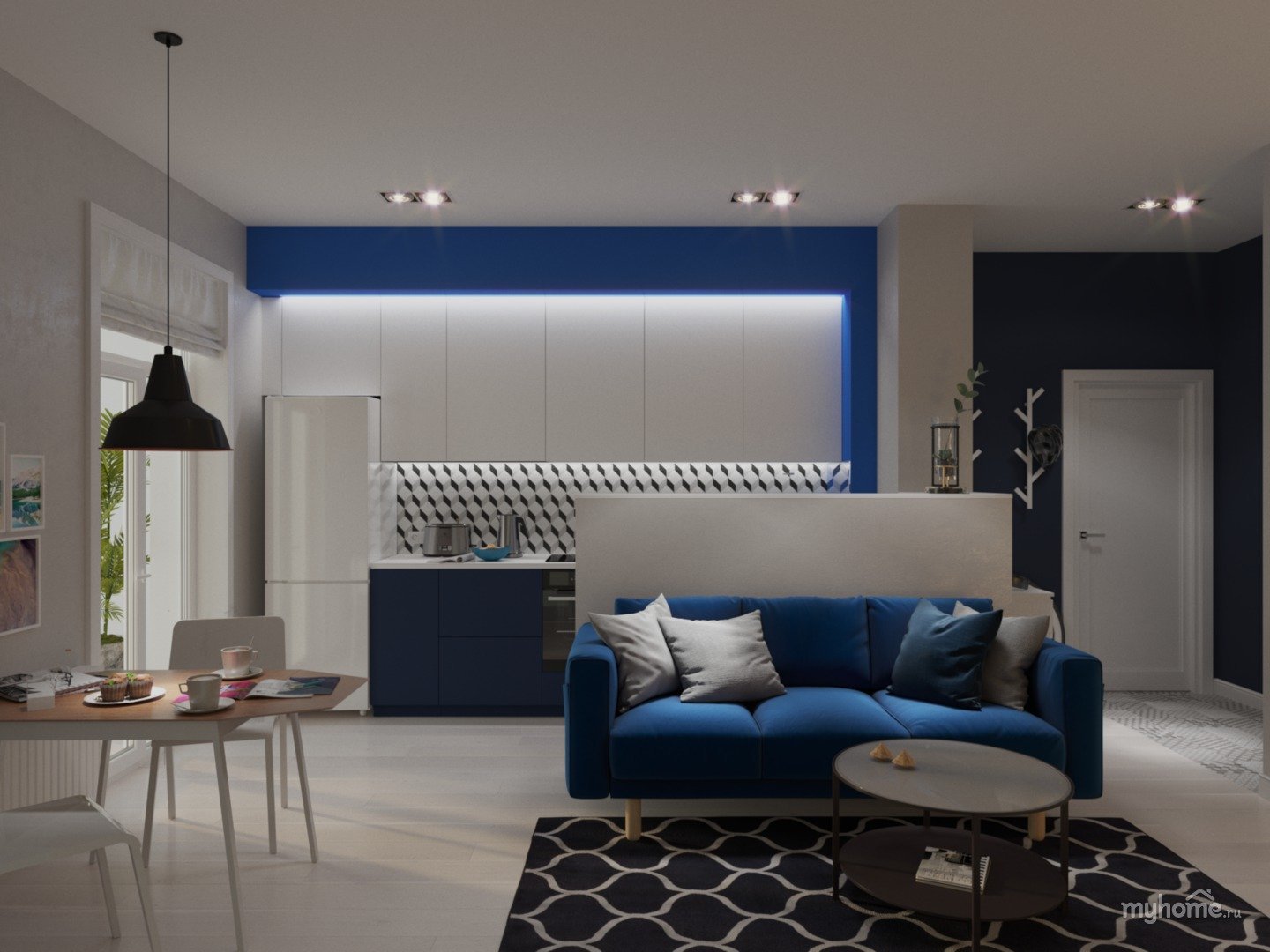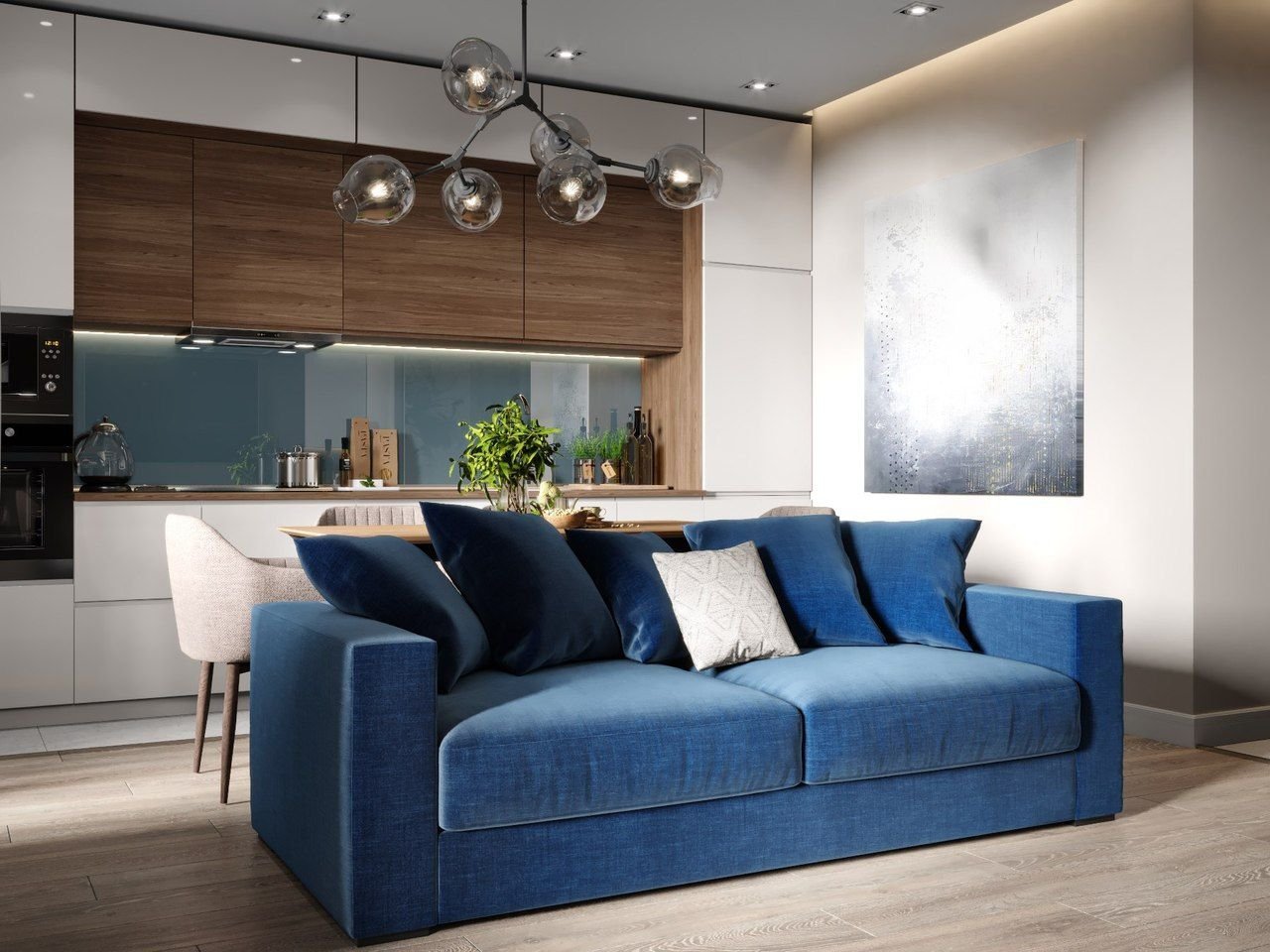 Синий диван в интерьере гостиной совмещенной с кухней