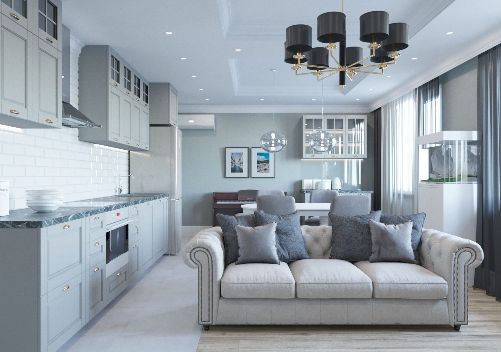 Кухня гостиная в серо голубых тонах