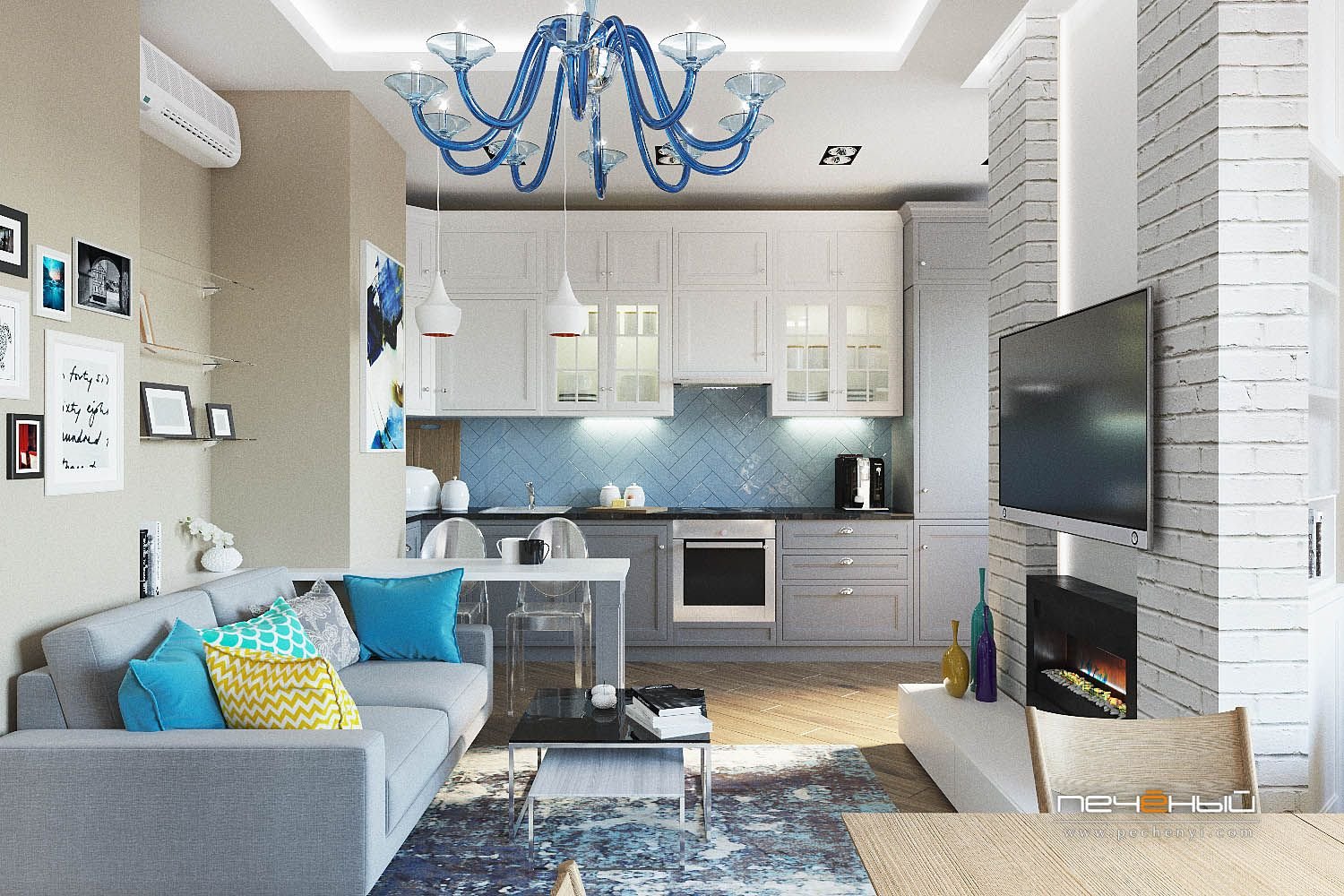 Серо голубая кухня гостиная