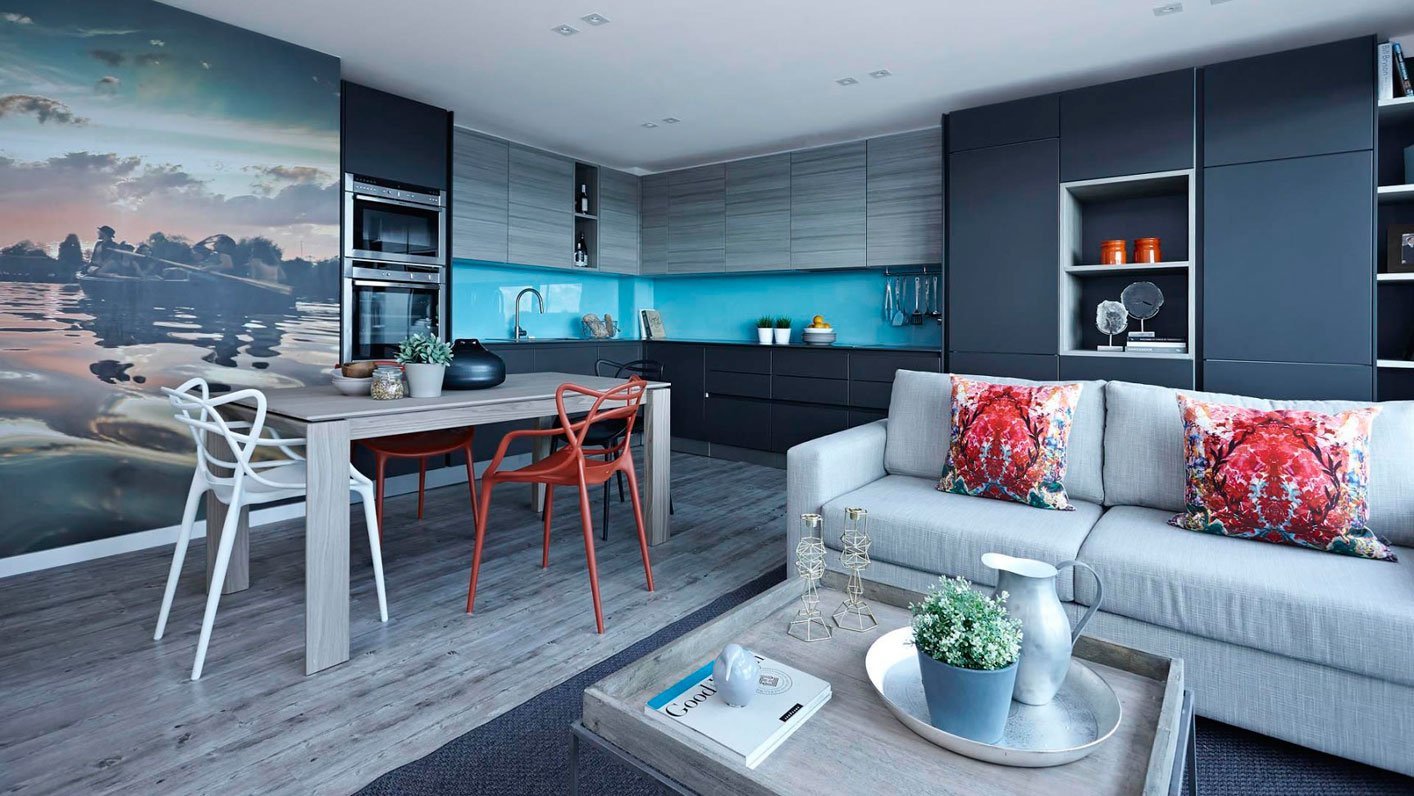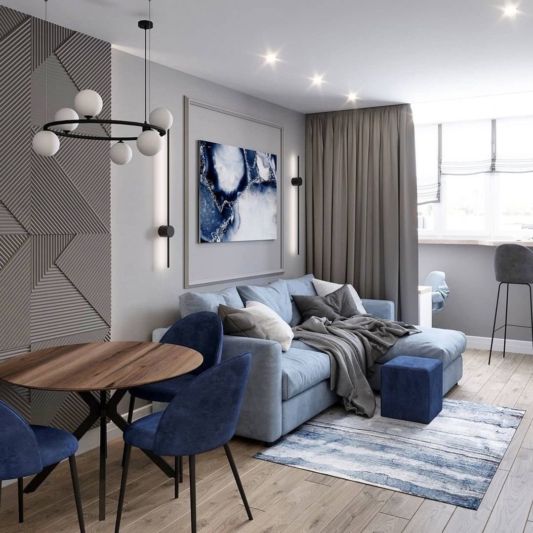 Интерьер кухни-гостиной в квартире 20 кв в серо-синих тонах