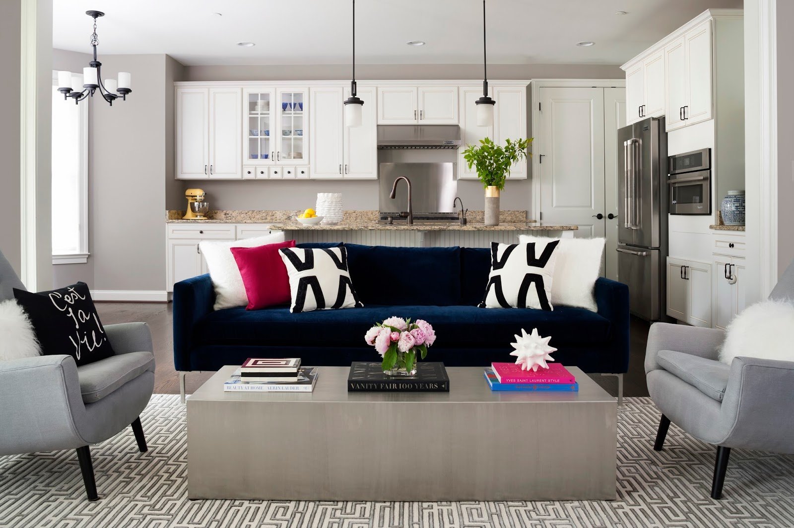 Серая кухня с гостиной синий диван