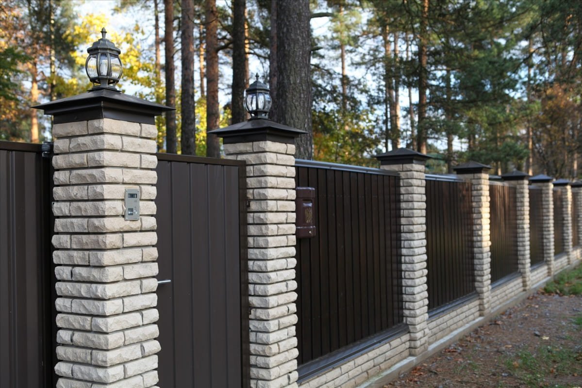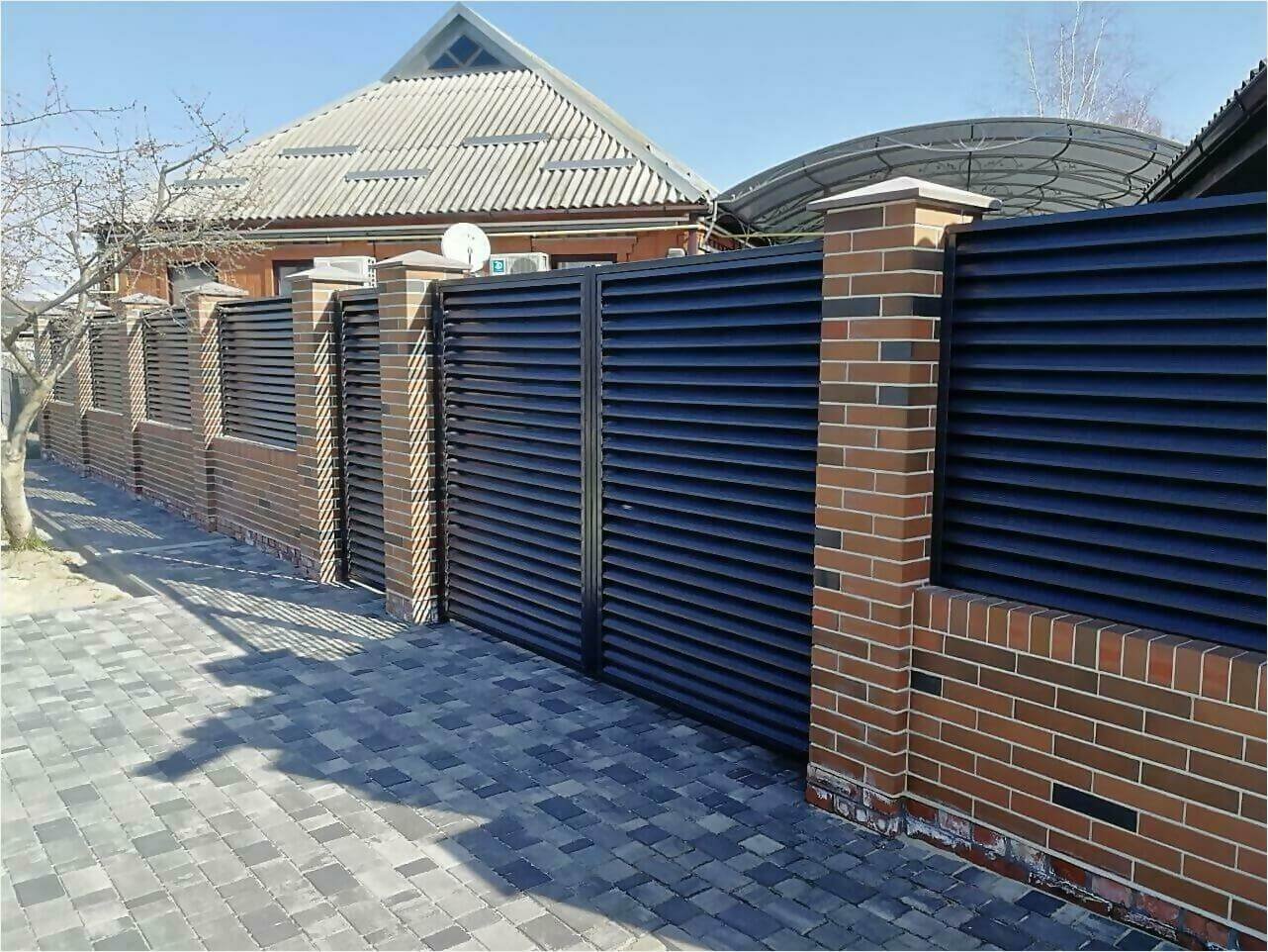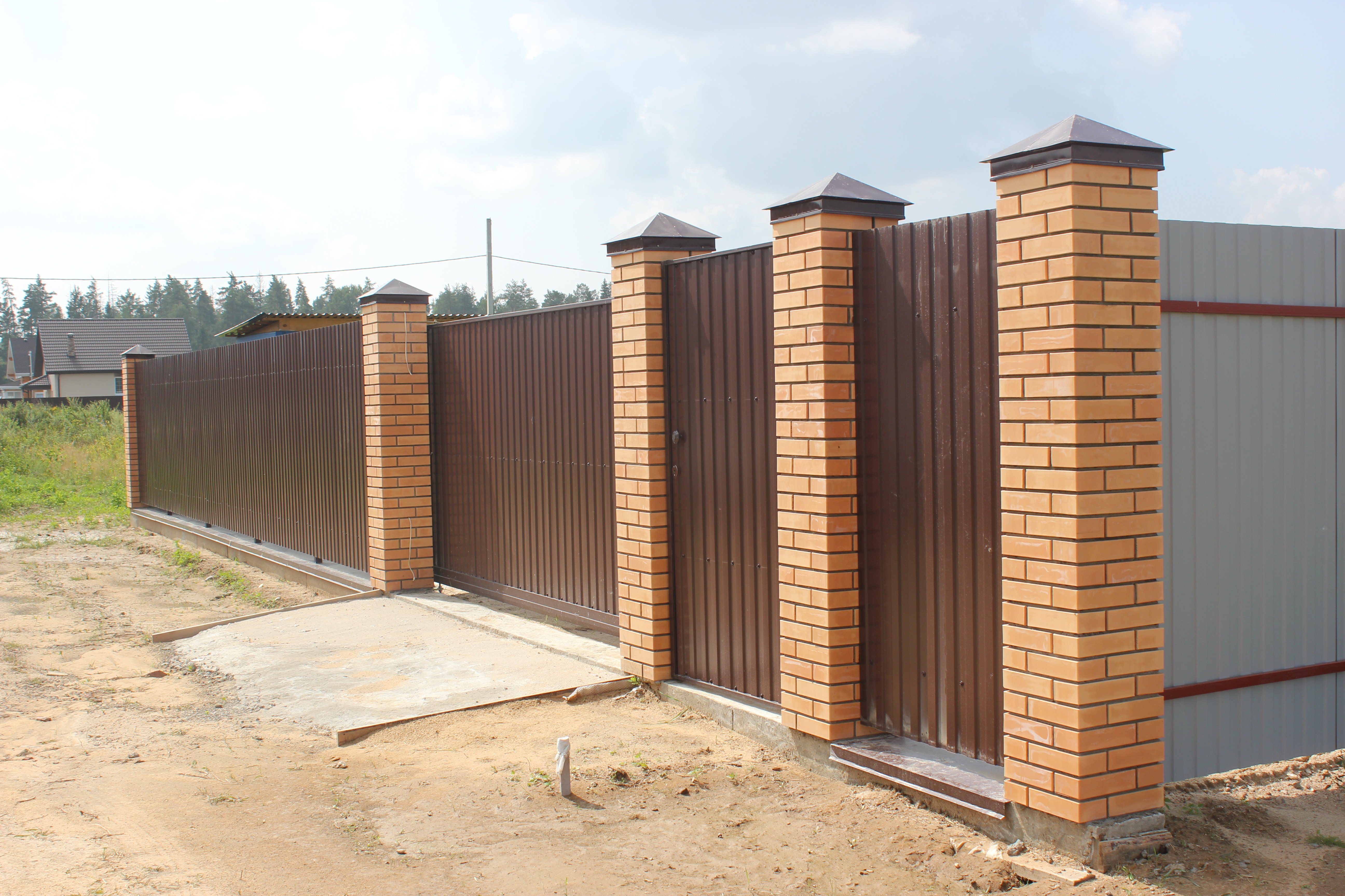 Забор из евроштакетника с воротами и калиткой с кирпичными столбами
