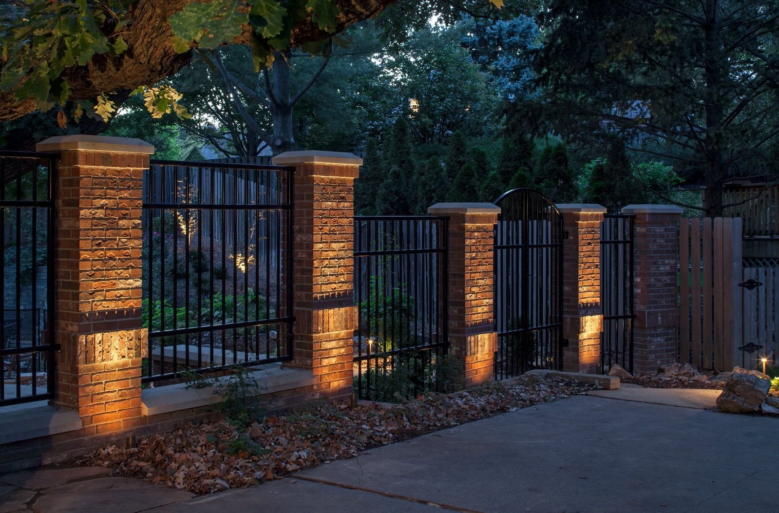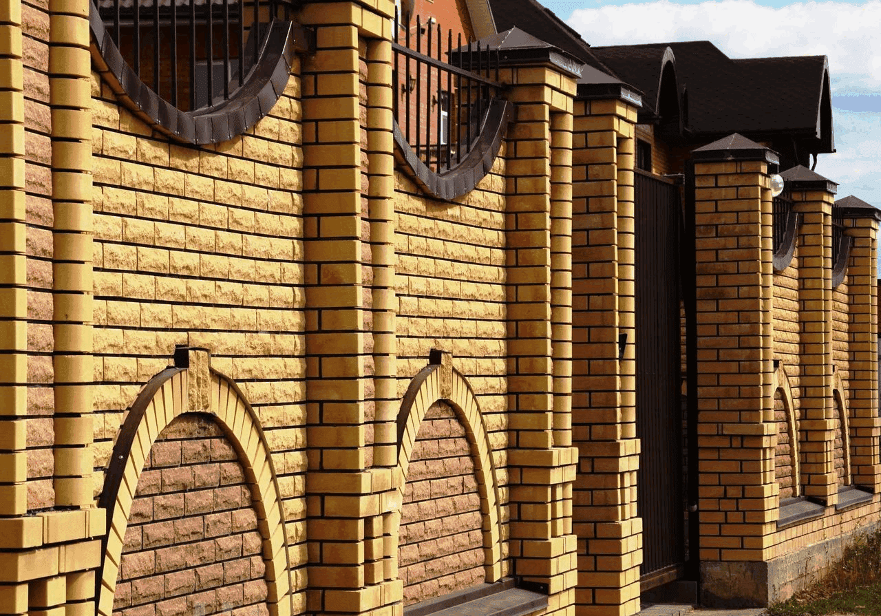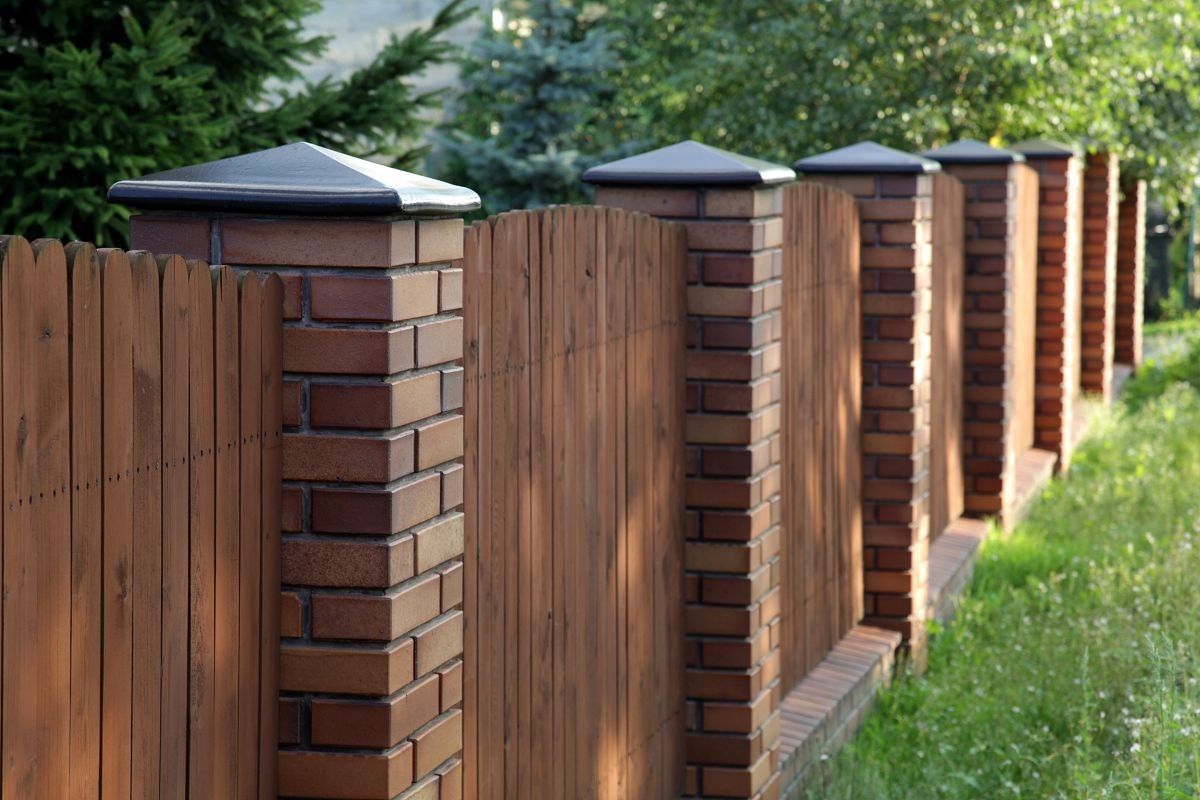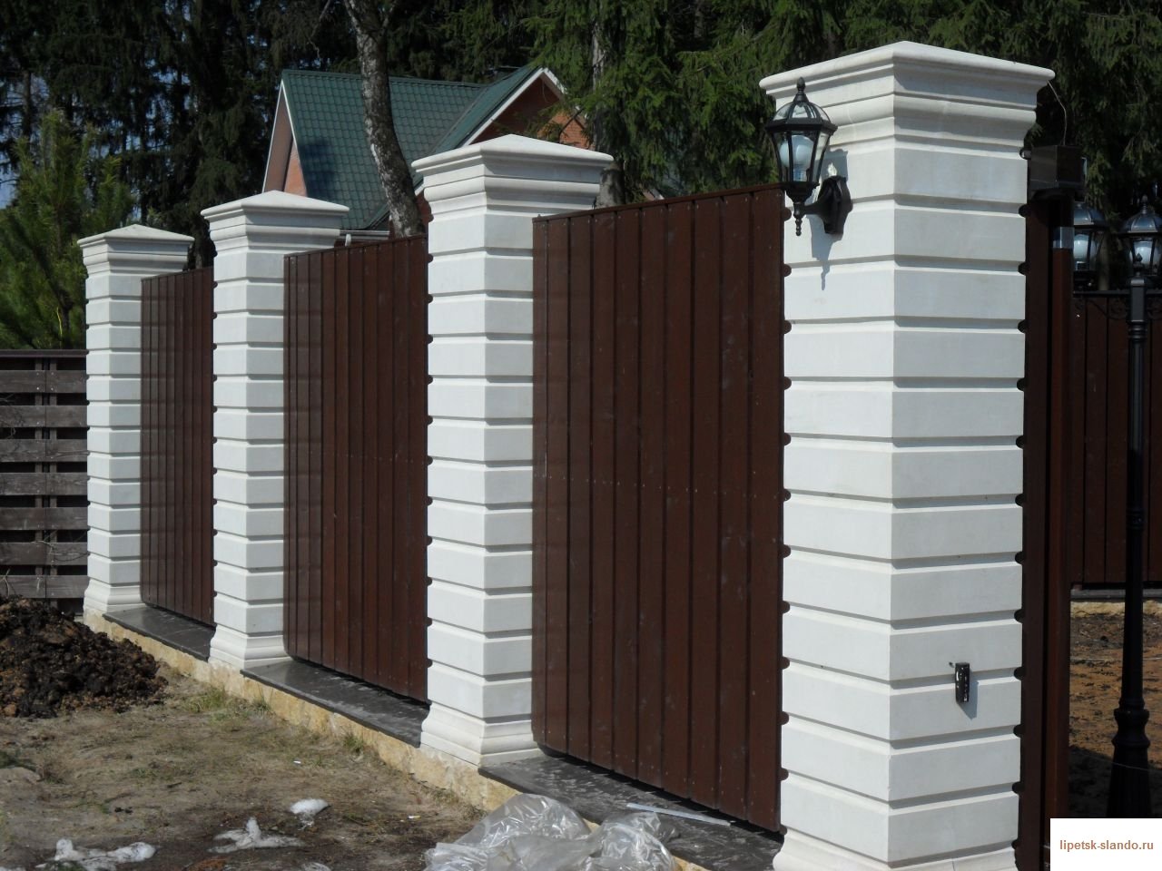 Забор из евроштакетника с воротами и калиткой с кирпичными столбами