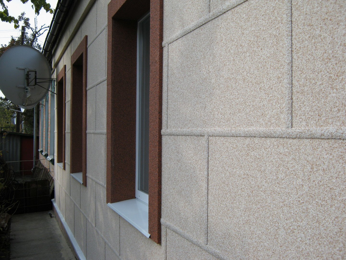 Фасад из мраморной крошки фото с белыми окнами