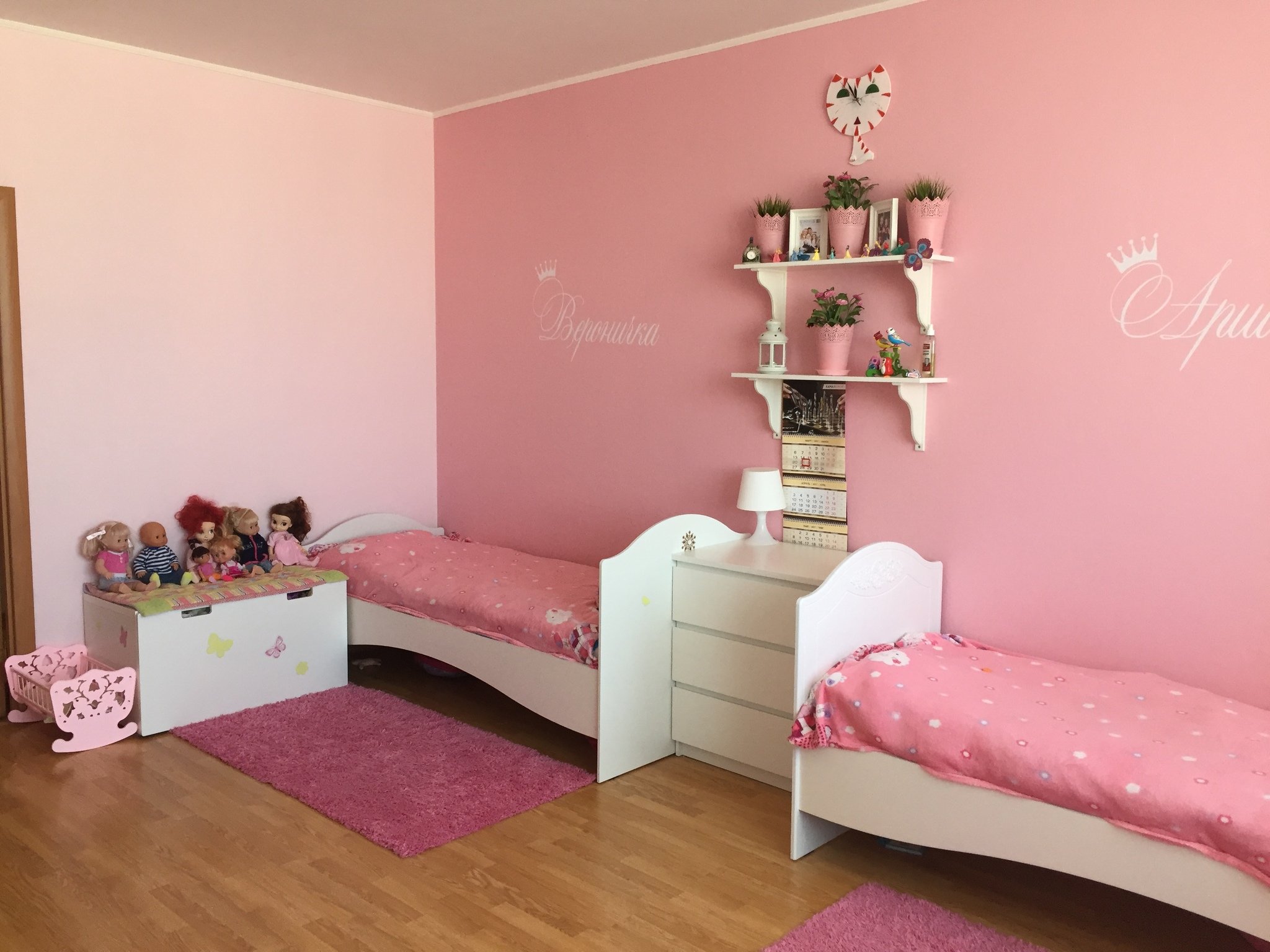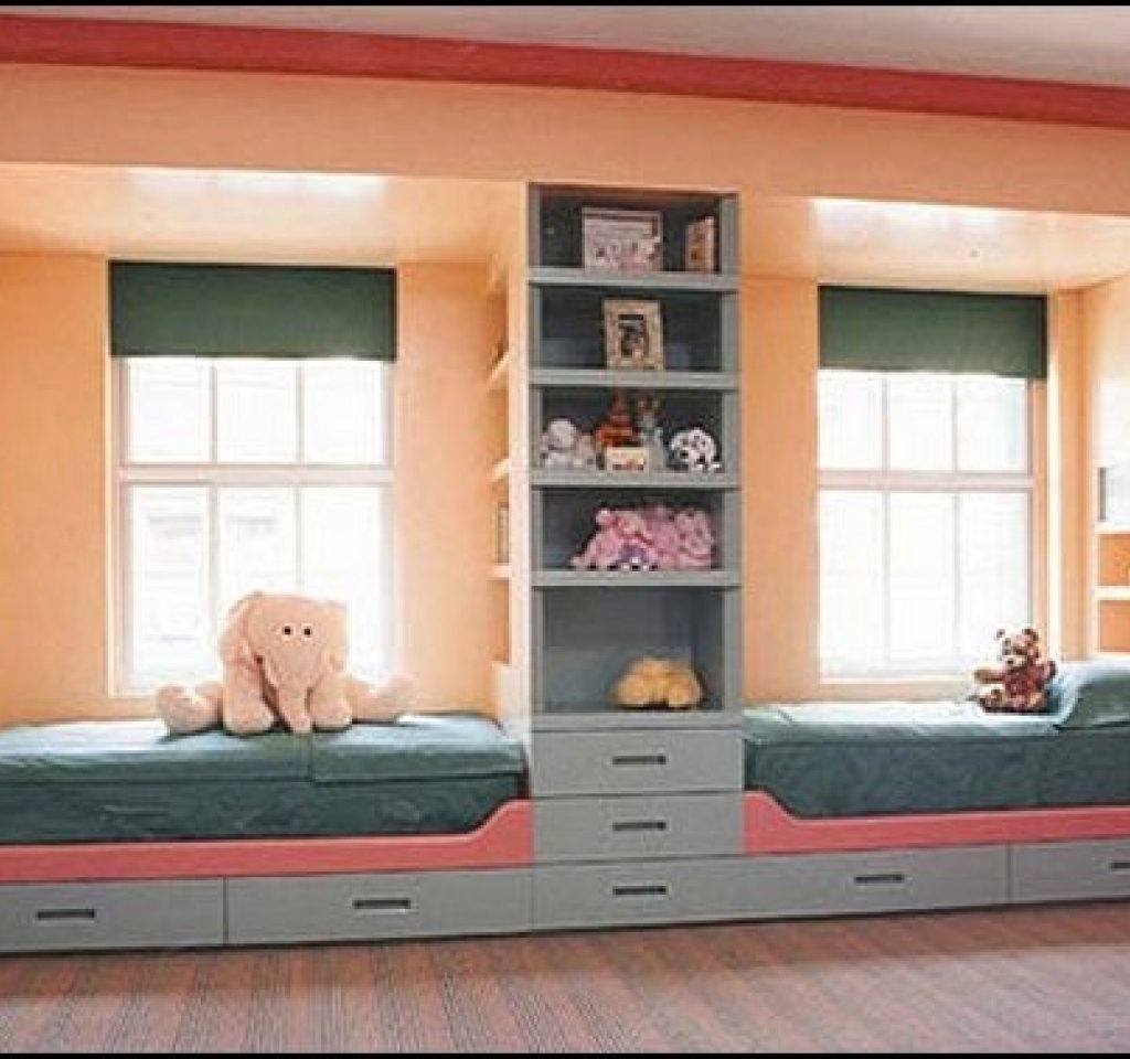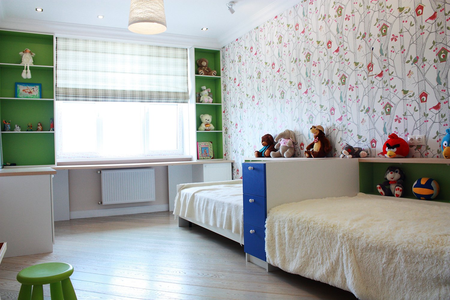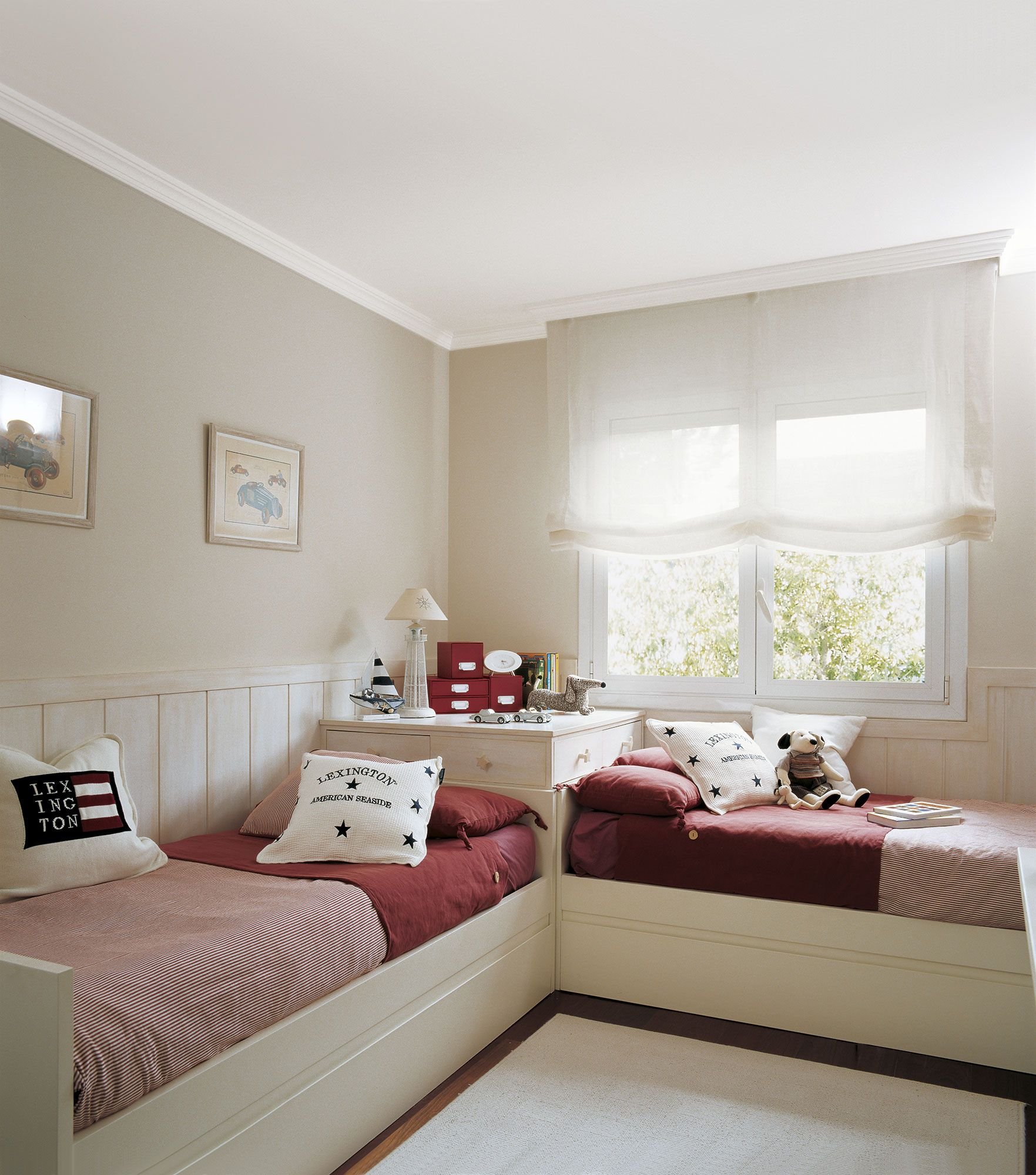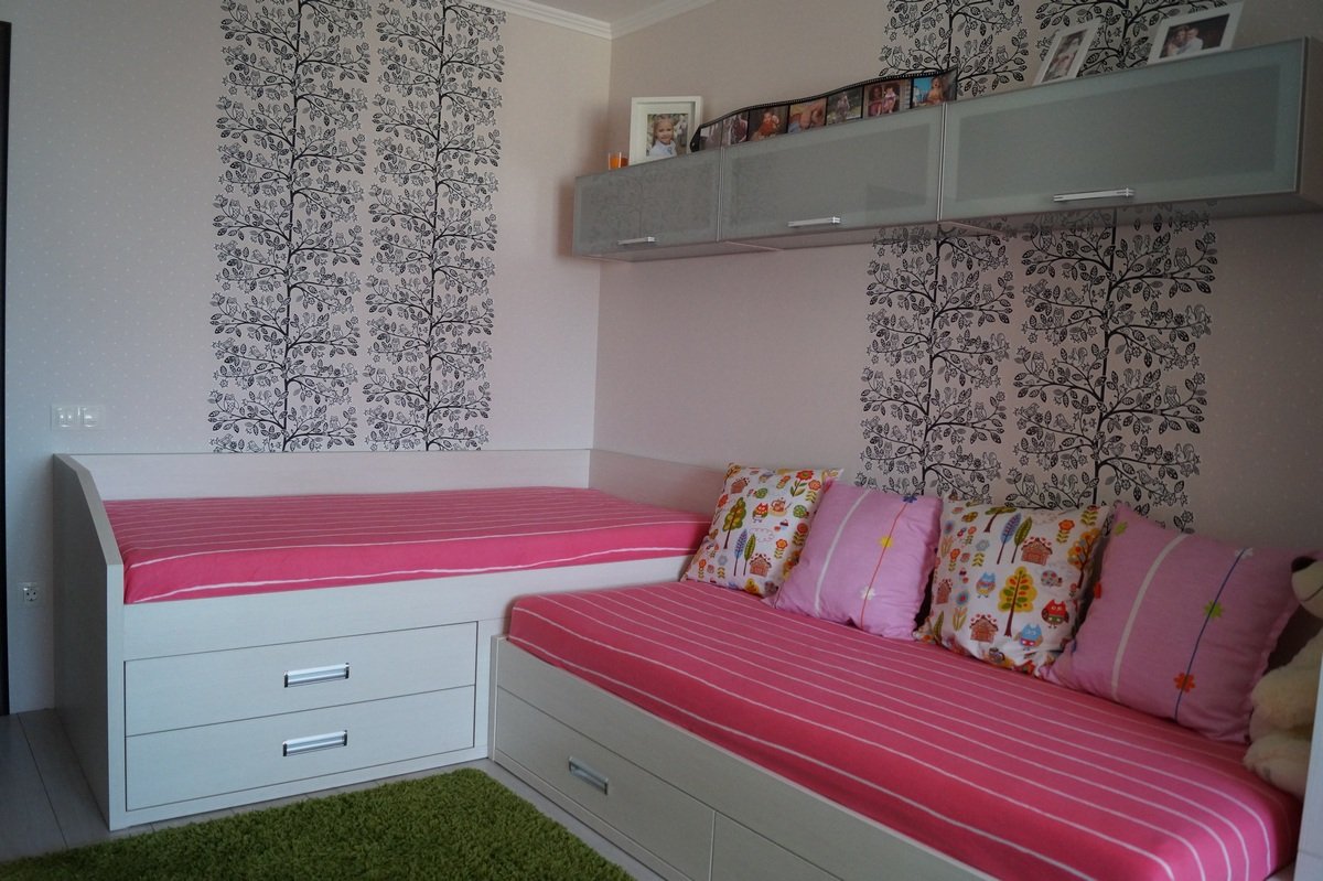 Детская с двумя кроватями вдоль одной стены в небольшой комнате