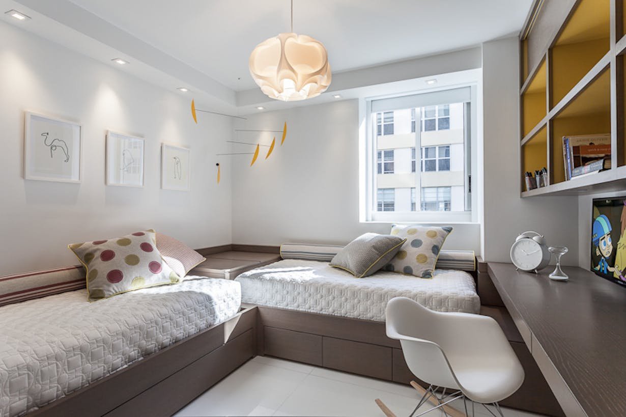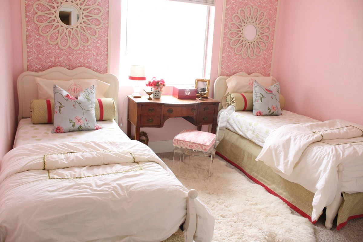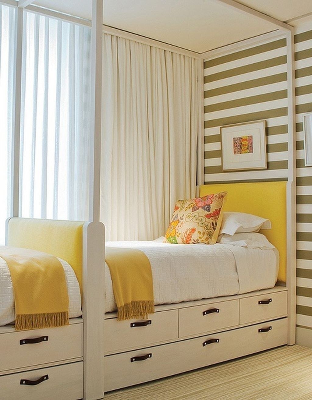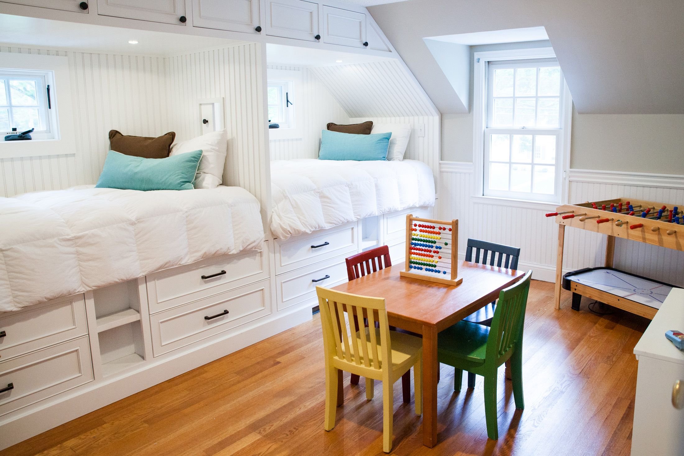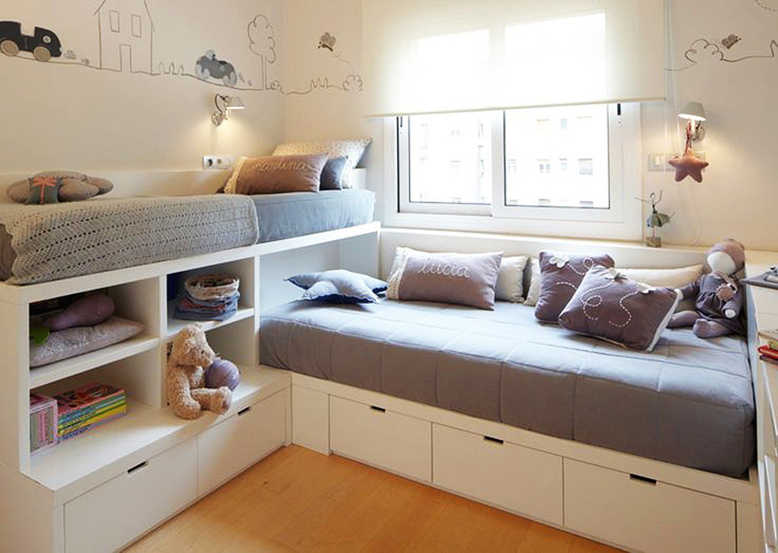 Детская с двумя кроватями вдоль одной стены в небольшой комнате
