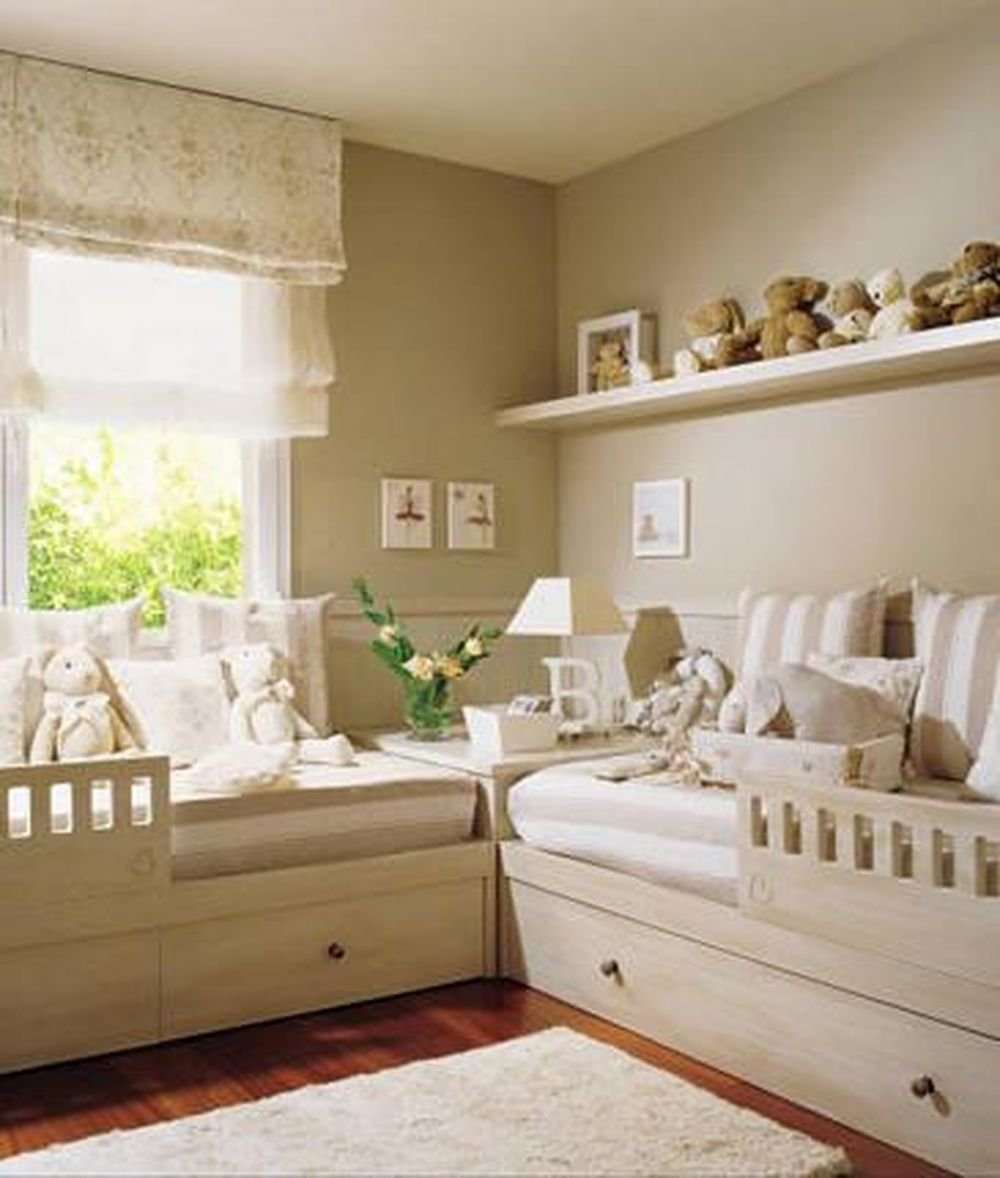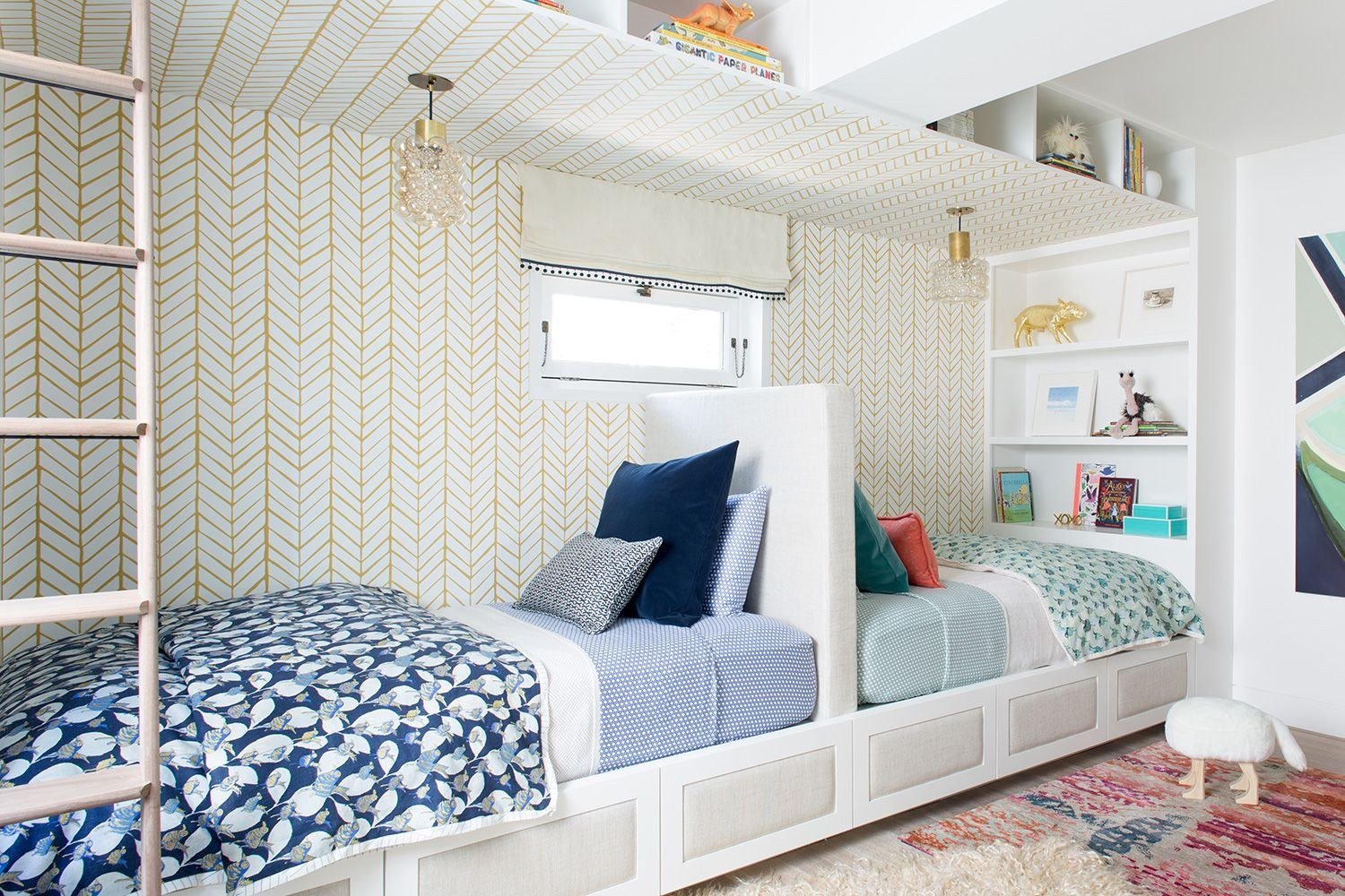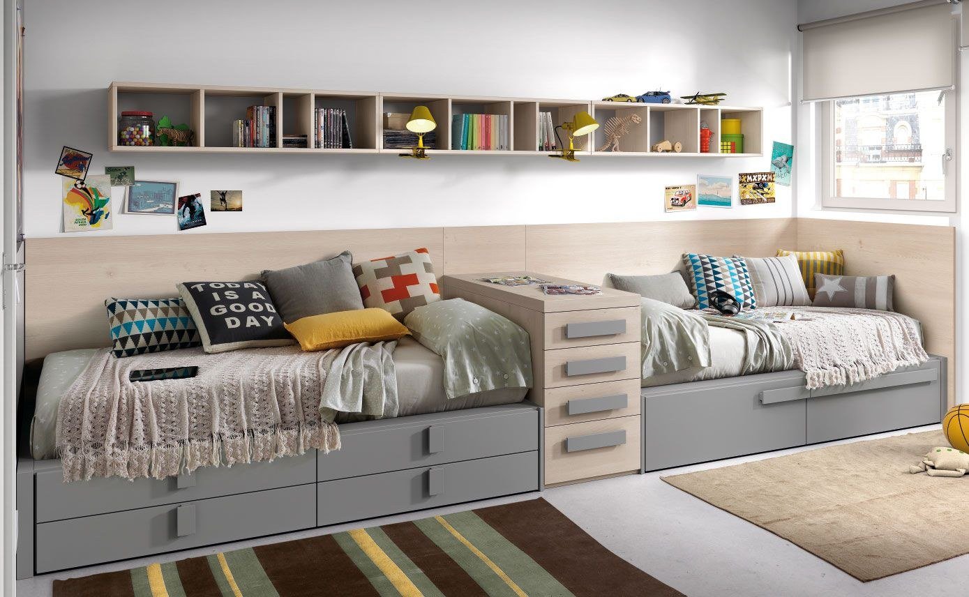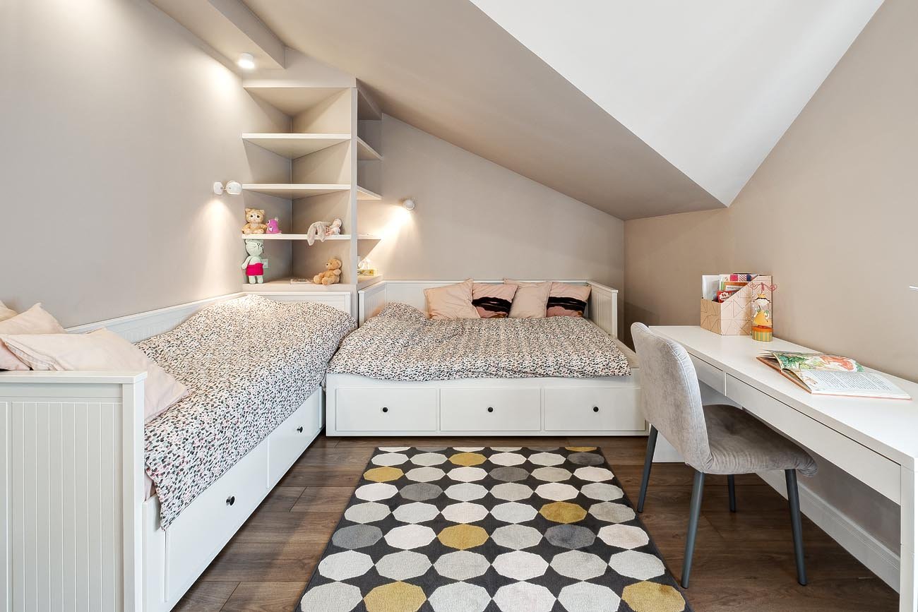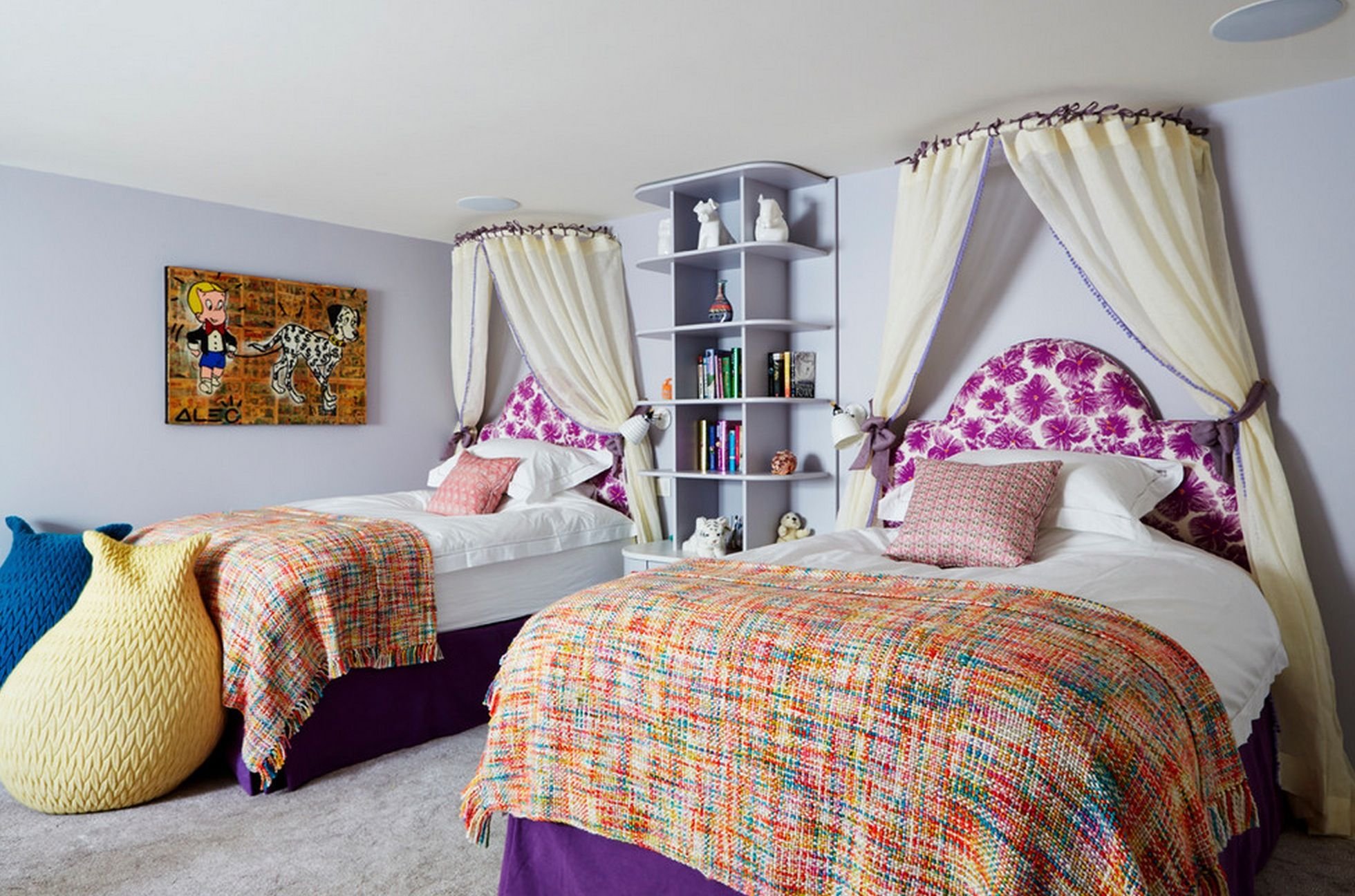 Детская с двумя кроватями вдоль одной стены в небольшой комнате