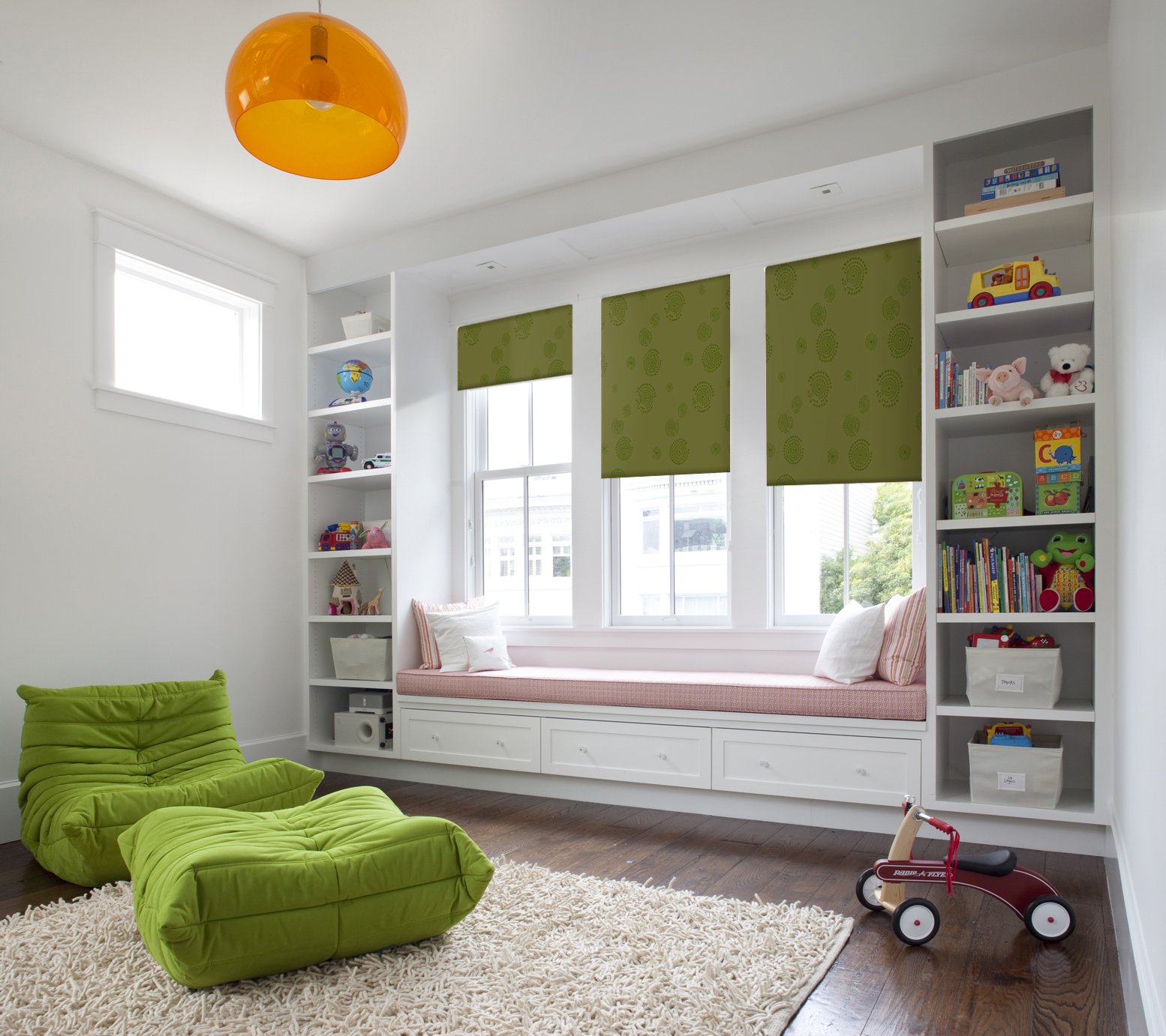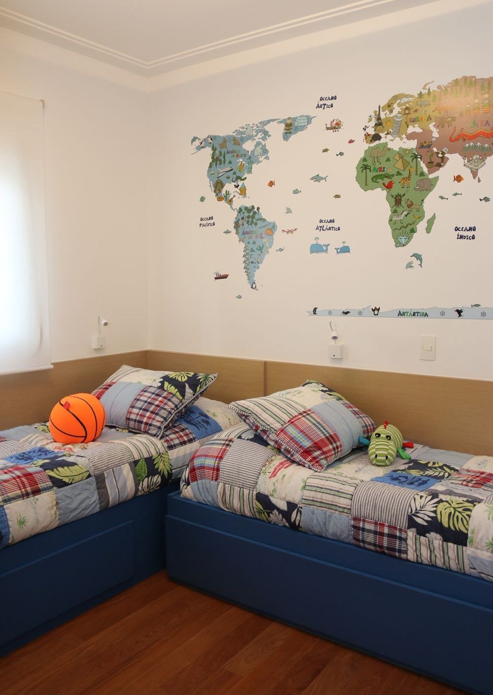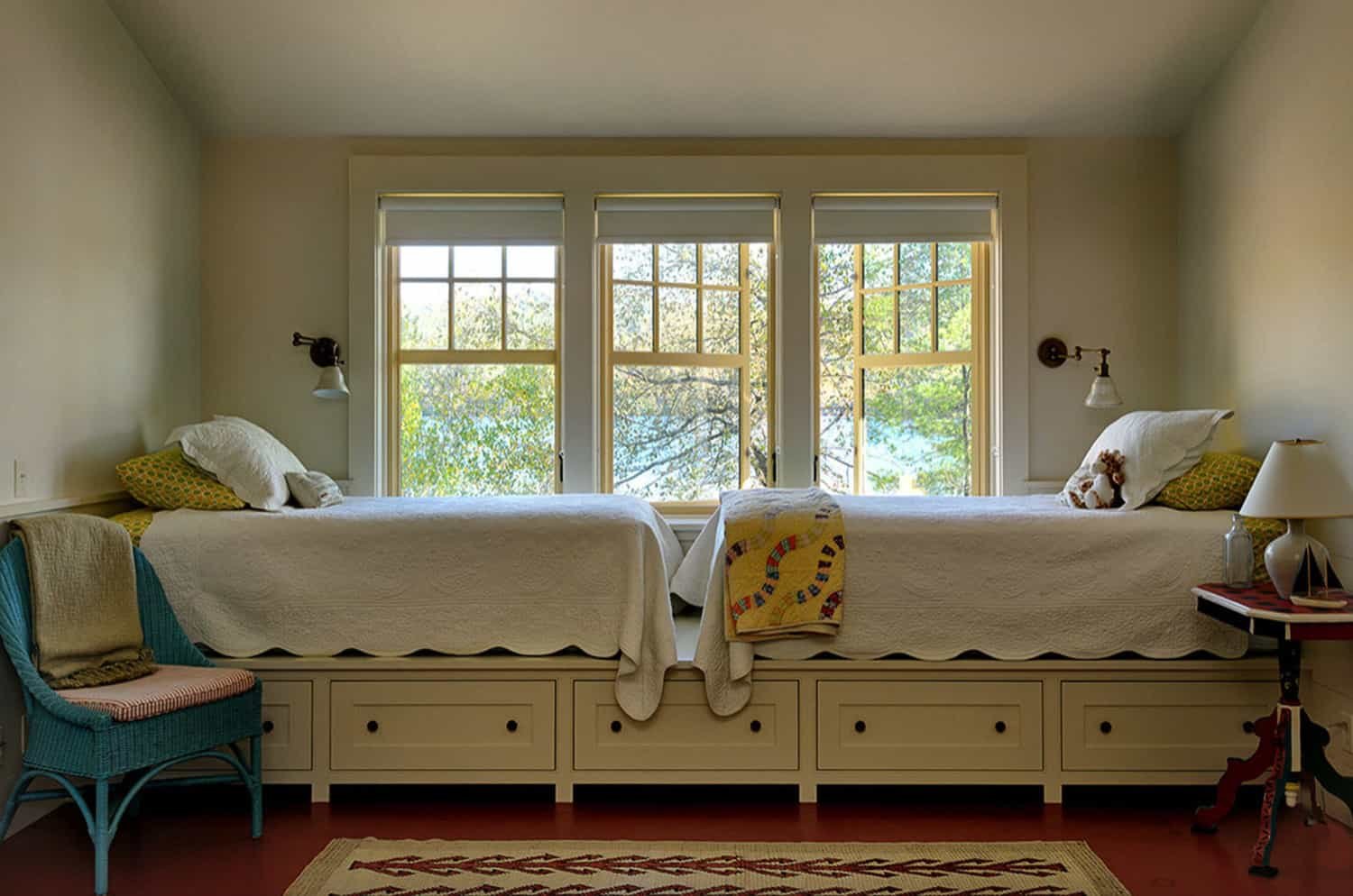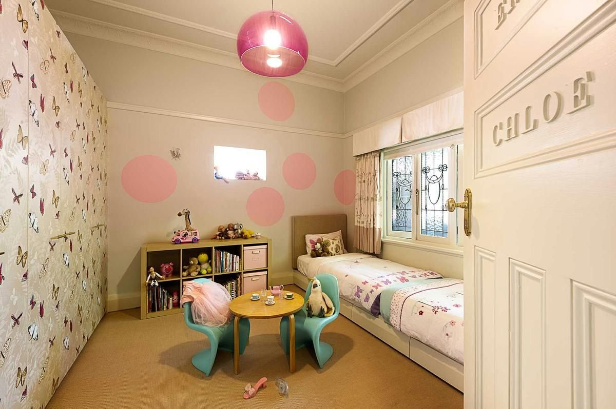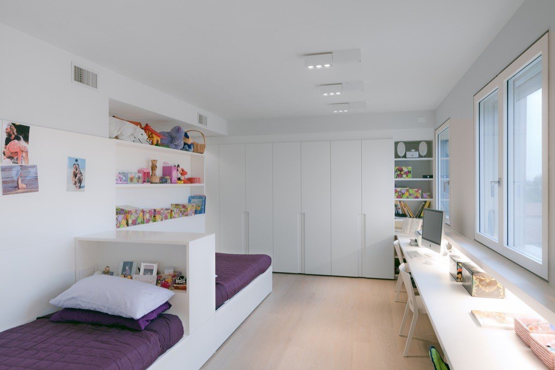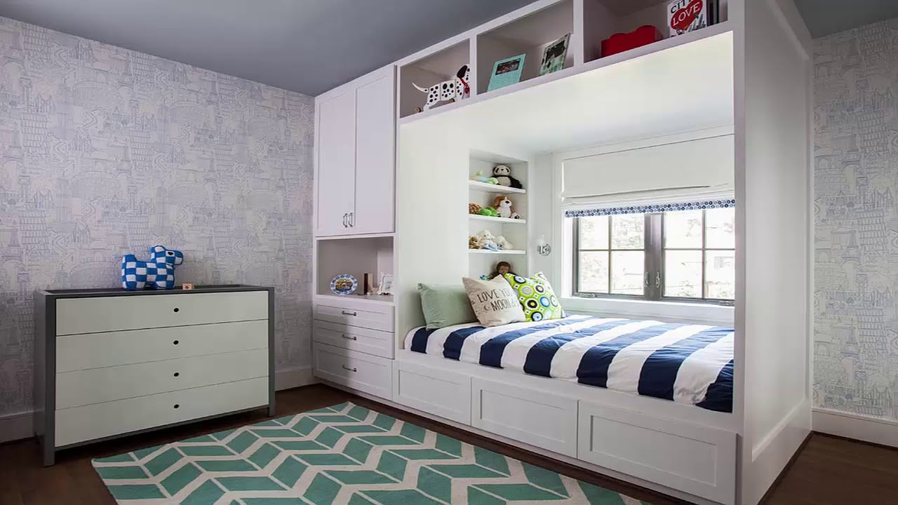Детская с двумя кроватями вдоль одной стены в небольшой комнате