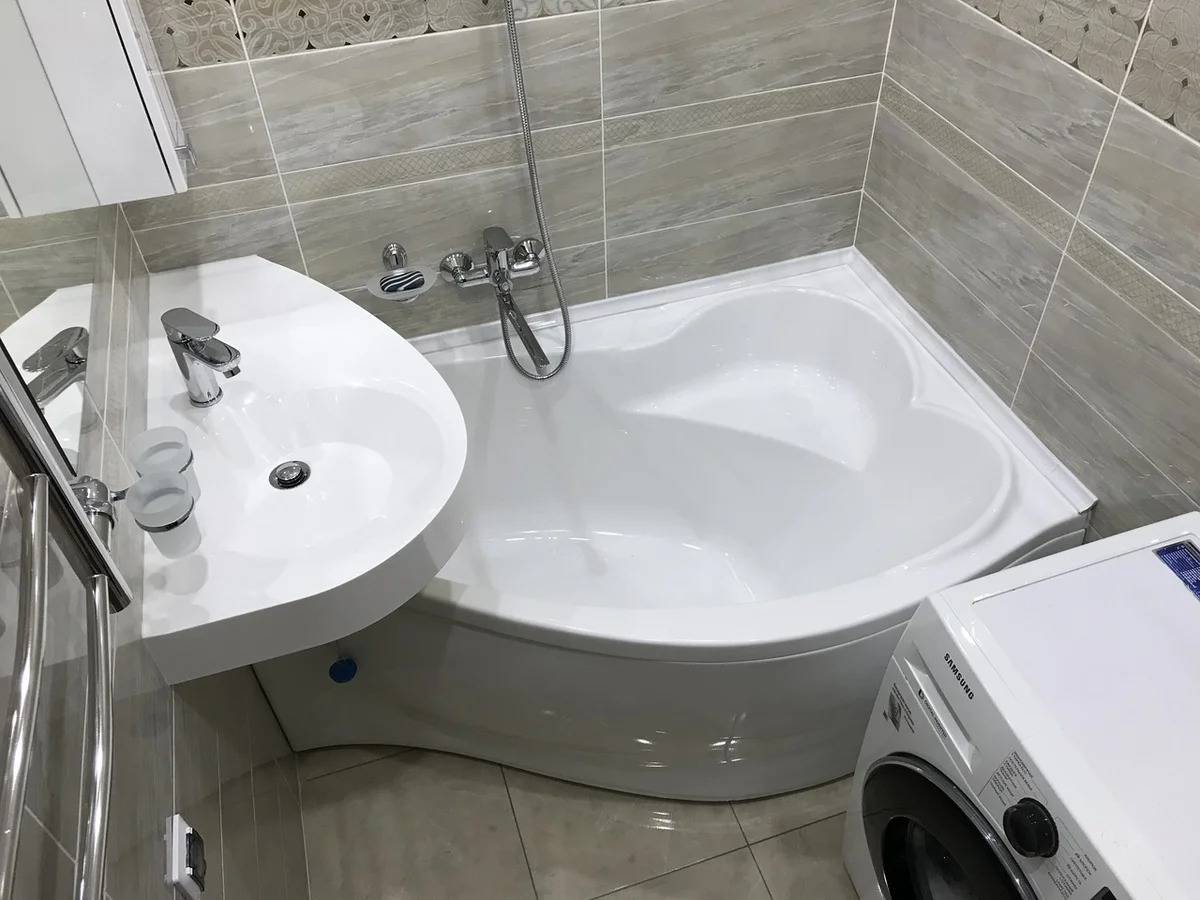 Ванная комната с угловой ванной и стиральной машиной