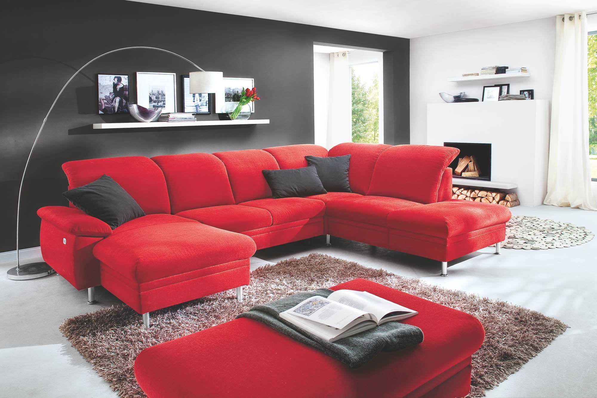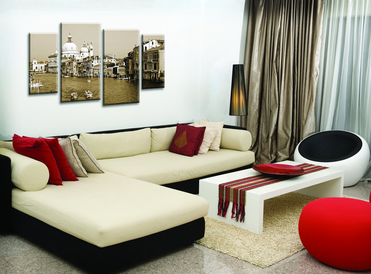 Красный диван в интерьере гостиной